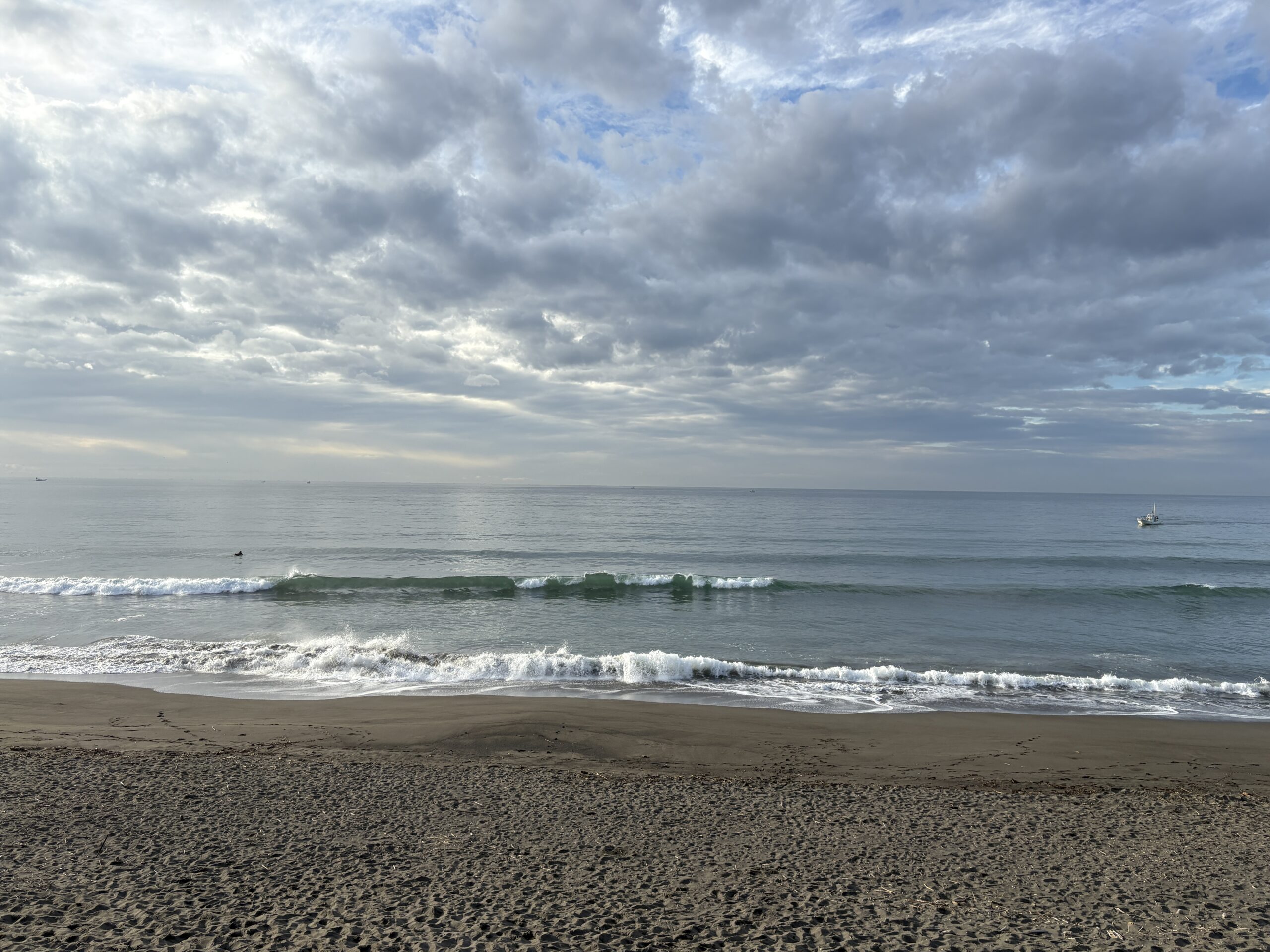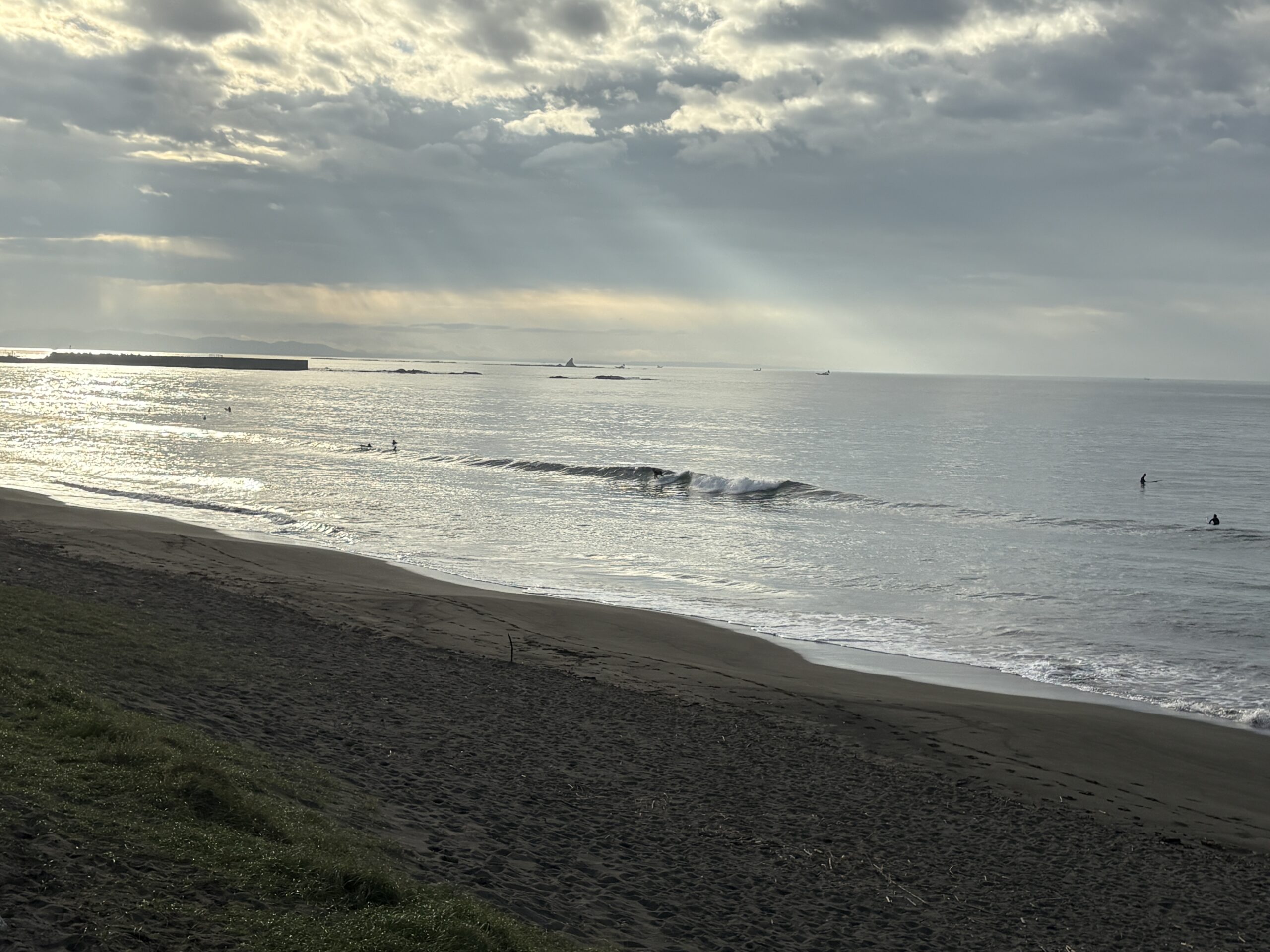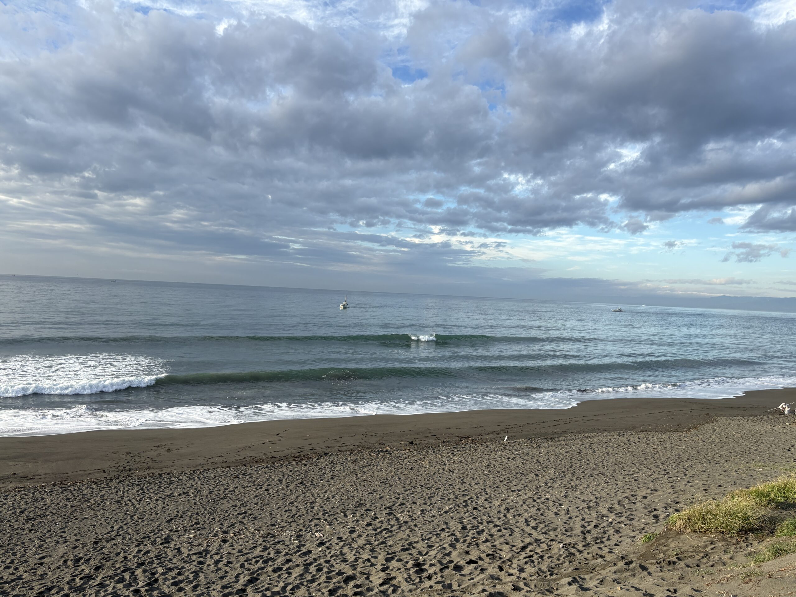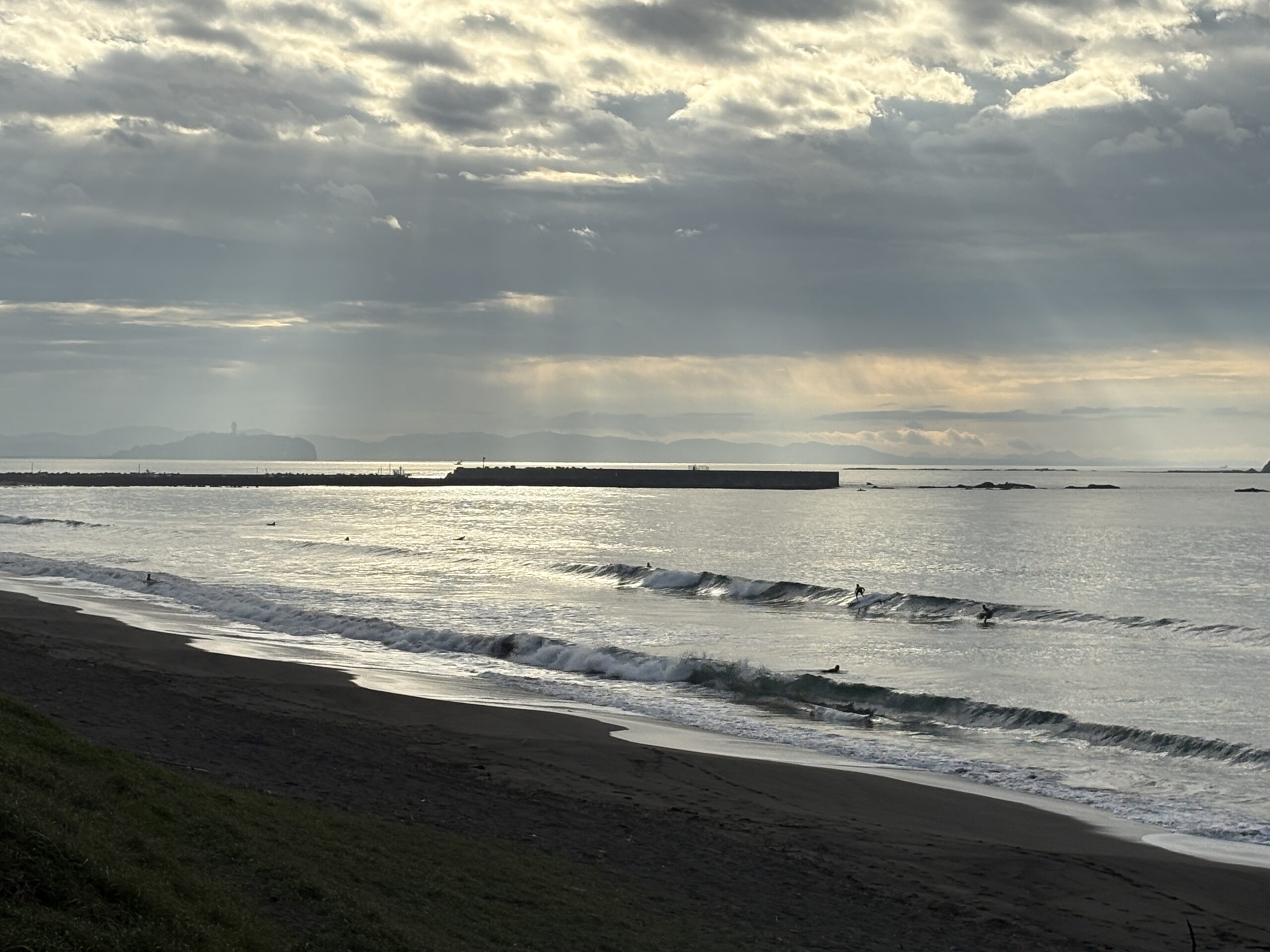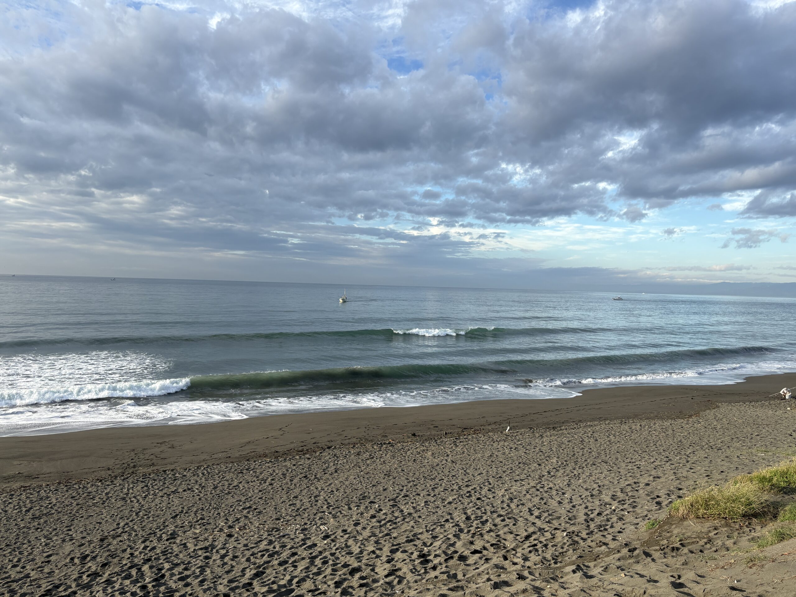 そして今朝の店前の海は、恐らく台風スウェルかと思われる筋張ったウネリが入って来ています。今現在、大潮周りの朝は潮が多い状態なので割れ辛く、セット間長めのたまに入るセットはモモから腰近くのしっかりしたウネリが入り岸寄りで辛うじてブレイクしています。 これから潮が引いて来るので次第に沖でブレイクし出すかと思われます?!