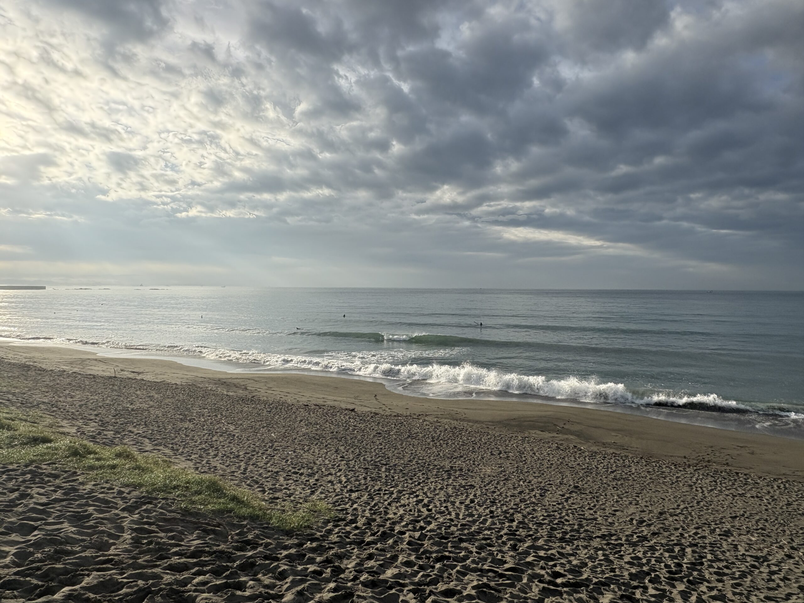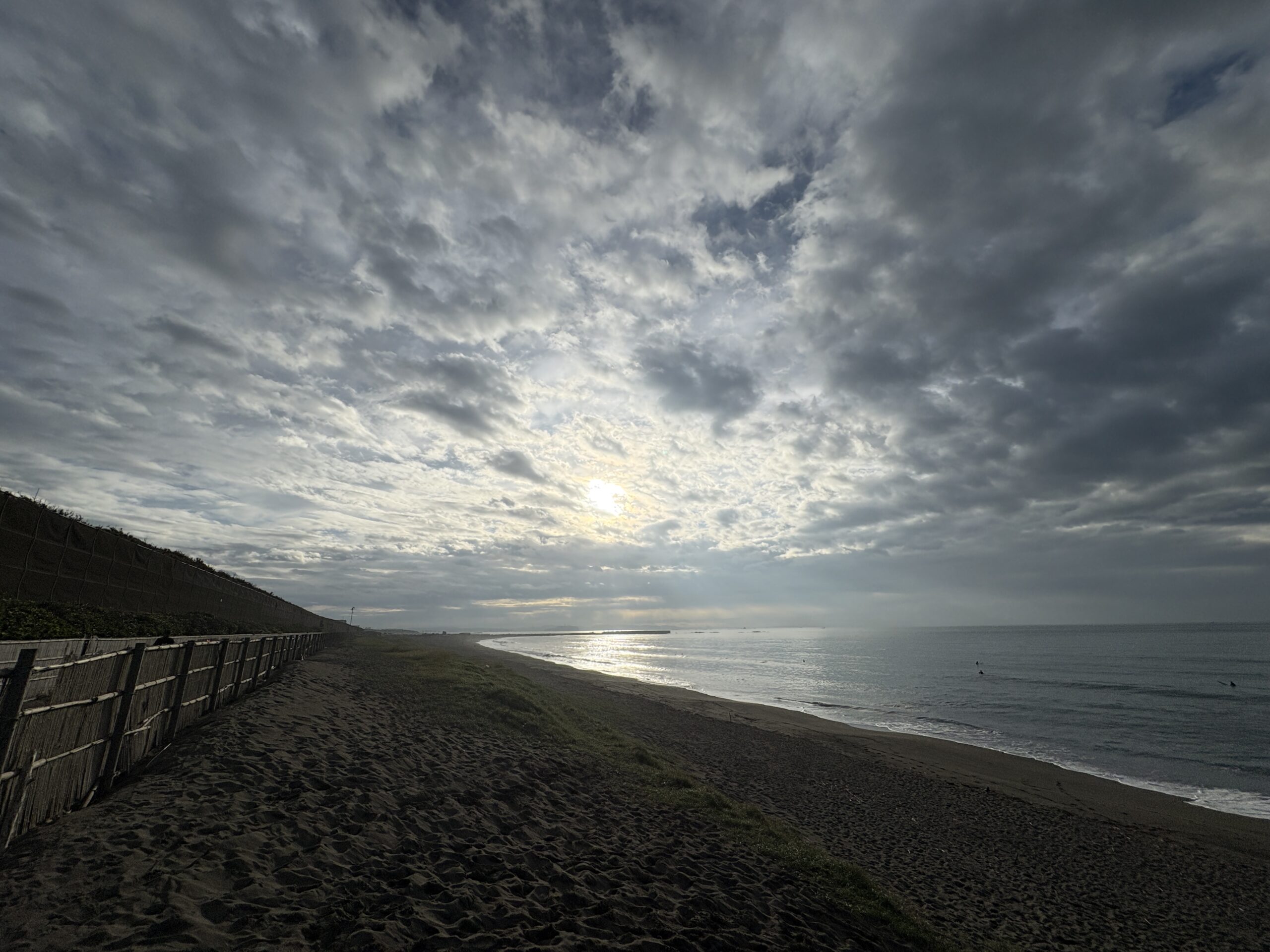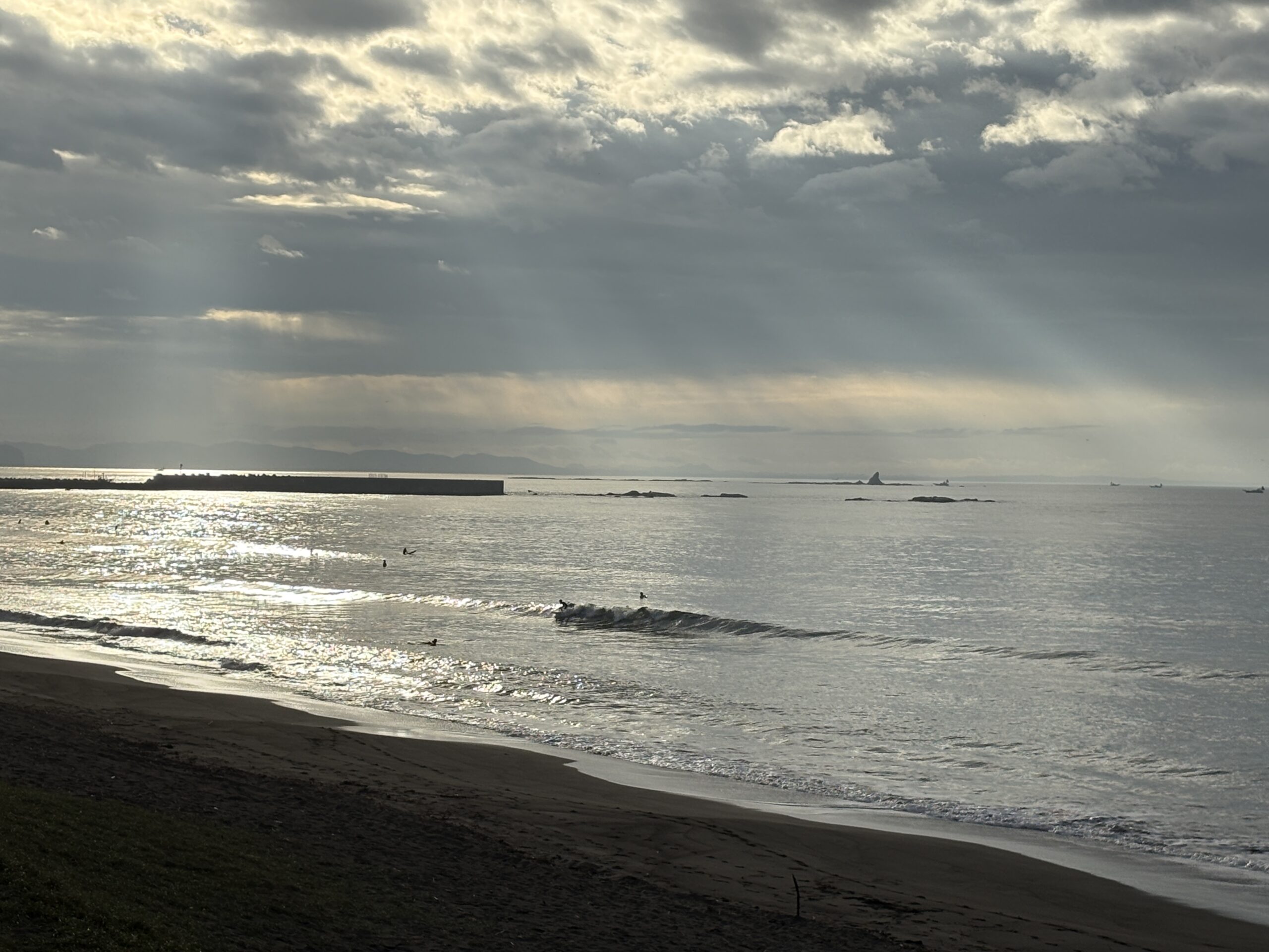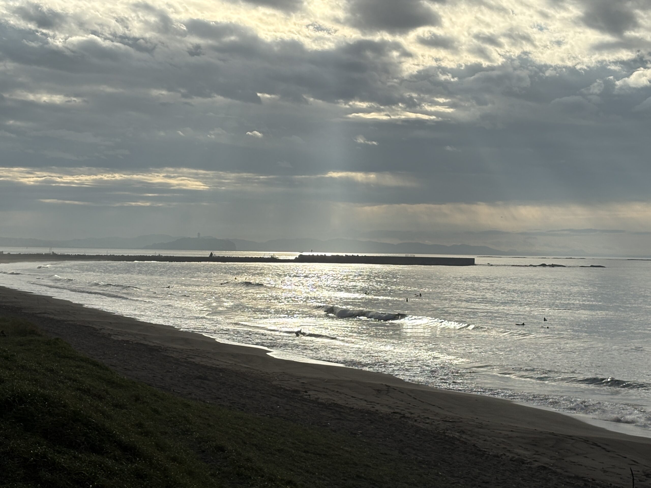 そして今朝の店前の海は、恐らく台風スウェルかと思われる筋張ったウネリが入って来ています。今現在、大潮周りの朝は潮が多い状態なので割れ辛く、セット間長めのたまに入るセットはモモから腰近くのしっかりしたウネリが入り岸寄りで辛うじてブレイクしています。 これから潮が引いて来るので次第に沖でブレイクし出すかと思われます?!