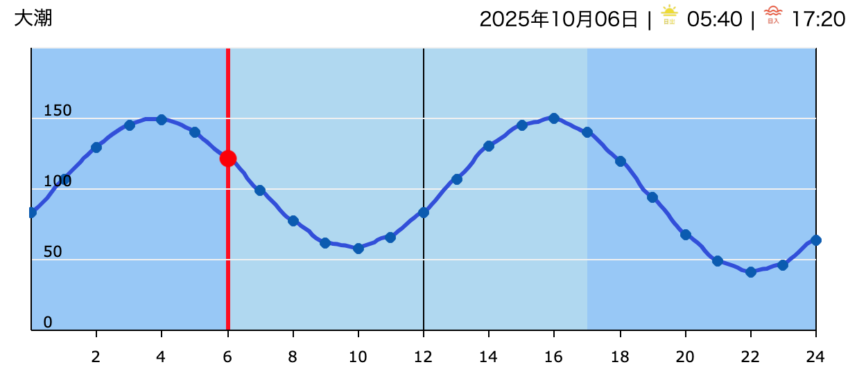 本日のタイドグラフ。風は終日北東の風が吹く予想なので、海面は荒れず保たれそうです?!