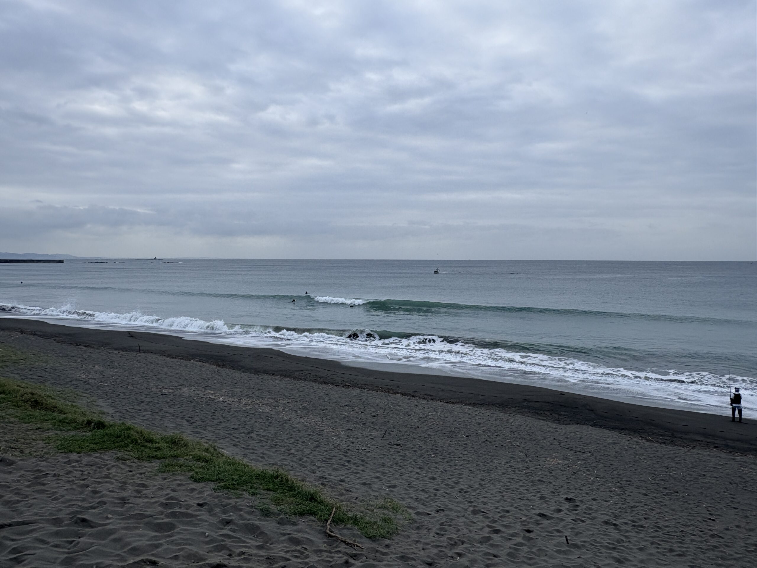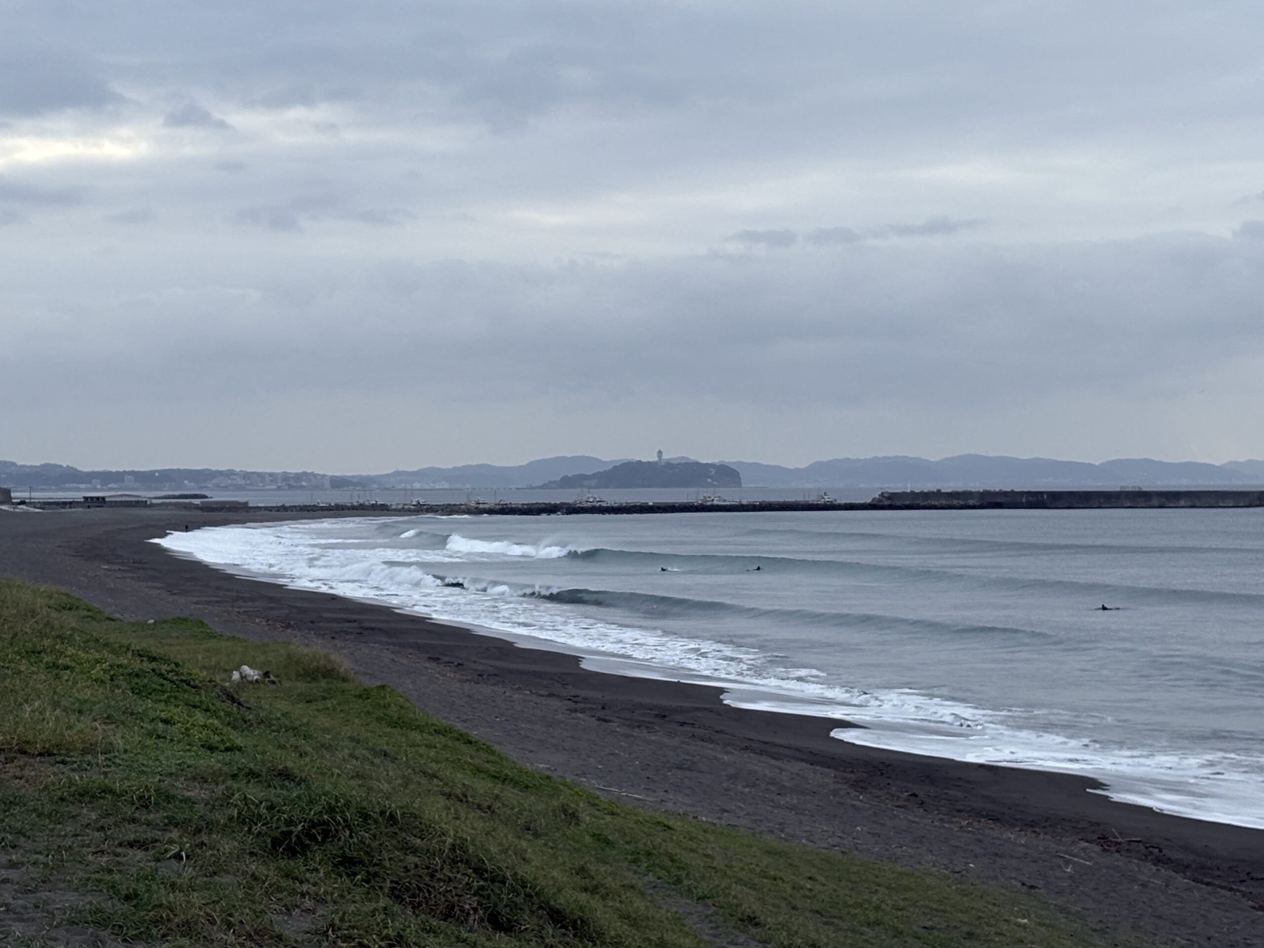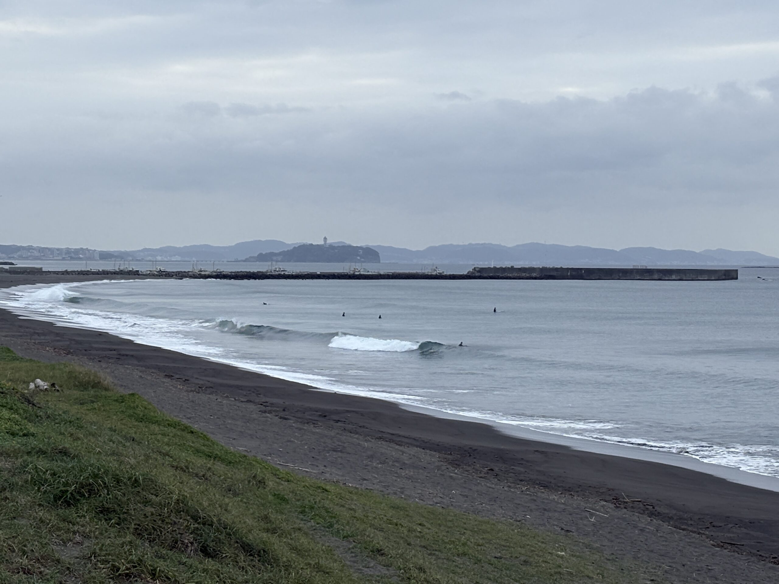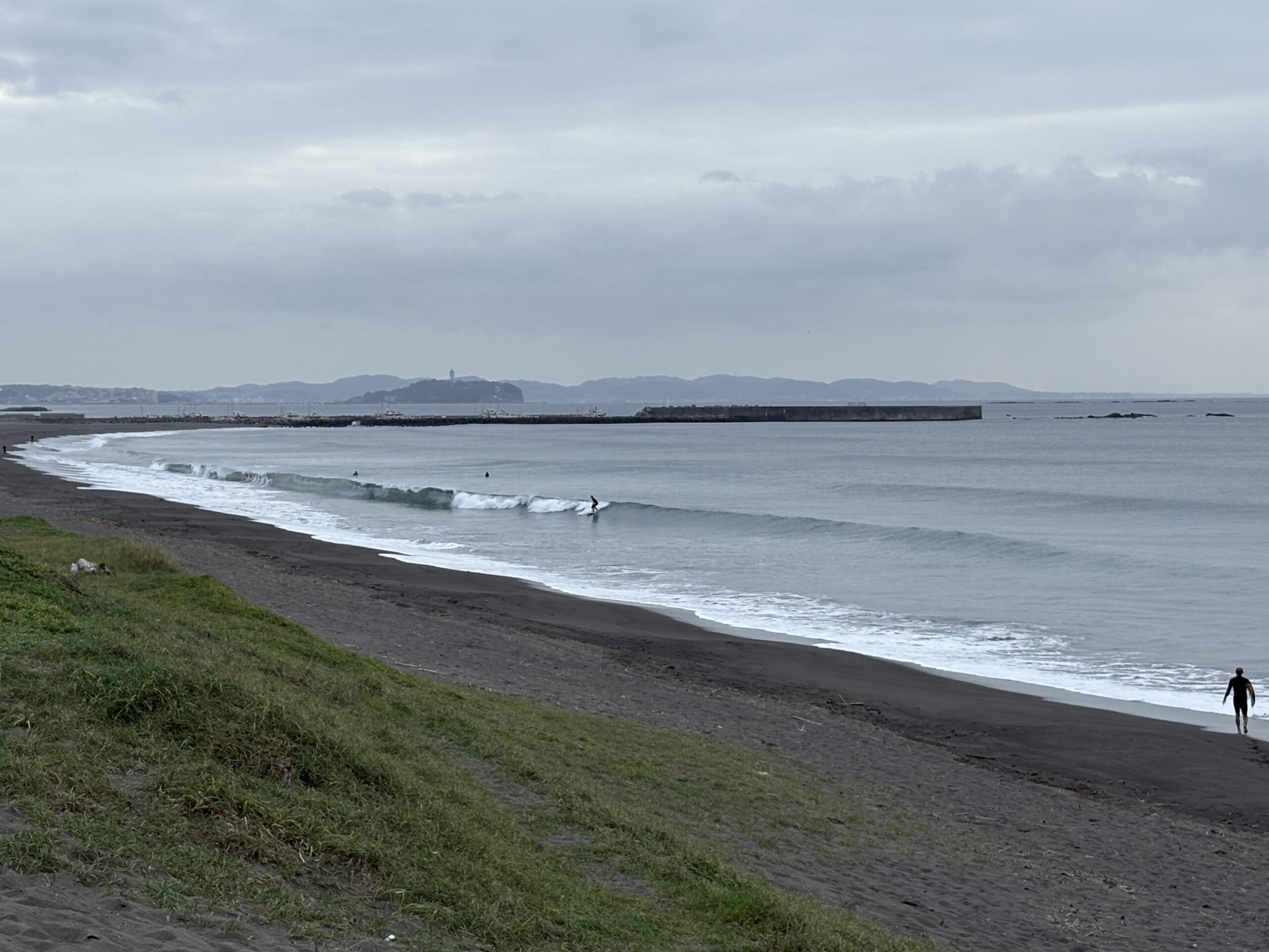 今日の天気は曇りの予報。今朝は曇り空の緩い北風が吹き肌寒い朝です。海は、台風22号がここ相模湾沖の南海上に位置し、今日からようやくウネリが入りつつあります。