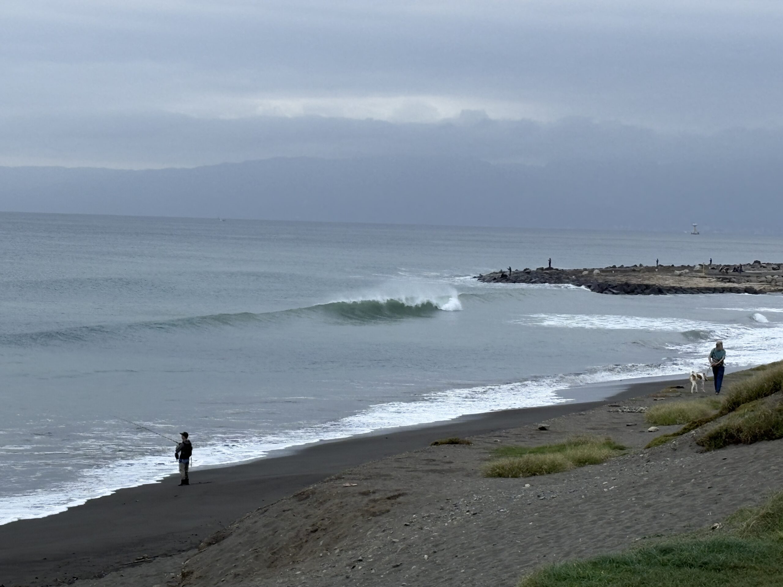 但し、関東まで伸びている前線に寄り北東風が吹いている為、ウネリもブロックされている感も有り、セット間長めで最大セットは何とかインサイド寄りでブレイクしています。また、大潮周りなので朝は潮も上げており、これから次第に潮が引いてくれば沖でブレイクし出すかと思われます?!