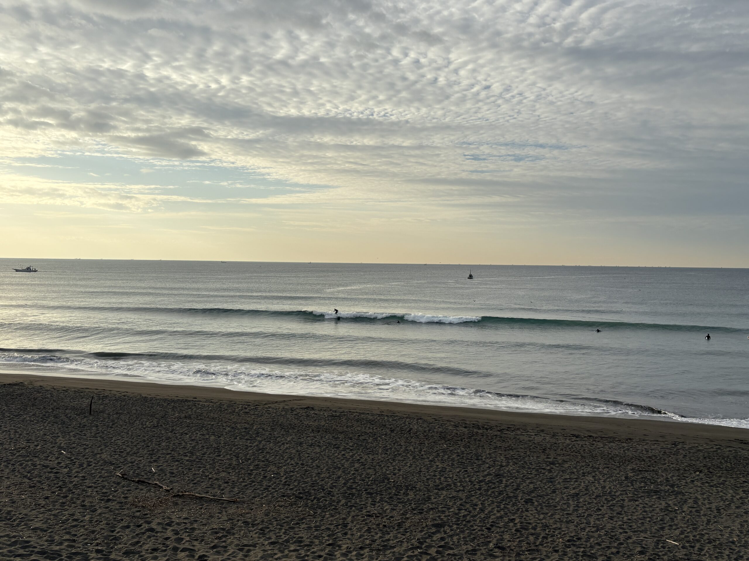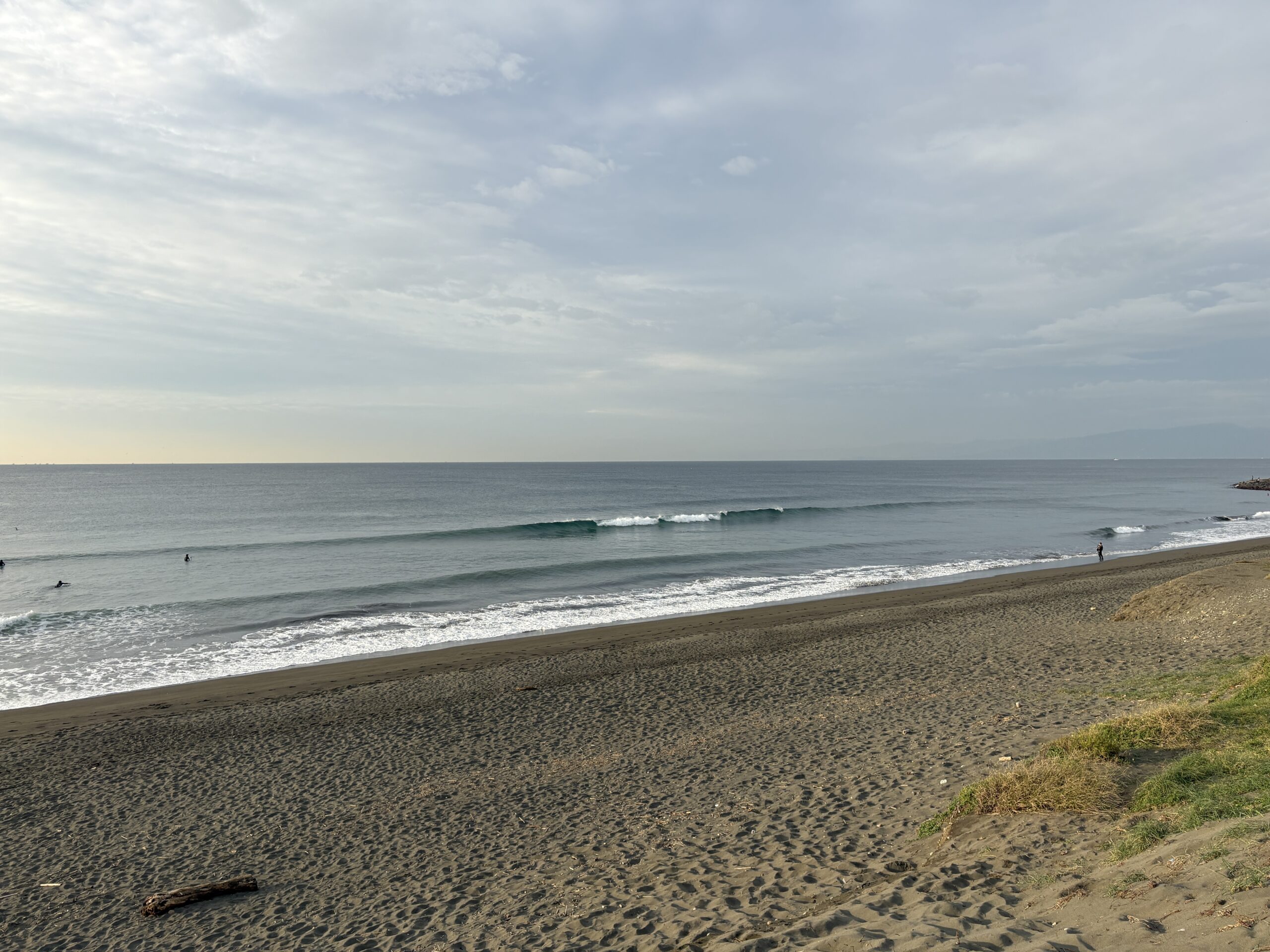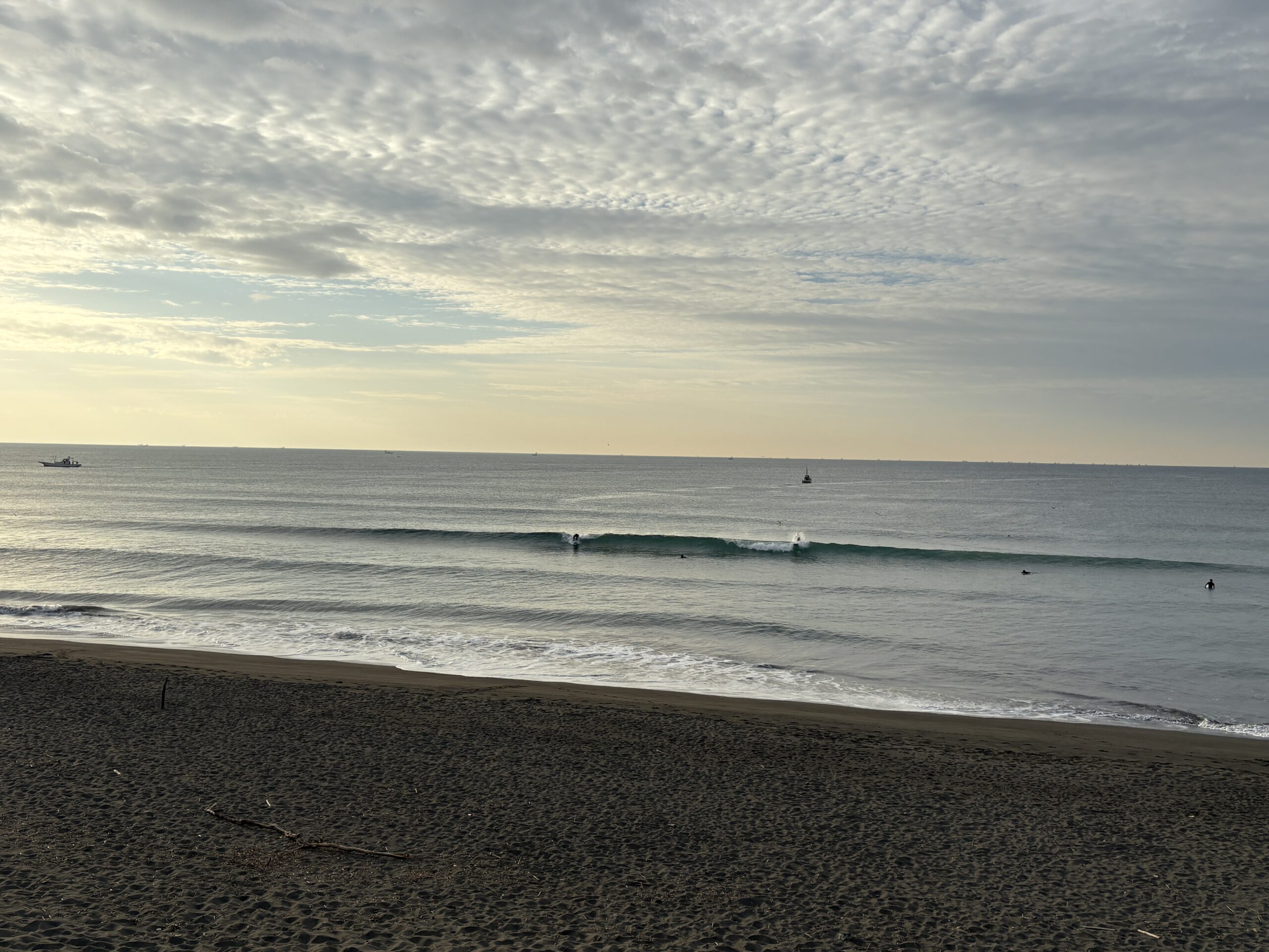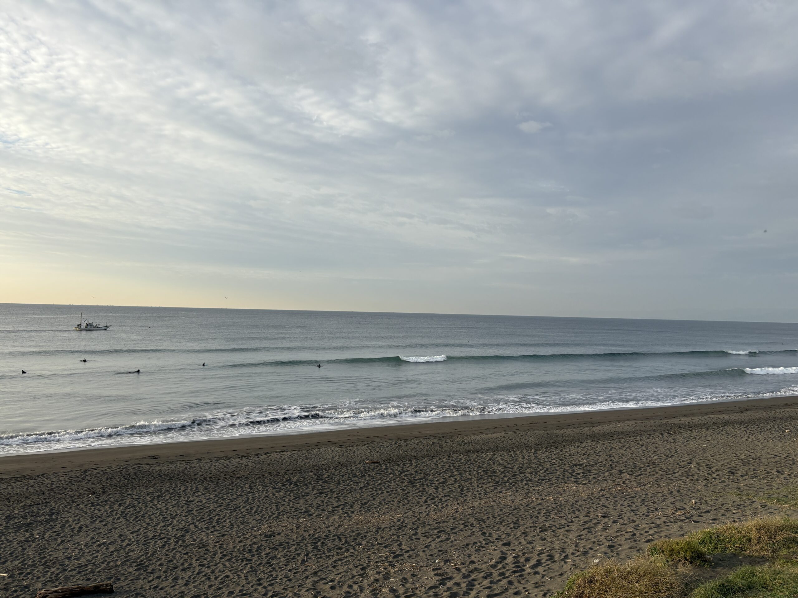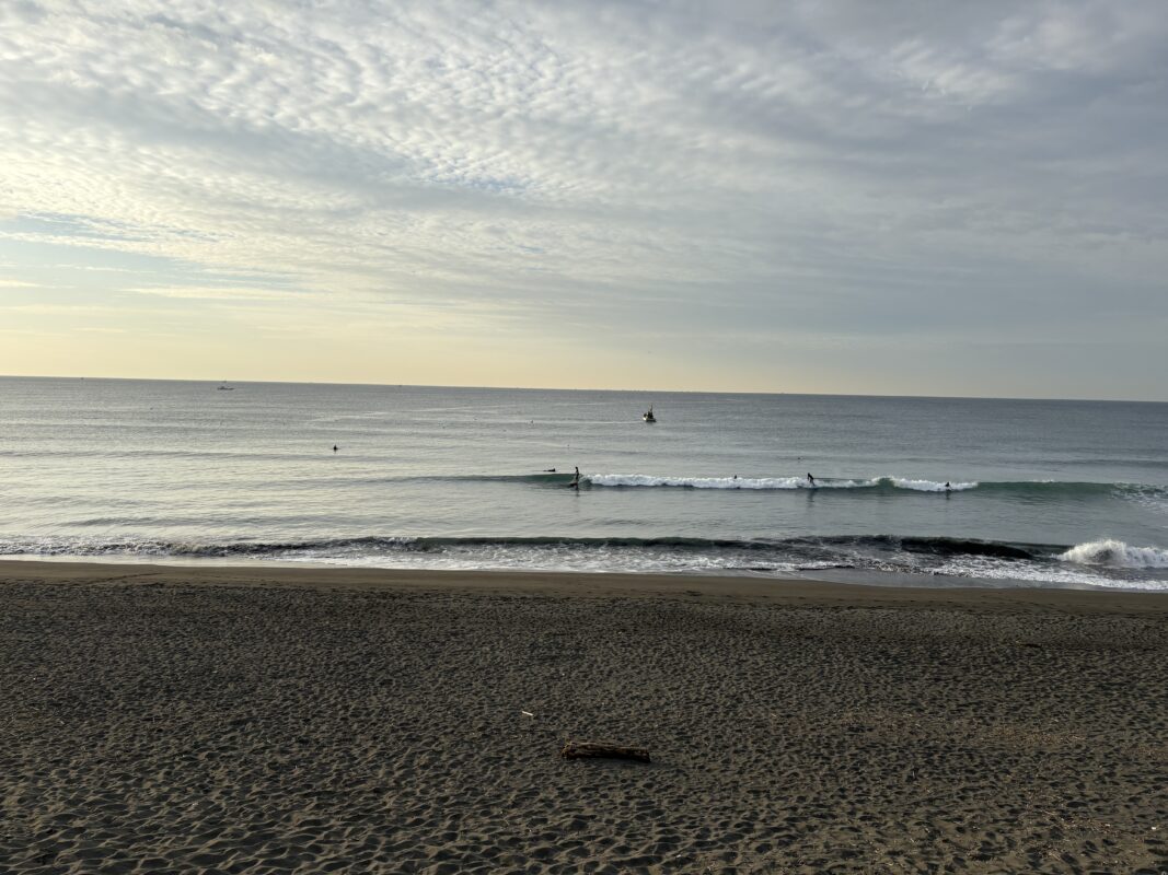 今日の天気は曇りのち雨の予報。今朝は一瞬朝日が出ましたが直ぐに雲に隠れてしまいました。そして今夜から明日午前に掛け全線を伴った低気圧が発達しながら日本列島を東に通過する予想なので、これから下り坂の天気になりそうです。 海は現在、無風のクリーンコンディションで、今日は筋張ったモモ前後のウネリが久々に入り、朝のうちは潮が引いているので形いい波が何とかブレイクしています。