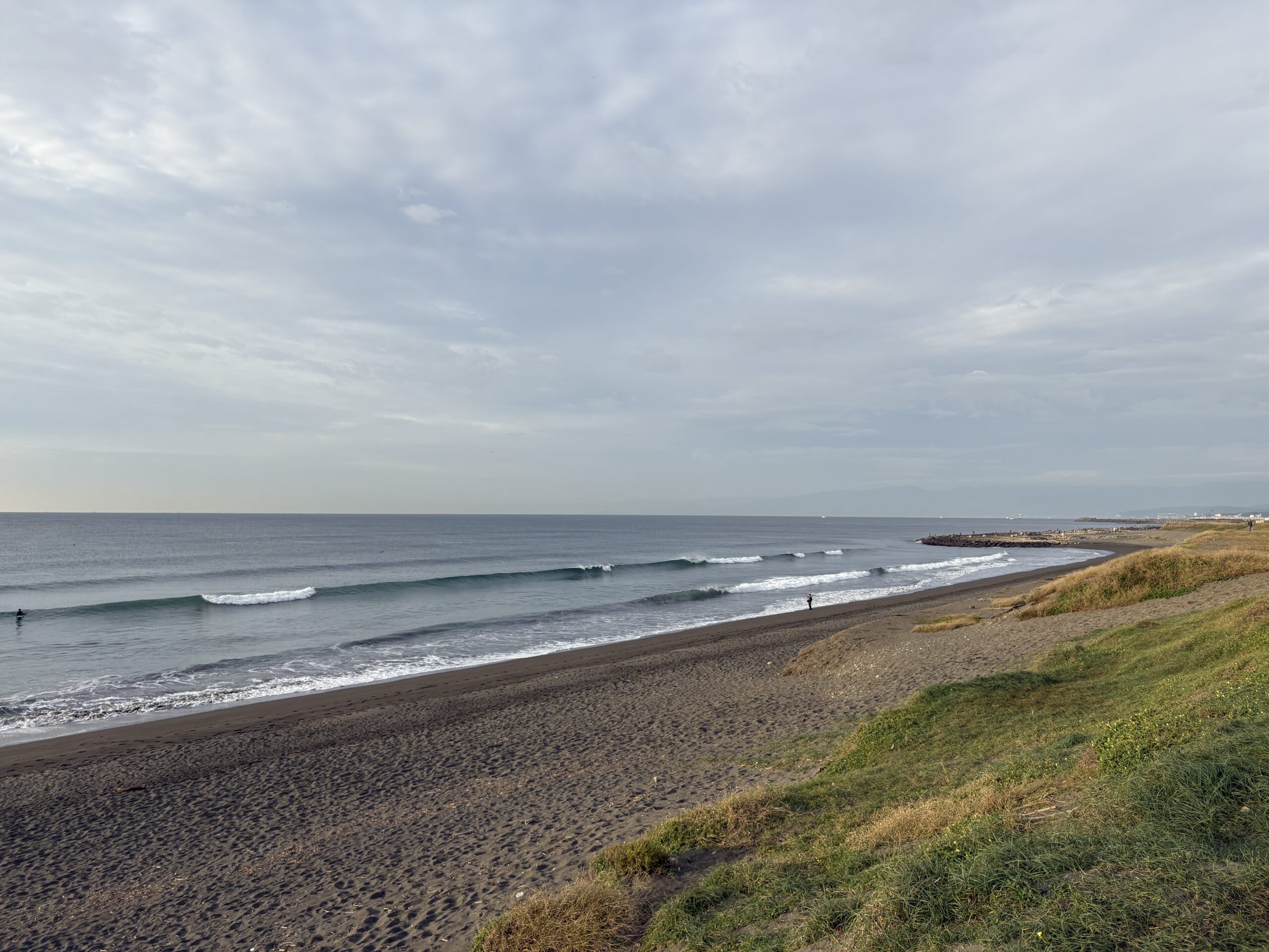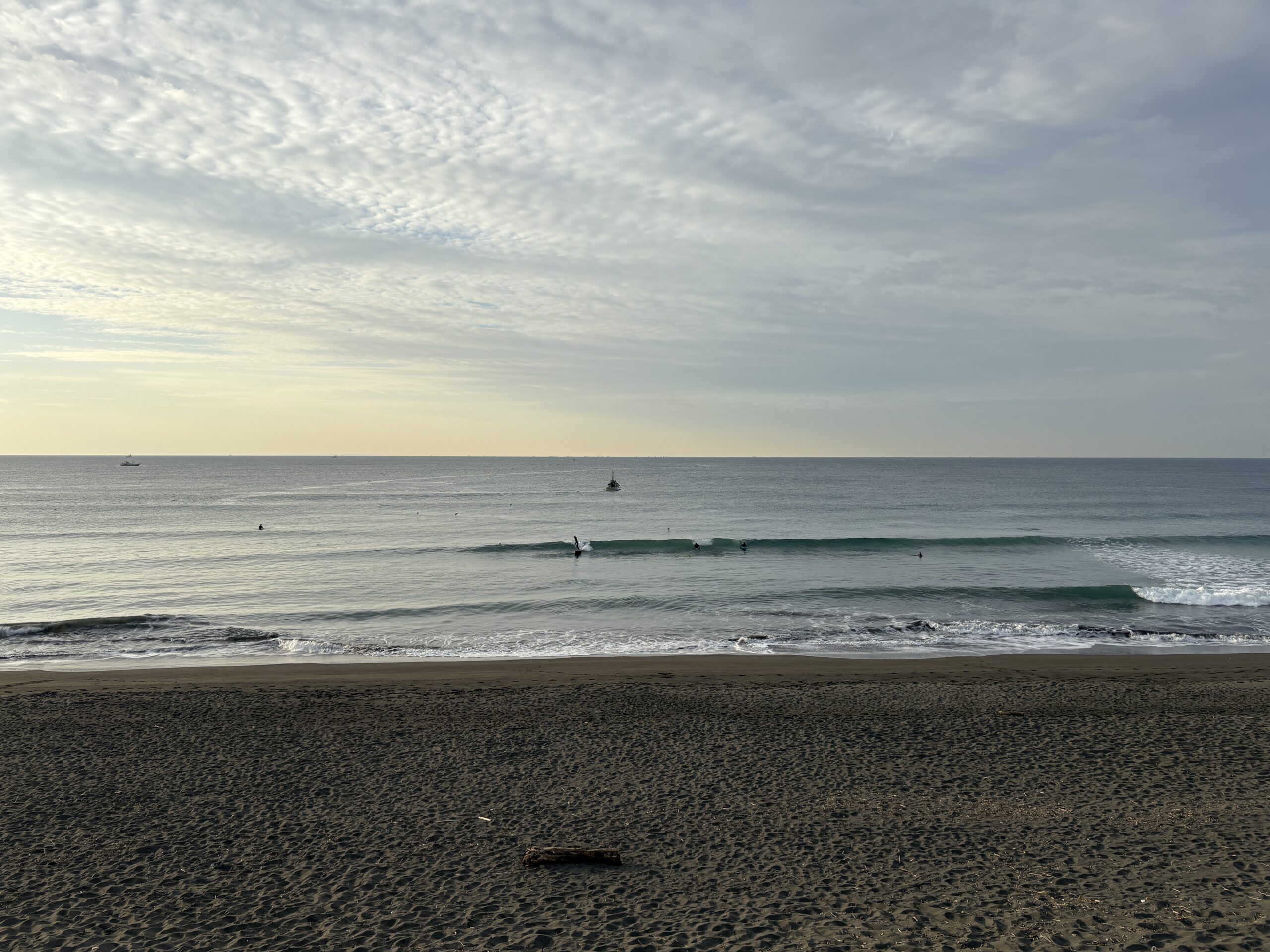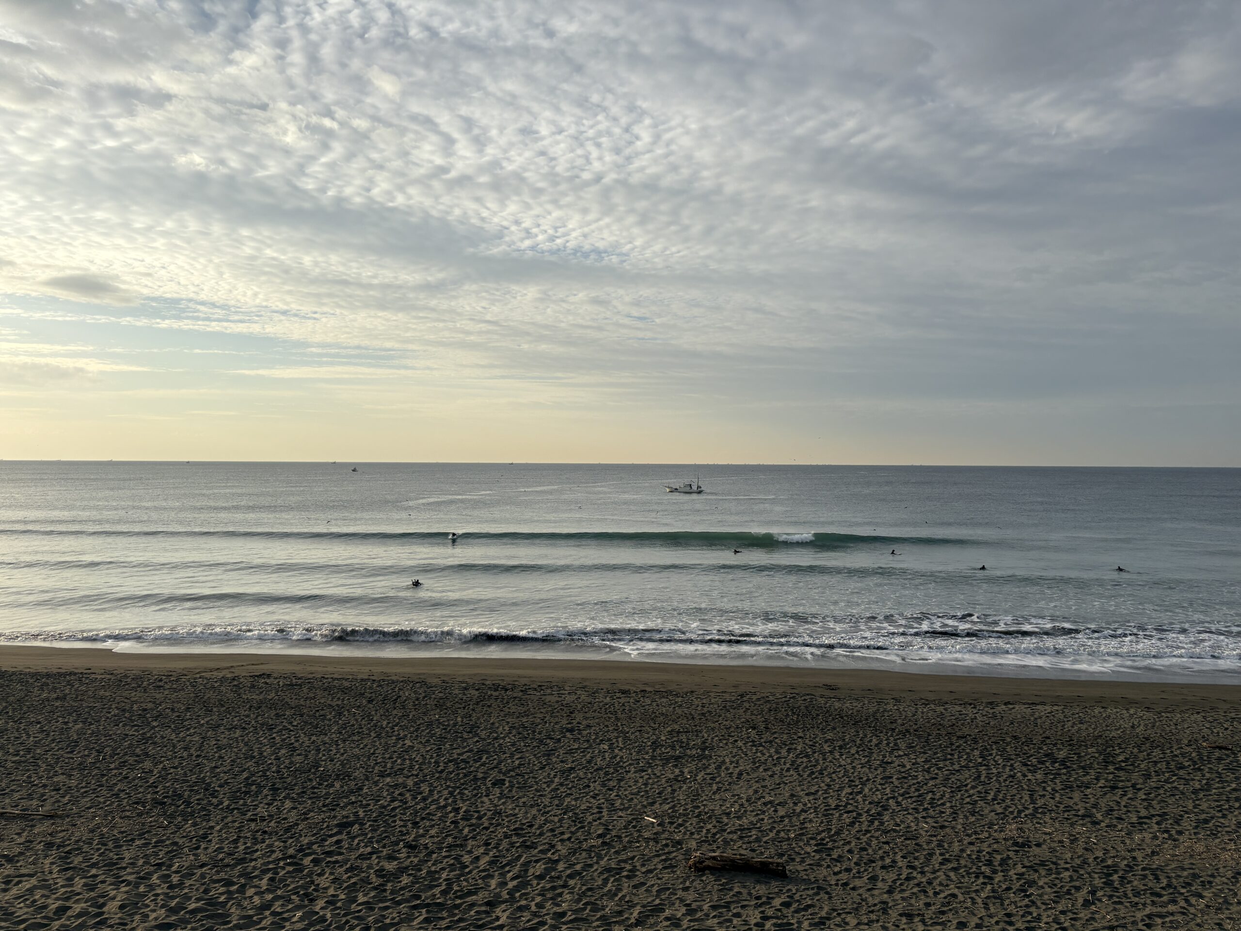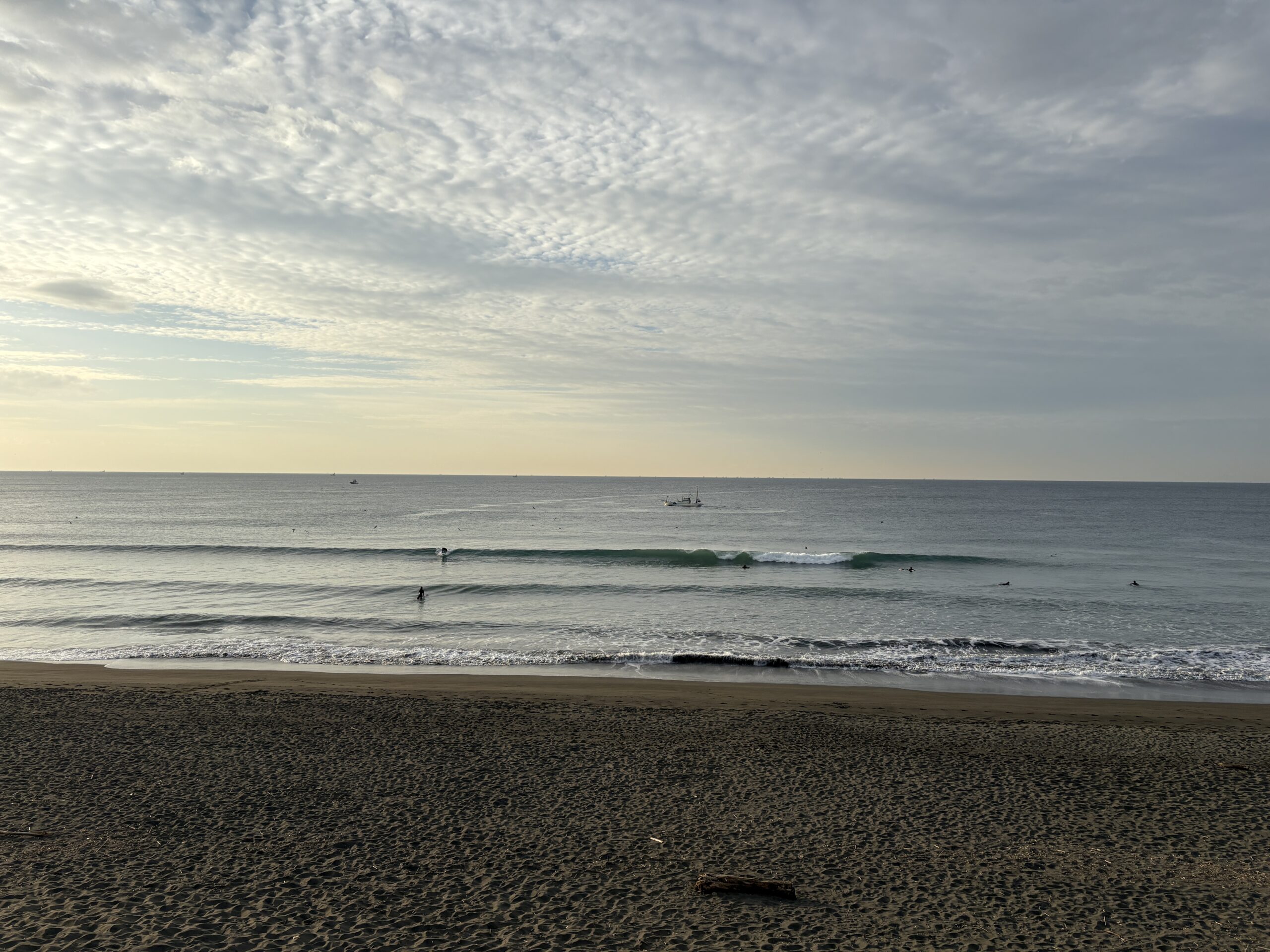 今日の天気は曇りのち雨の予報。今朝は一瞬朝日が出ましたが直ぐに雲に隠れてしまいました。そして今夜から明日午前に掛け全線を伴った低気圧が発達しながら日本列島を東に通過する予想なので、これから下り坂の天気になりそうです。 海は現在、無風のクリーンコンディションで、今日は筋張ったモモ前後のウネリが久々に入り、朝のうちは潮が引いているので形いい波が何とかブレイクしています。