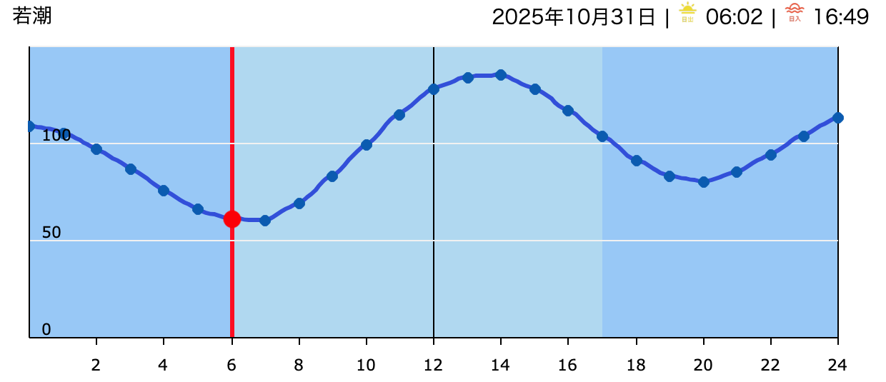 本日のタイドグラフ。 明日は低気圧の通過に寄りサイズアップしそうです?!
