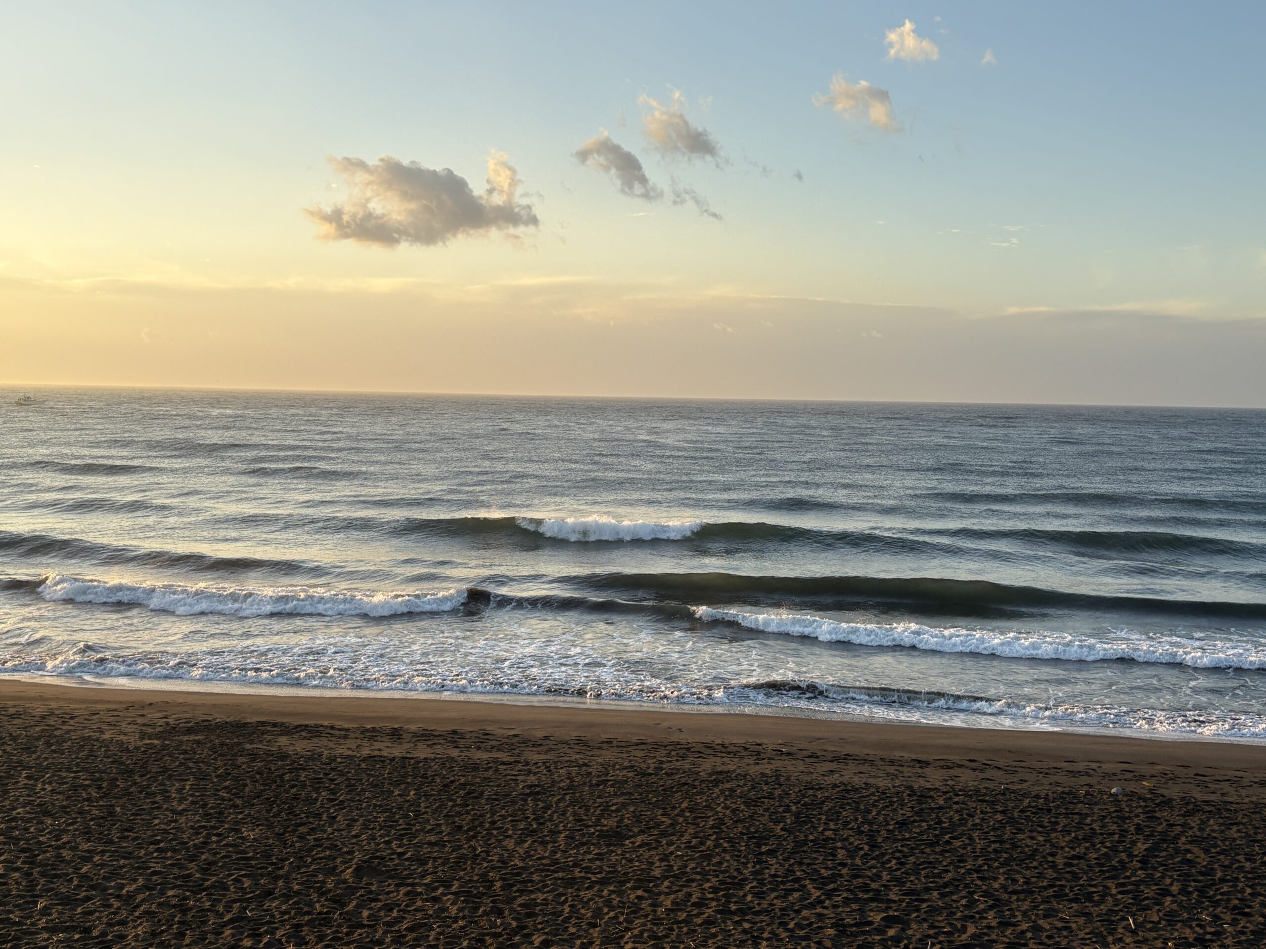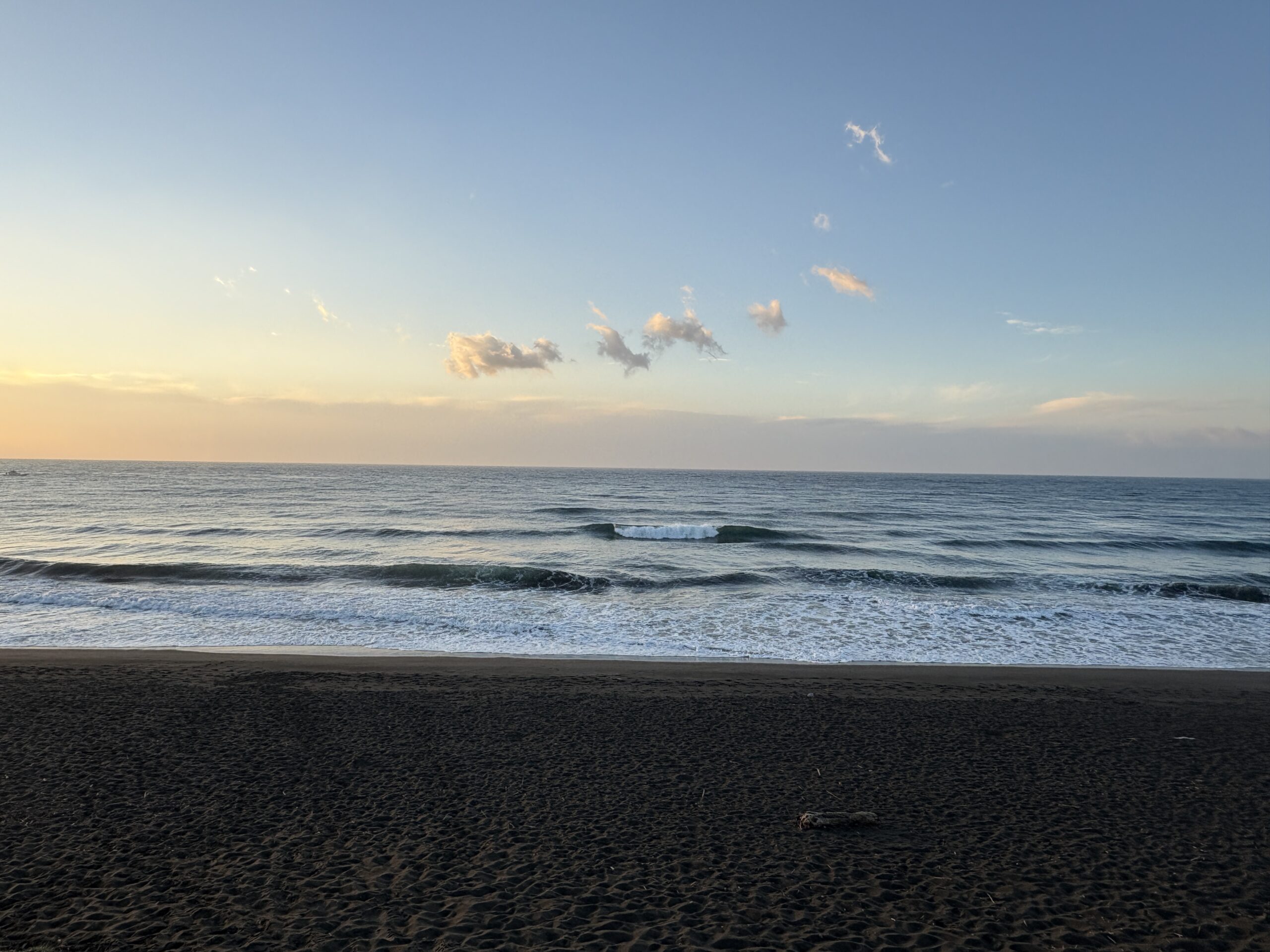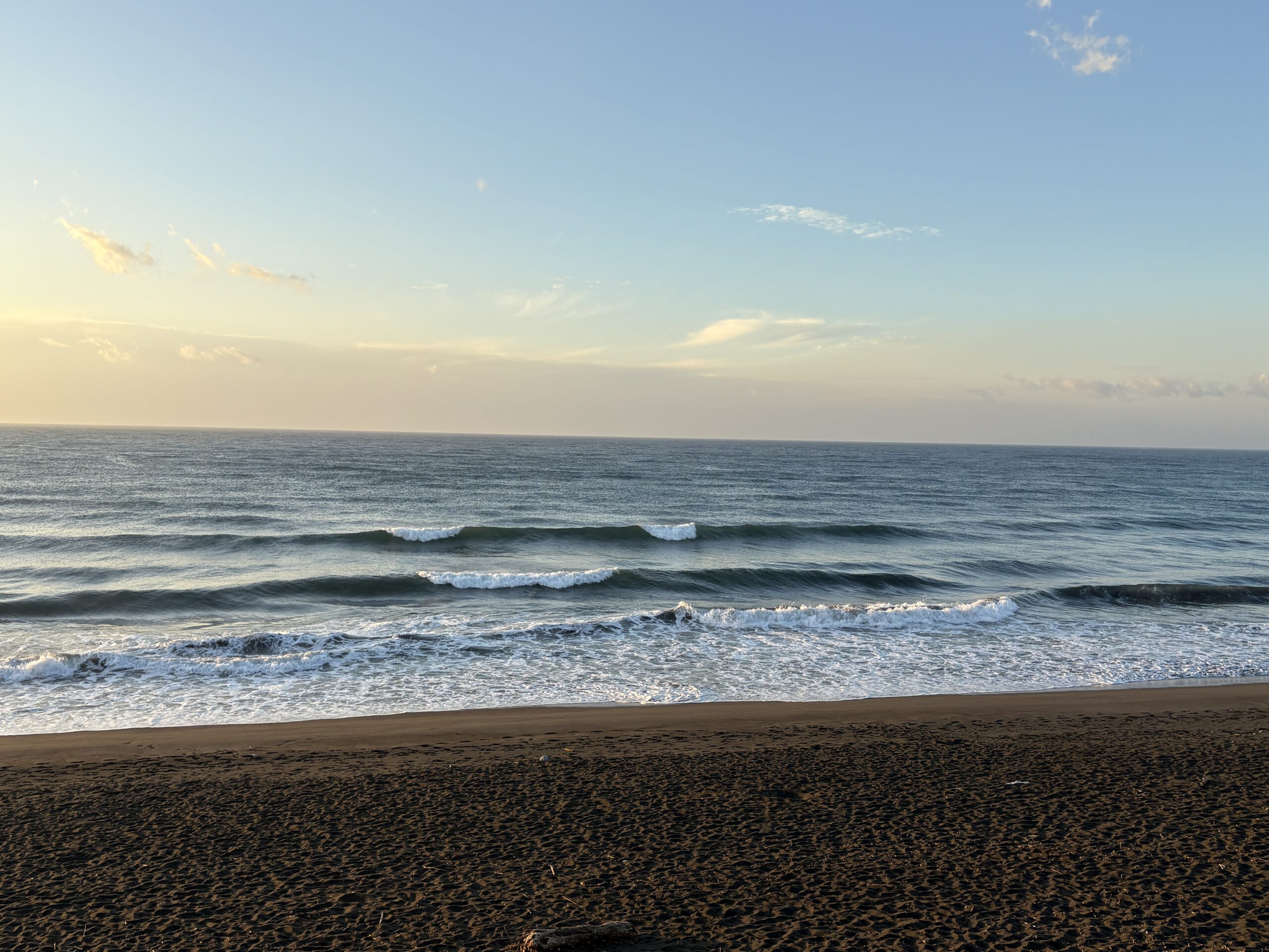 海は夜明け時までは南風が強かったのですが今現在は北風のオフショアになり、未だバラついたウネリでモモから腰前後のやや力の無さそうな波がブレイクしています。