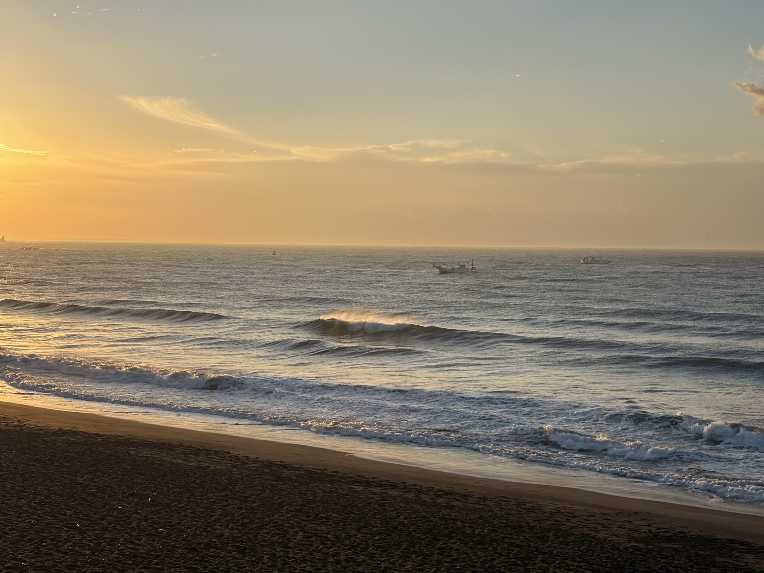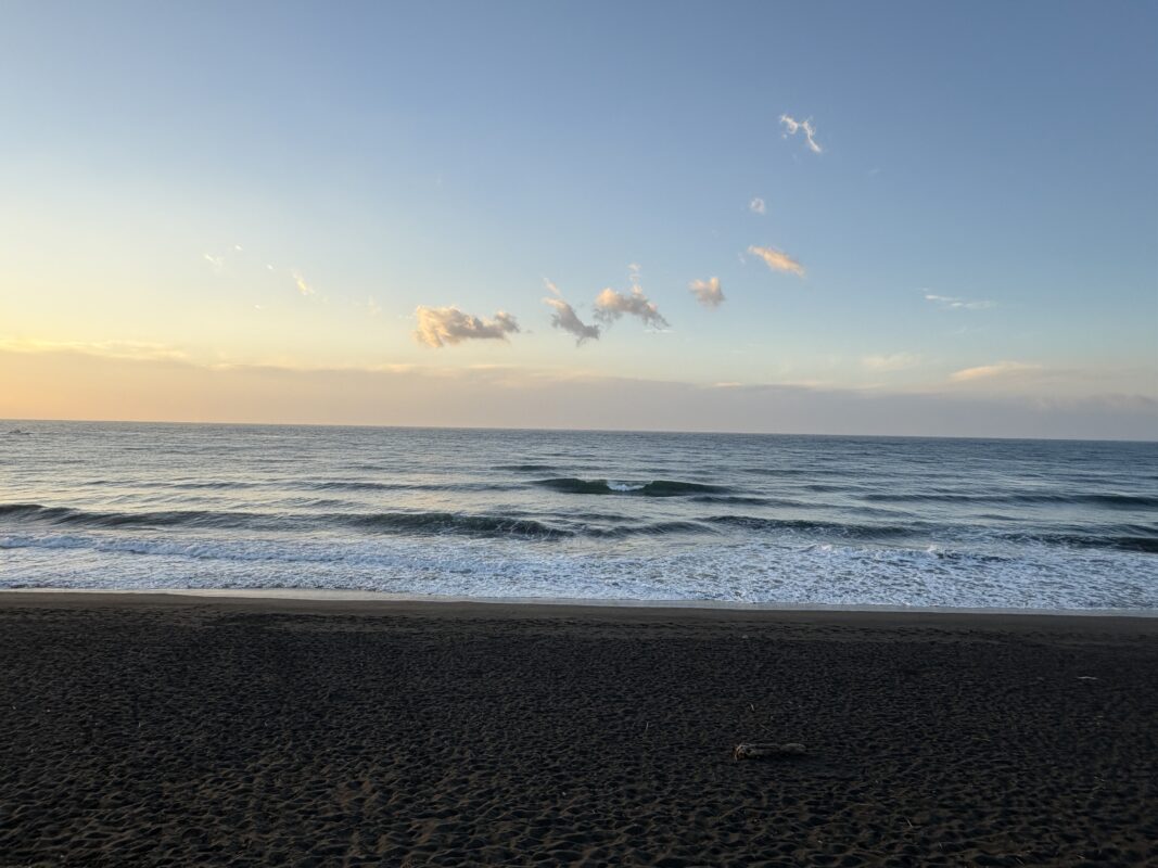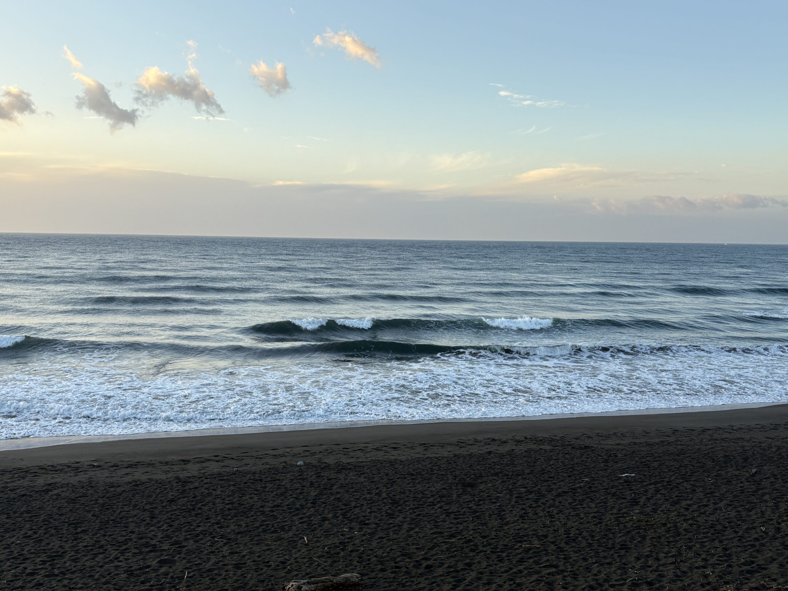 海は夜明け時までは南風が強かったのですが今現在は北風のオフショアになり、未だバラついたウネリでモモから腰前後のやや力の無さそうな波がブレイクしています。