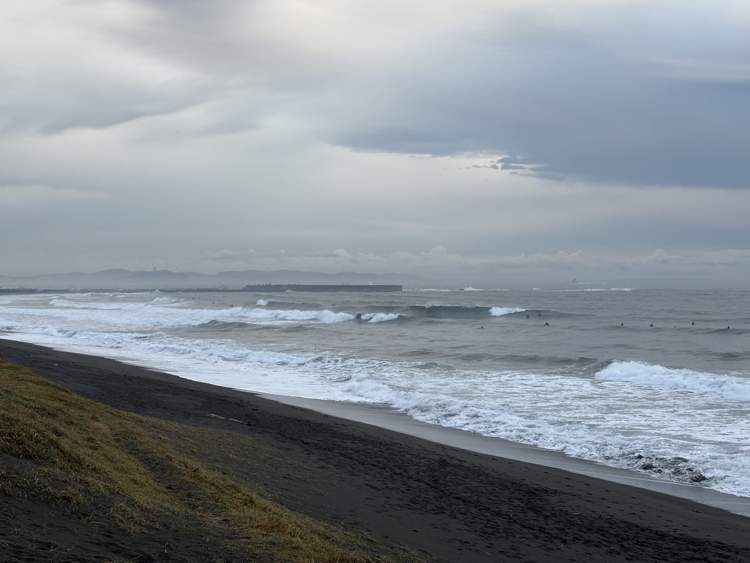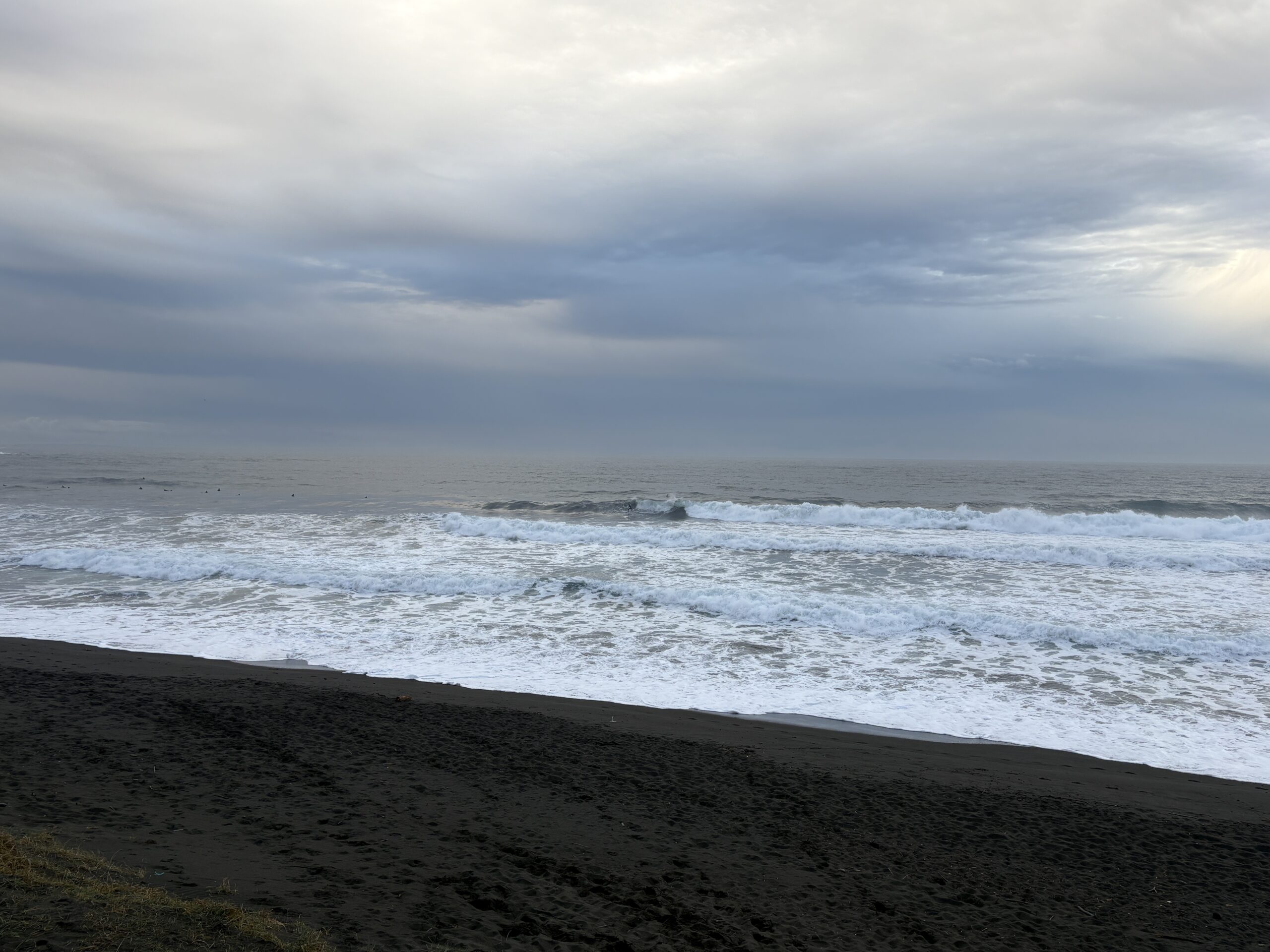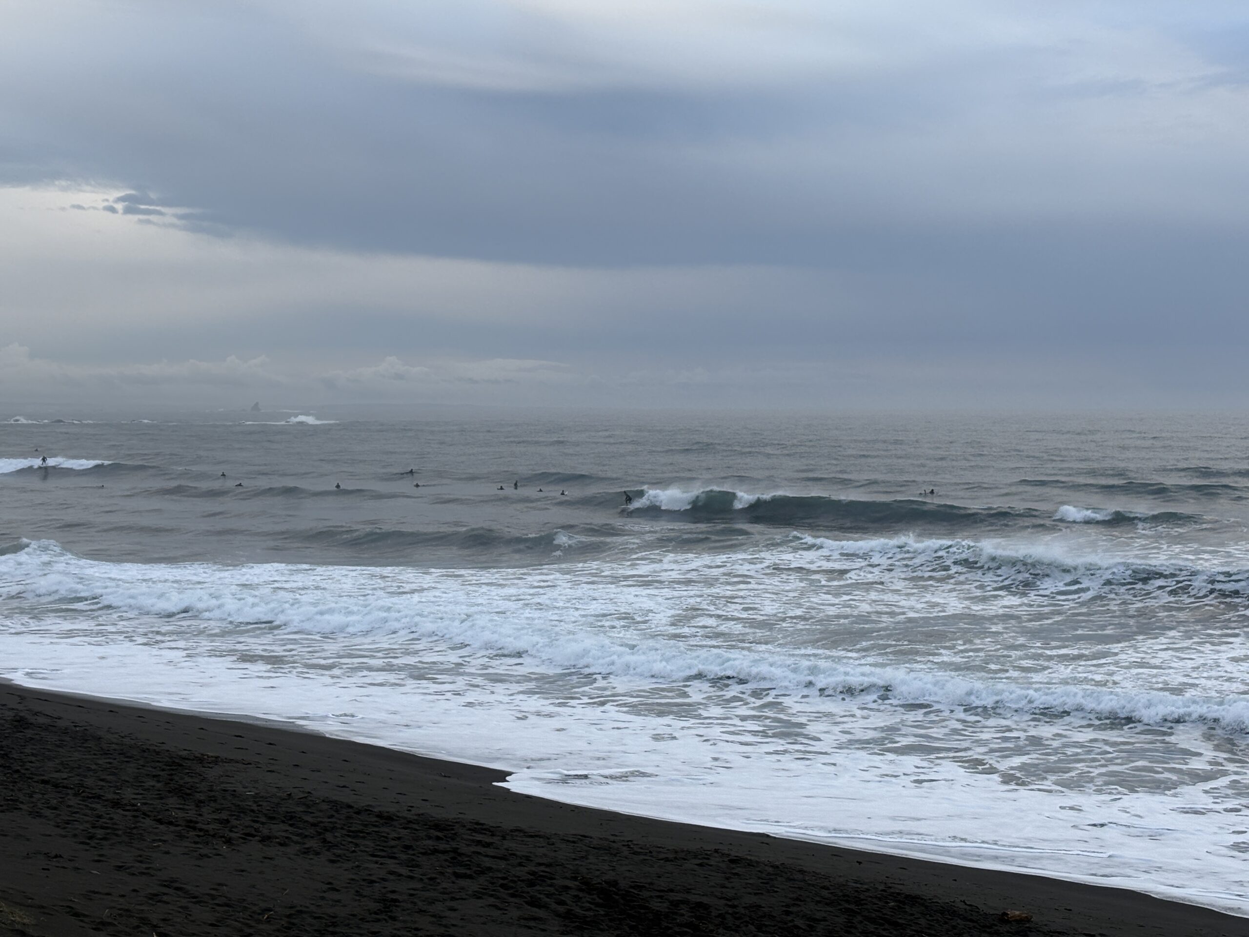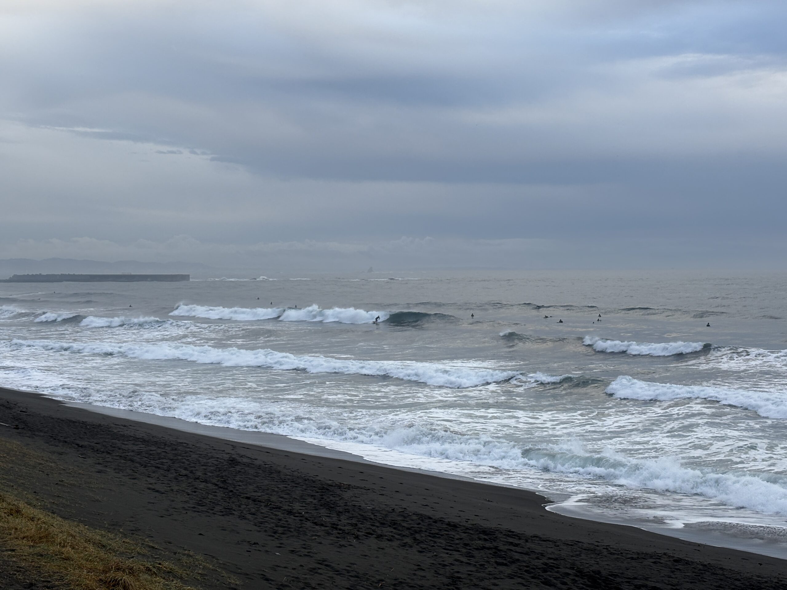 そして海は、沖で吹いている南西の風に寄るバラついたウネリが入り、サイズは胸から肩前後、時折入るセットは頭オーバー有り多数のサーファーが入っています。