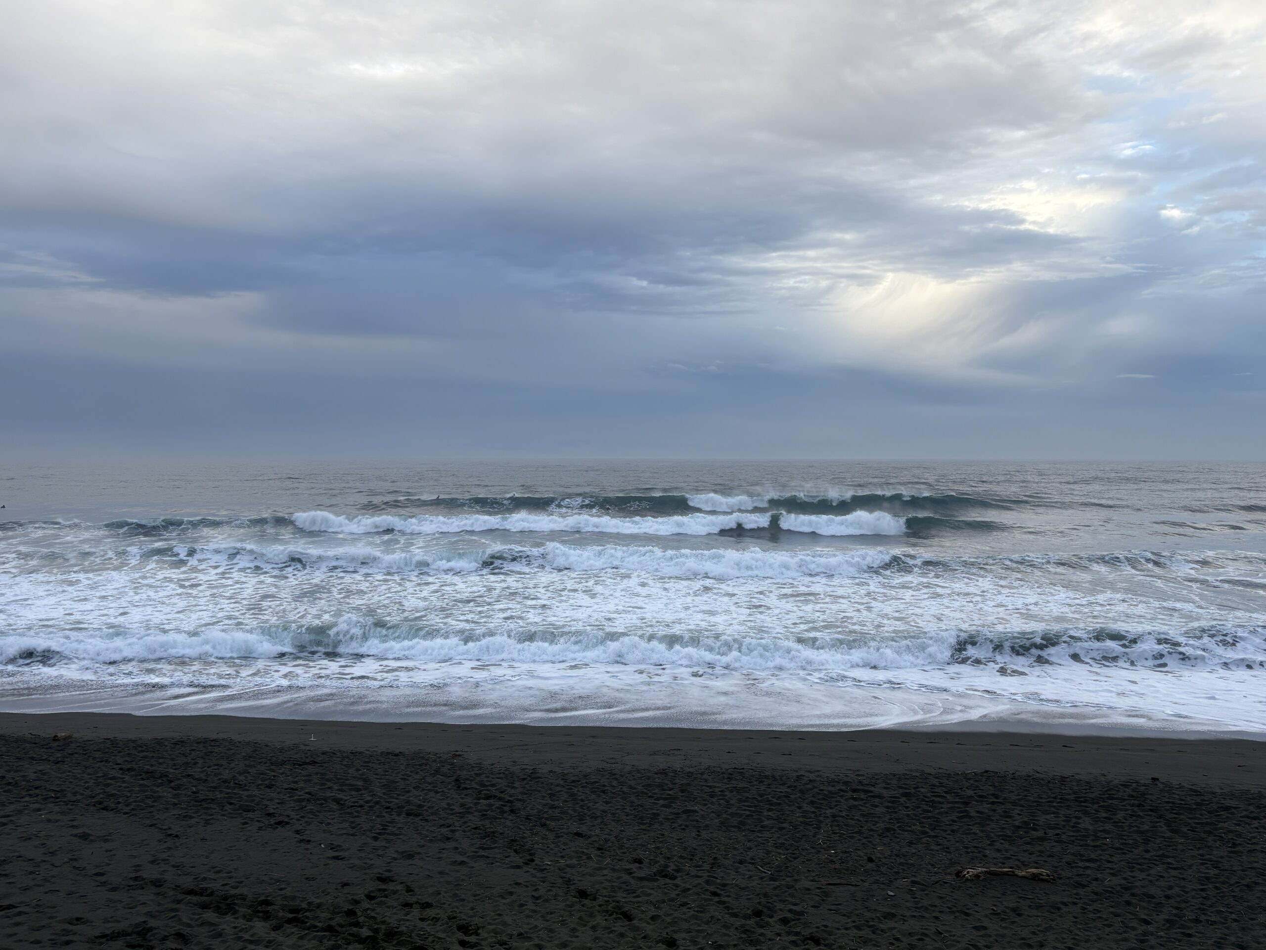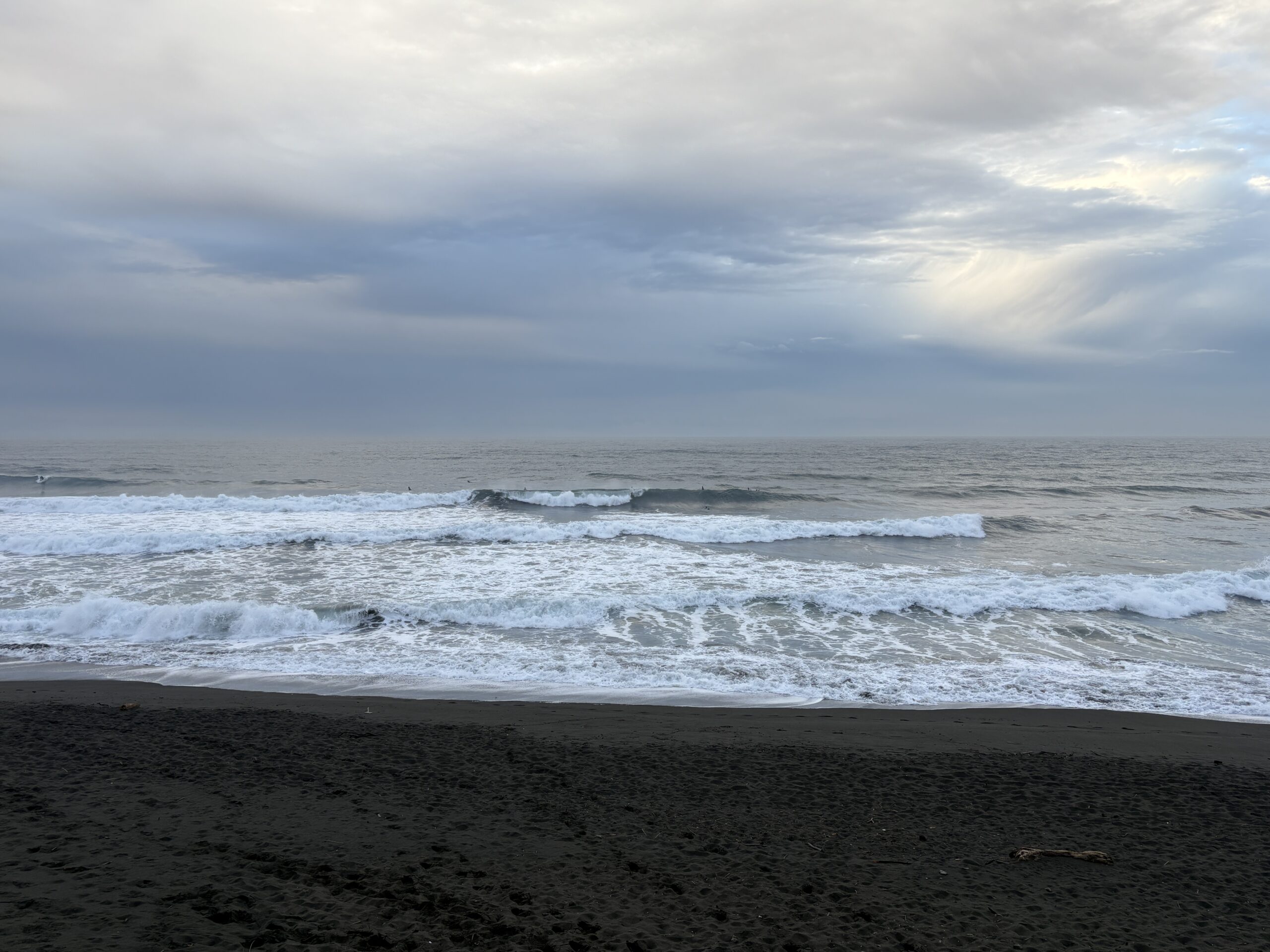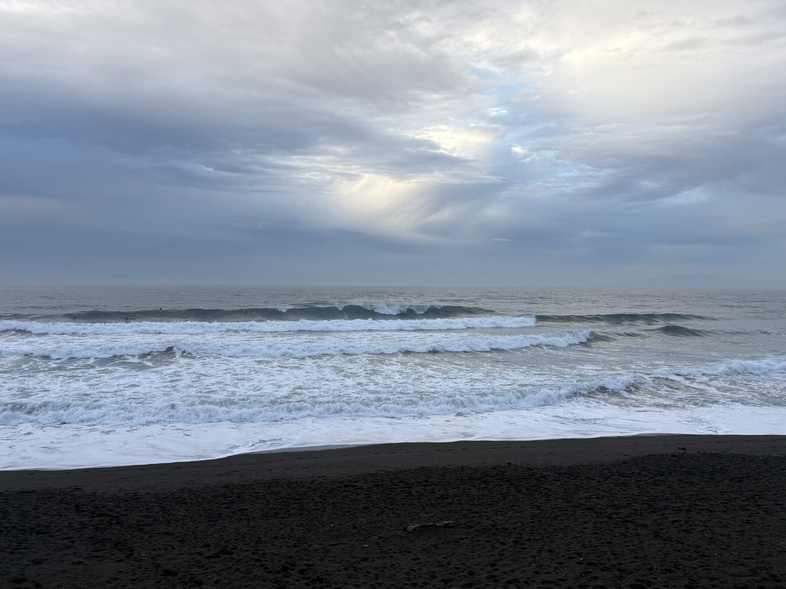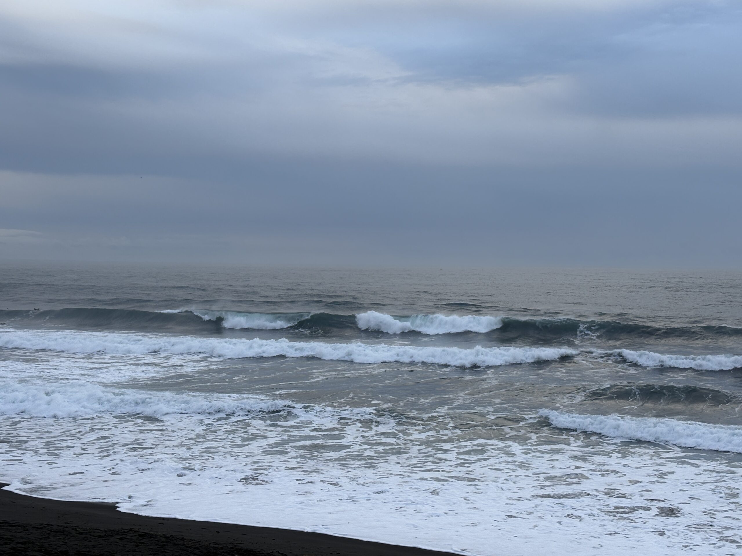 そして海は、沖で吹いている南西の風に寄るバラついたウネリが入り、サイズは胸から肩前後、時折入るセットは頭オーバー有り多数のサーファーが入っています。