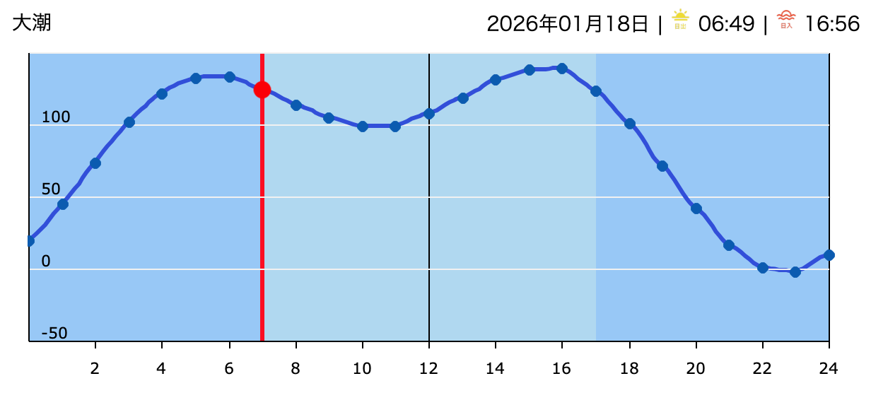 今日の天気は晴れのち曇りの予報。今朝は無風の穏やかな天気で、朝日が眩しく気持ちの良い朝です。海は、ウネリ乏しくフラットに近い状態です。 本日のタイドグラフ。Windyフォーキャスト・波高&風予想。
