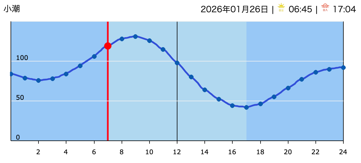 今日の天気は晴れのち曇りの予報。今朝は晴れて依然寒気が入っていて、放射冷却に寄り冷えた朝となっています。海は昨日と同じく筋張ったウネリが入りますが、潮が上げている為、インサイドのショアブレイクです。 本日のタイドグラフ。午後に潮が引き多少割れ易くなって来ますが、海風が吹く予想で海面が荒れて来そうです?!