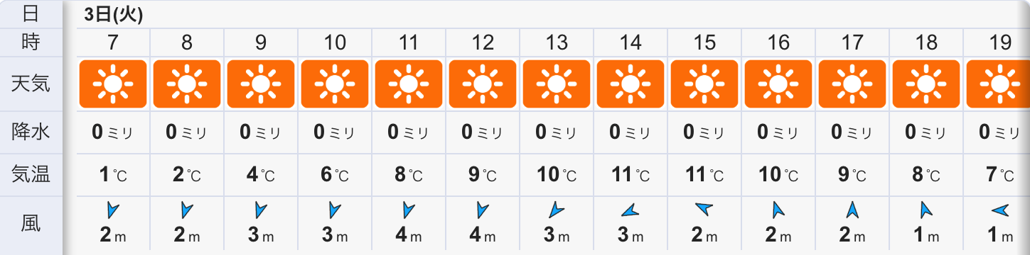 今日の天気は晴れの予報。今朝は緩るやかな北風に放射冷却で冷えていますが、空は雲ひとつ無いブルースカイ広がる気持ちの良い朝です。