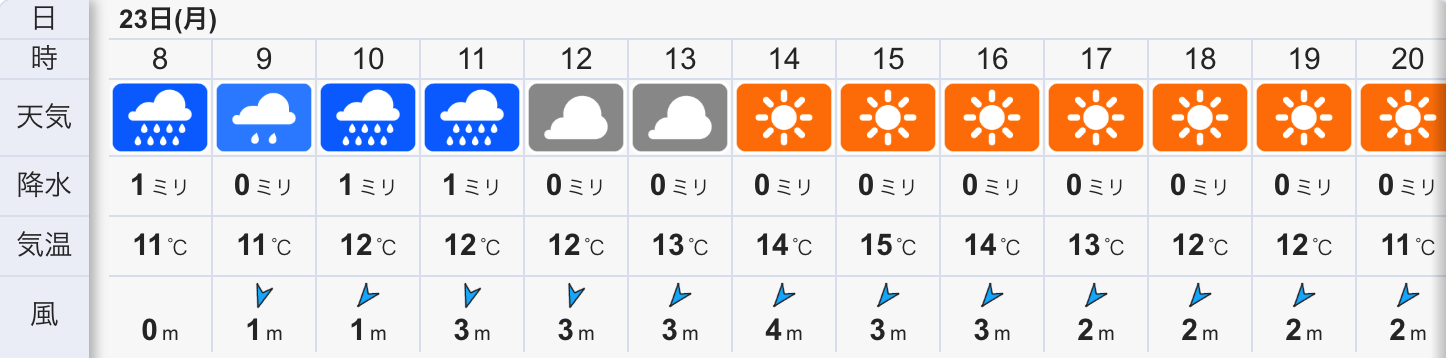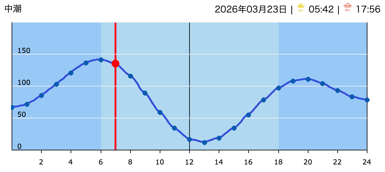 今日の天気は雨のち晴れの予報。今朝は無風の小雨が降りやや肌寒い朝です。海は春の地形になりつつ有り、膝前後のバラついたウネリが入り朝は潮も多く力の無さそうなインサイド寄りのブレイクで取り敢えず出来そうな感じです。 本日のタイドグラフ。今日は終日オフの北東風が吹く予想です。
