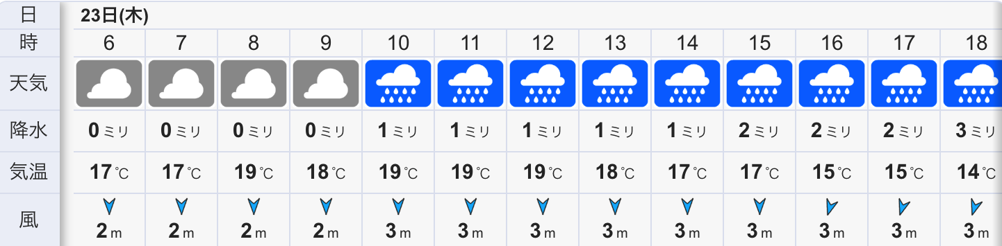 今日の天気は曇りのち雨の予報。今朝はどんよりとした曇り空で緩い北東風が吹くやや肌寒い朝です。