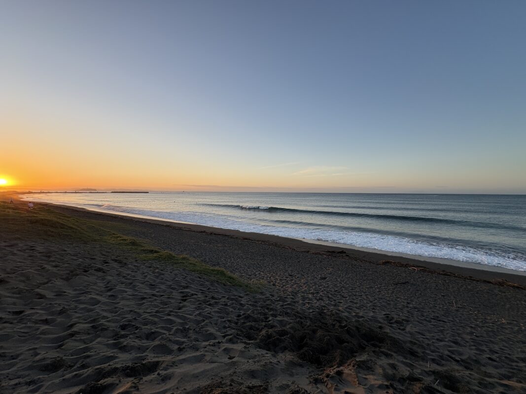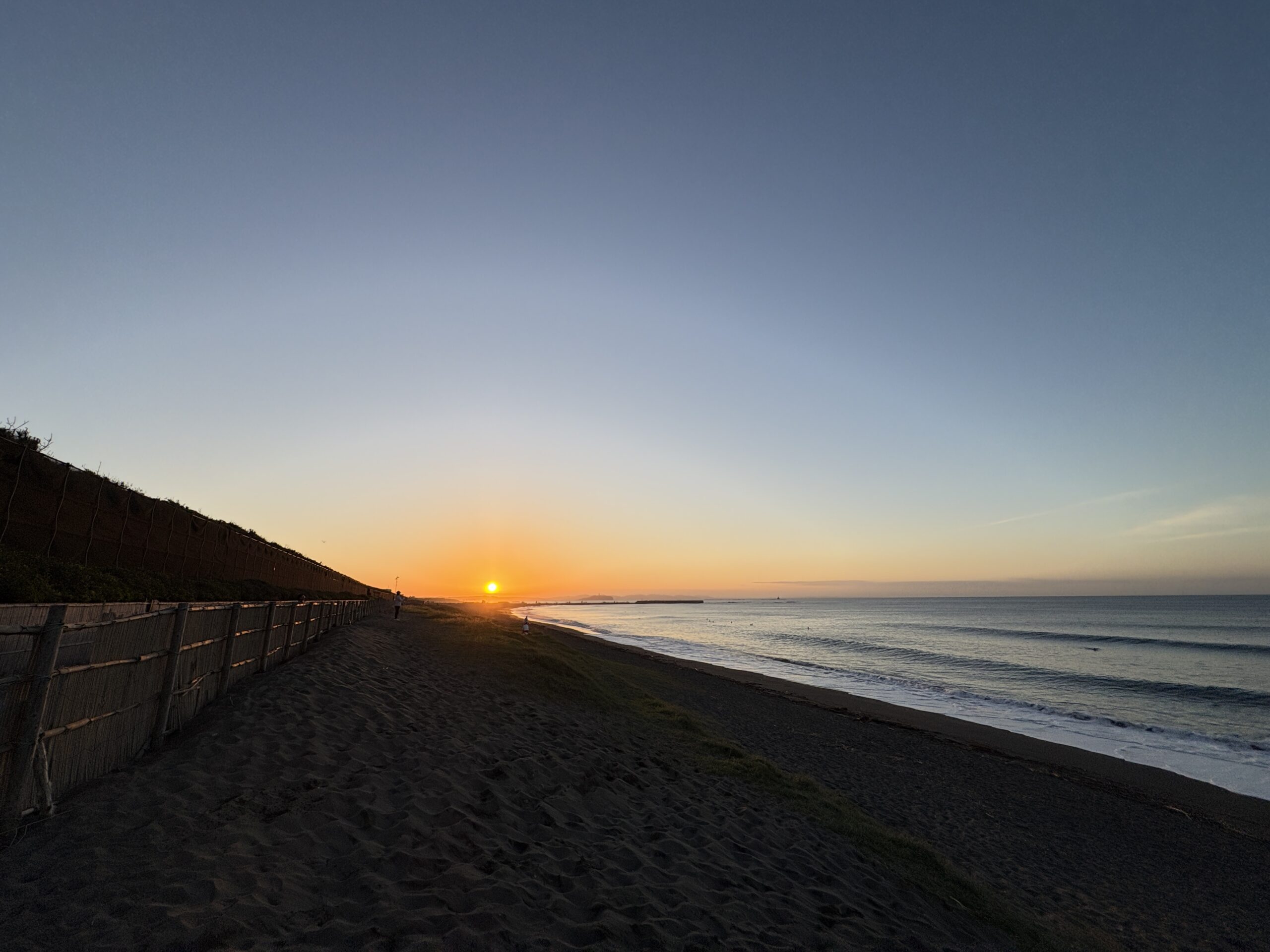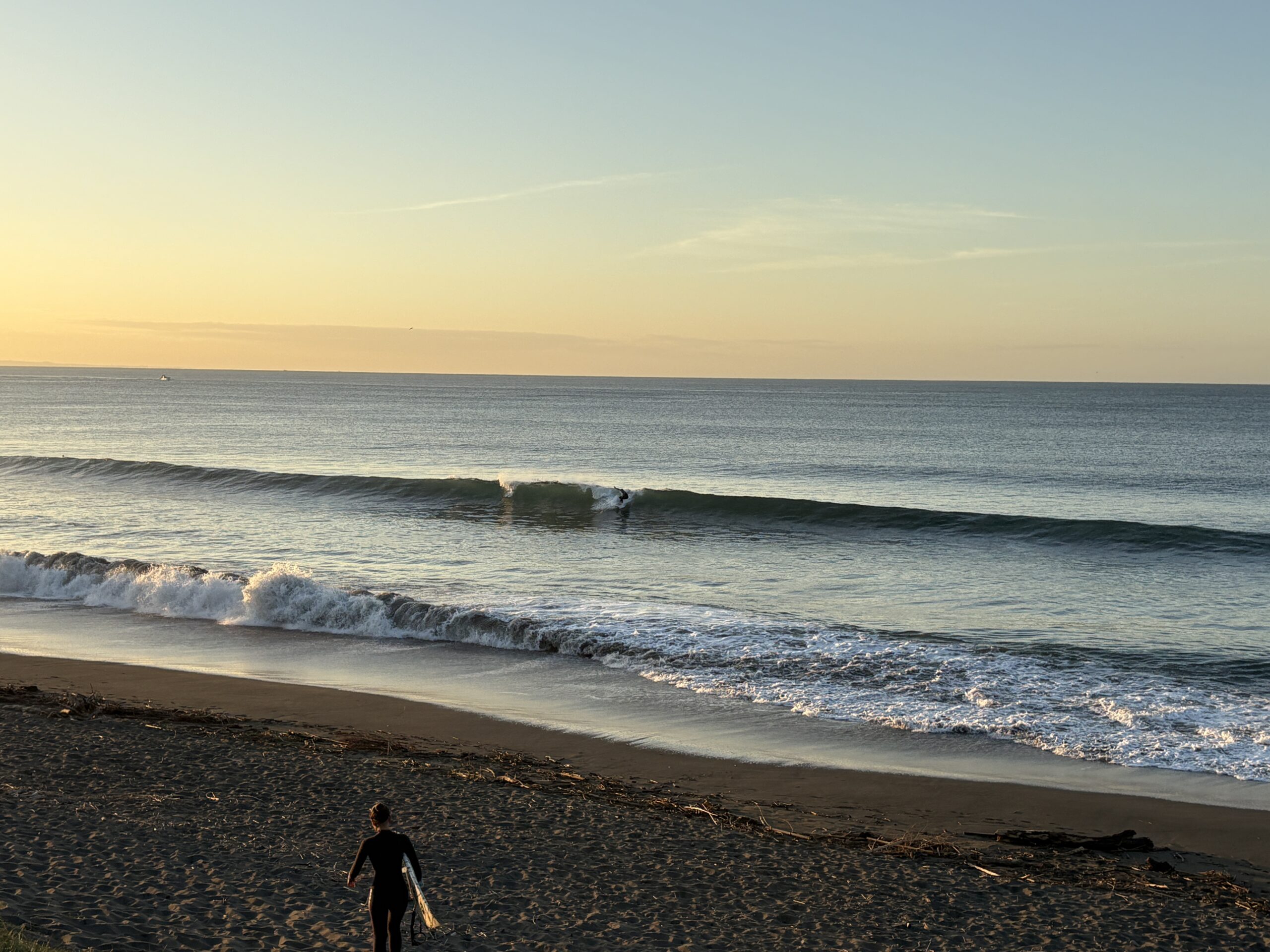 今日の天気は晴れの予報。今朝は冷たい北風が吹き肌寒い朝ですが、久しぶりにブルースカイ広がる秋晴れになりそうです。海は昨日より若干サイズダウンし胸肩前後のしっかりしたウネリが入りますが、セット間長めの朝イチは潮も上げインサイドブレイクで、たまのセットは何とかテイクオフ出来てライド可能です。