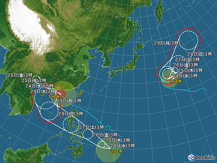 昨日まで停滞していた台風19号は、これから次第に北東方向に動き出す予想となっています。また、フィリピン近海に20号が発生しましたが、西に向かい日本には影響無さそうです。