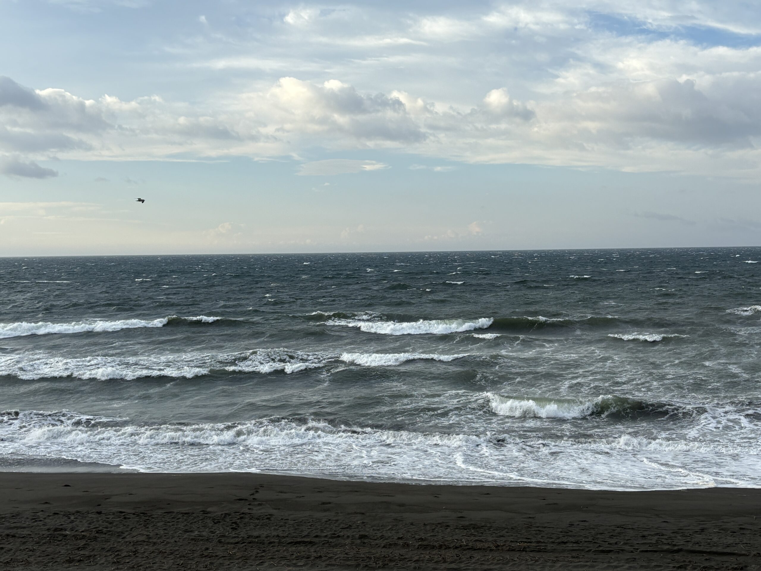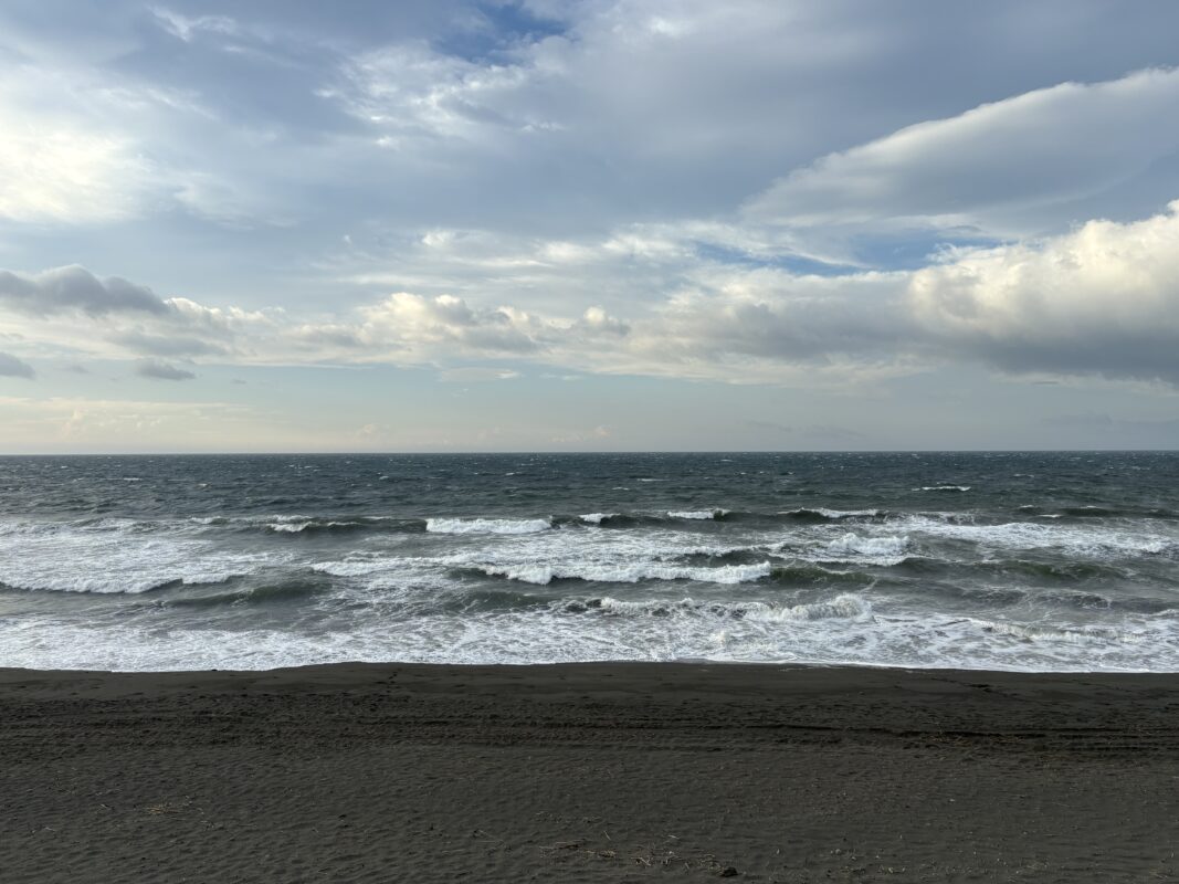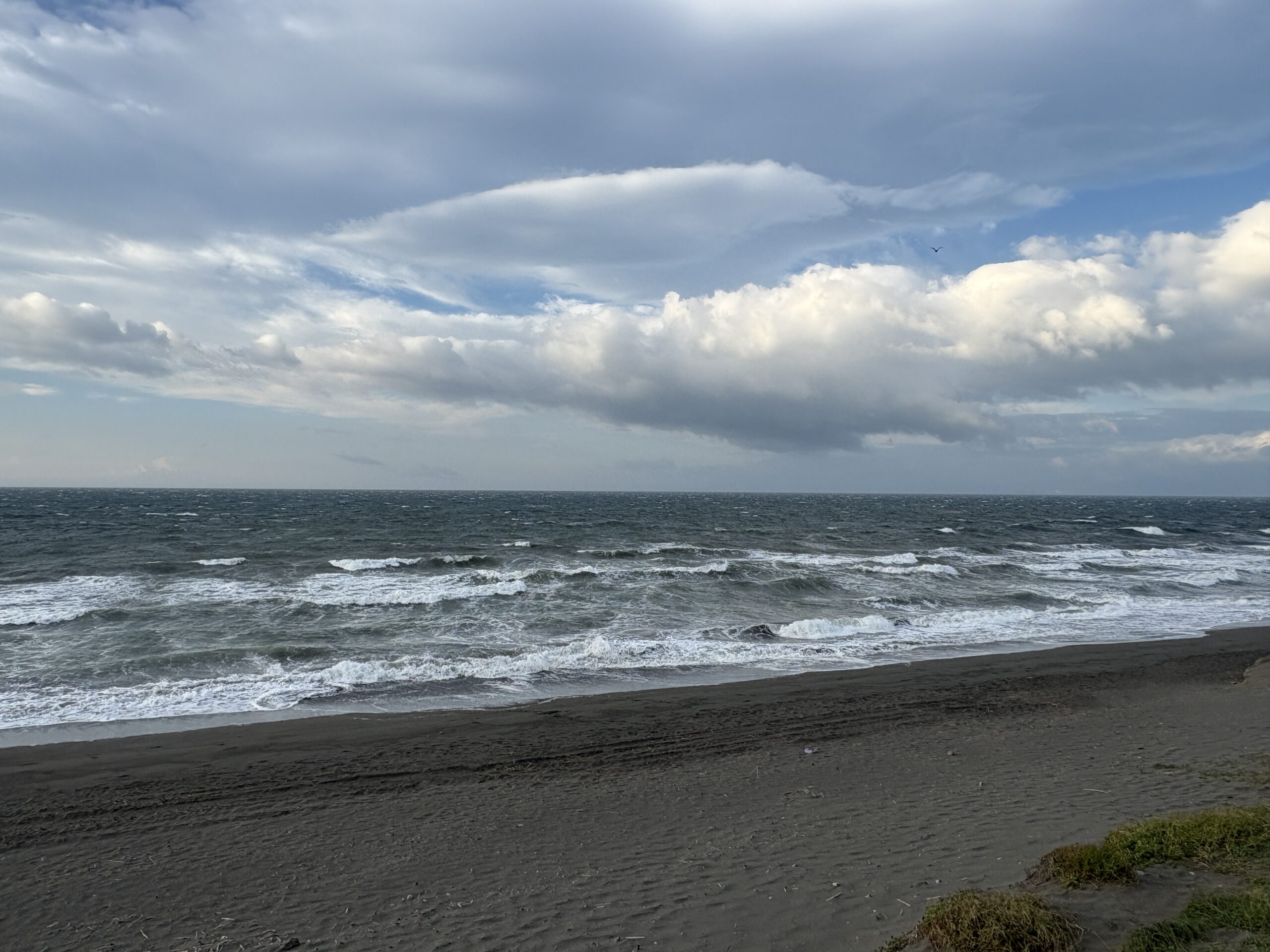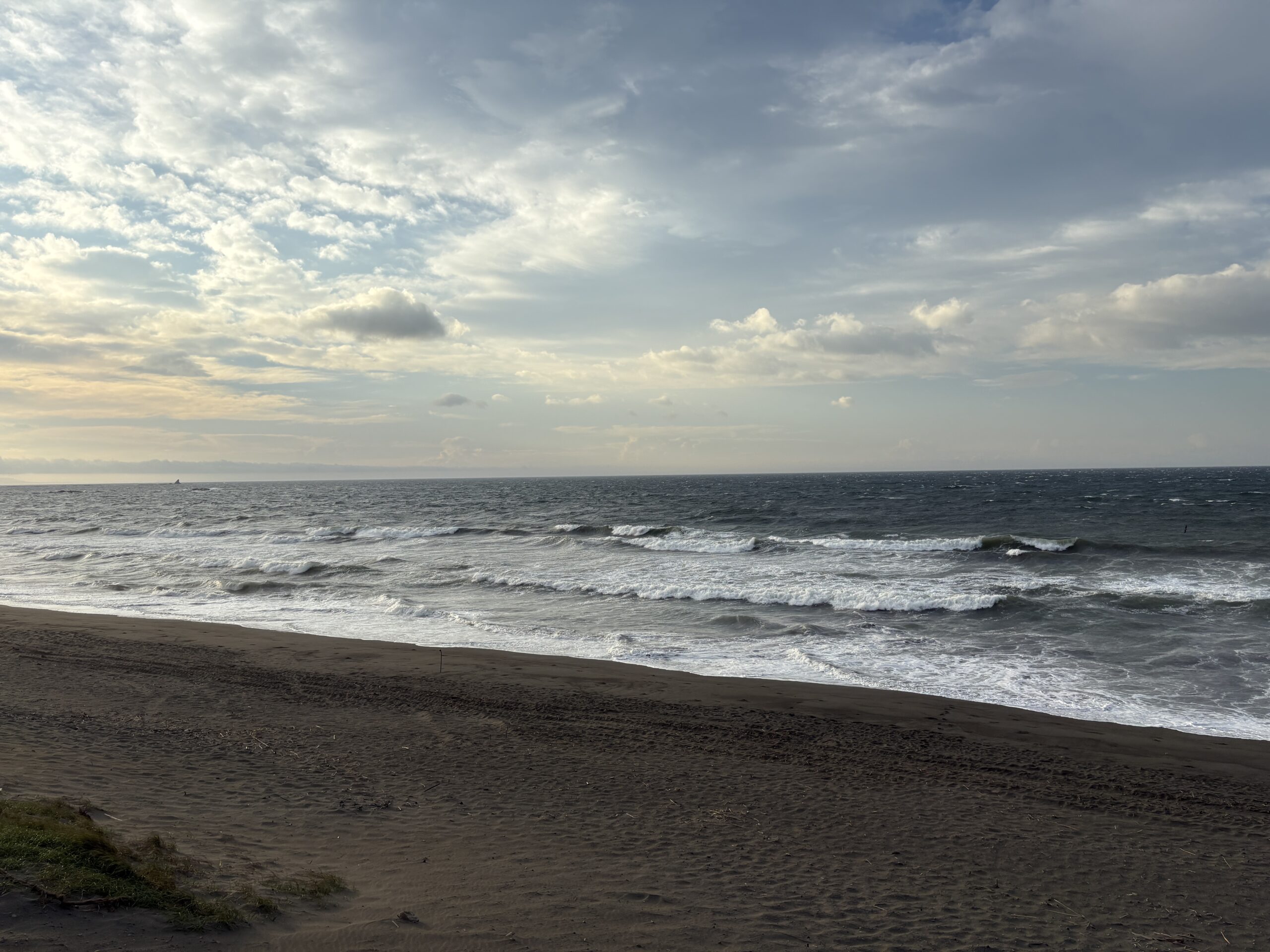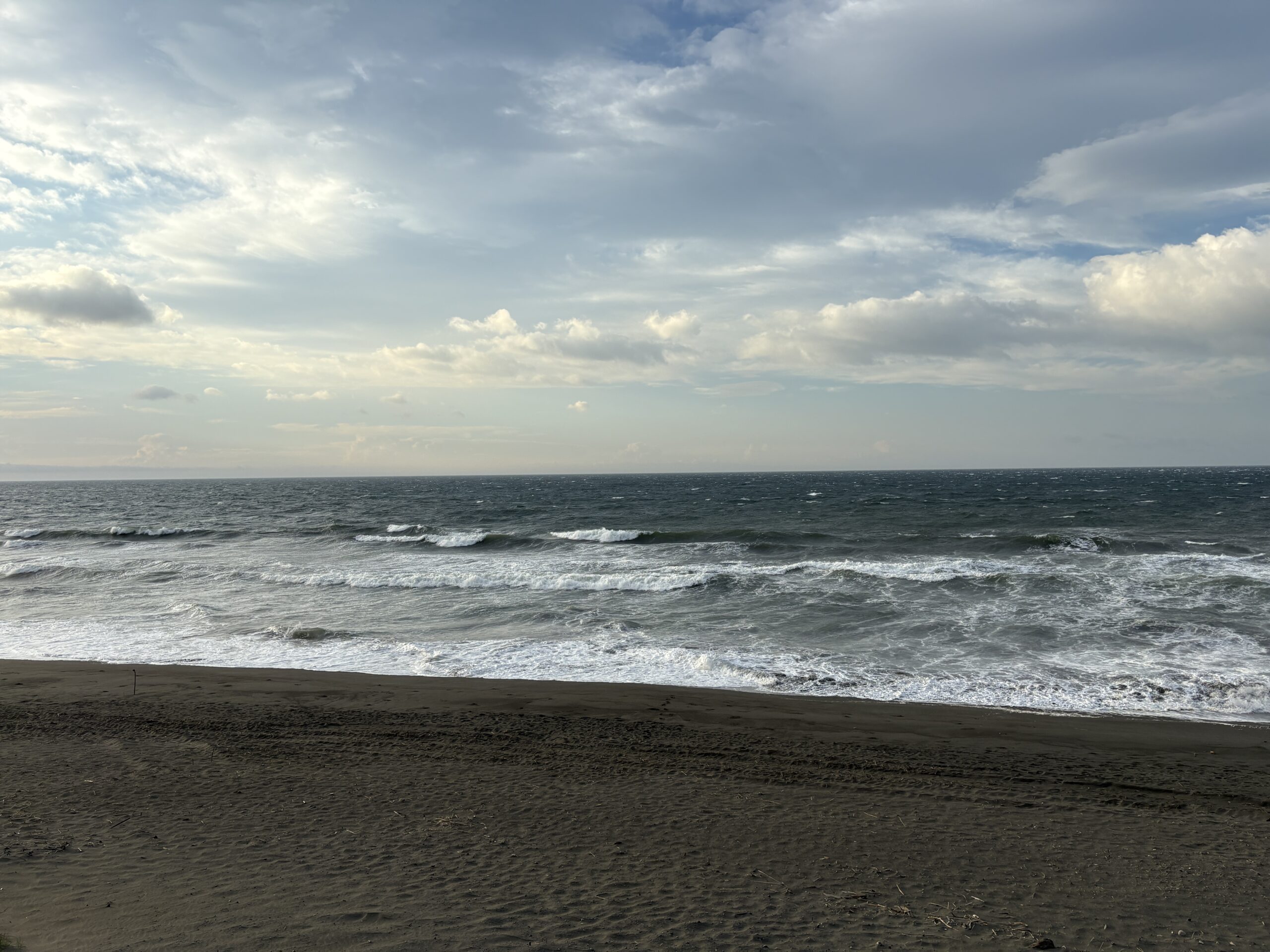 今日の天気は曇り時々晴れの予報。今朝は曇が多く朝日も出たり曇ったりの天気で、南風が強く砂嵐が巻き上がる程の強風で、目も開けてられない程の海です。その影響で沖から白波が立ち、腰から胸近くのバラついた波がそこら中でブレイクしているジャンクなコンディションです。