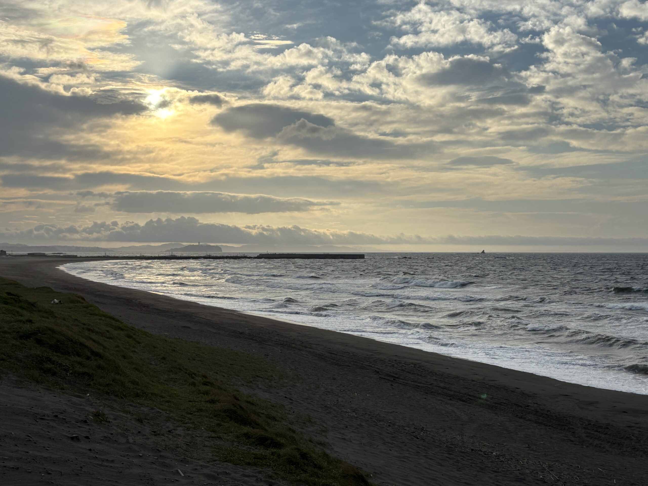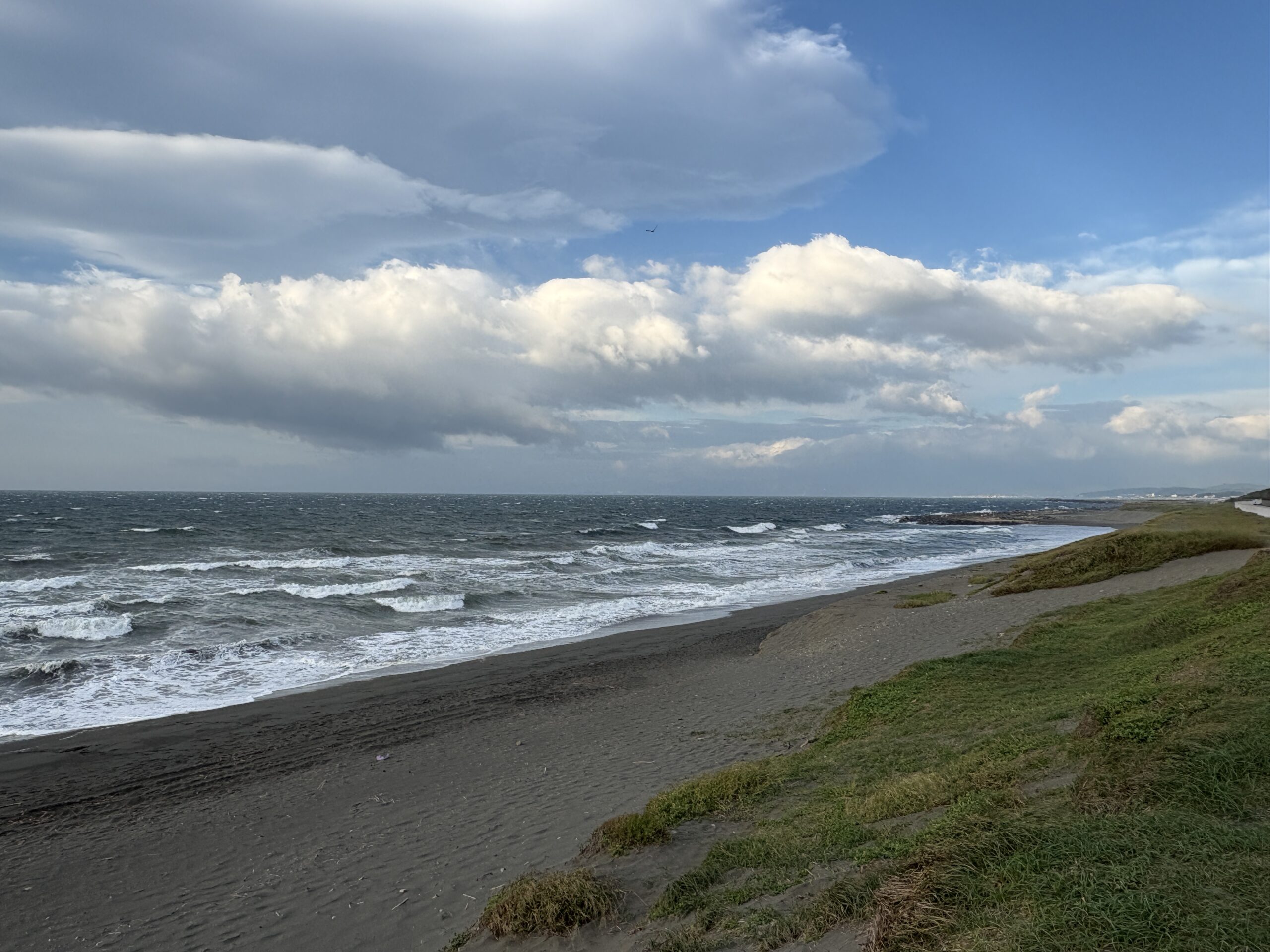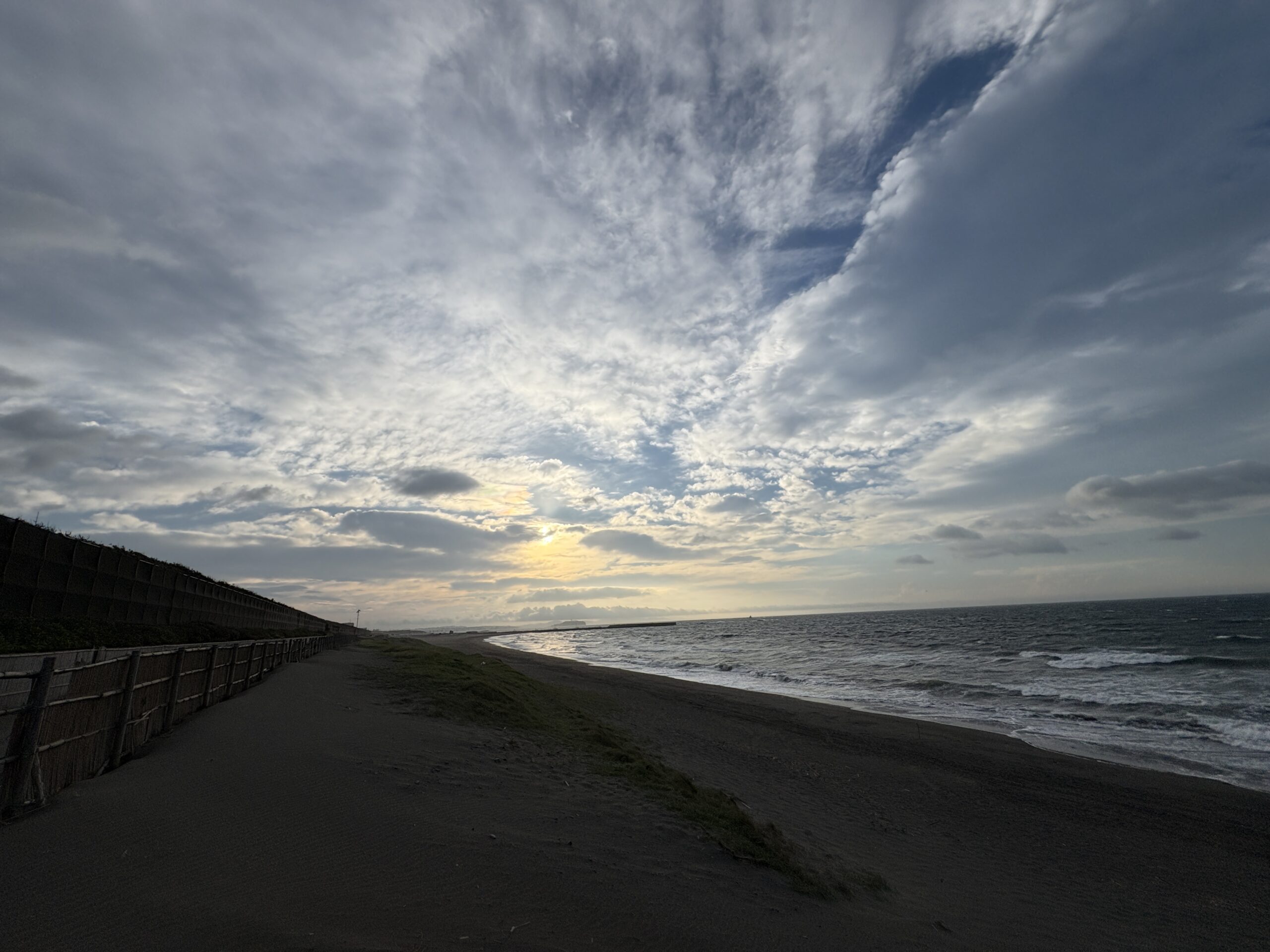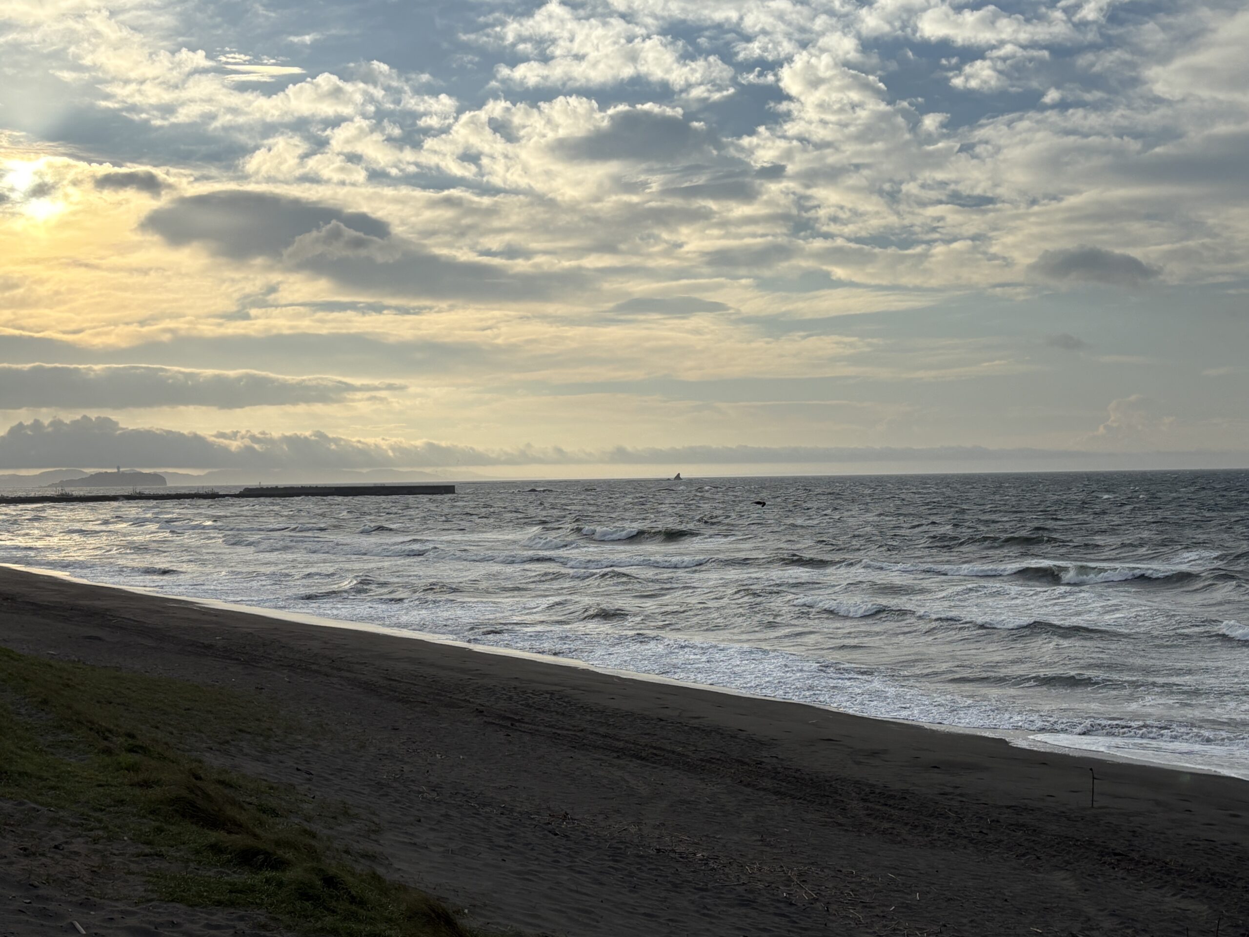 今日の天気は曇り時々晴れの予報。今朝は曇が多く朝日も出たり曇ったりの天気で、南風が強く砂嵐が巻き上がる程の強風で、目も開けてられない程の海です。その影響で沖から白波が立ち、腰から胸近くのバラついた波がそこら中でブレイクしているジャンクなコンディションです。