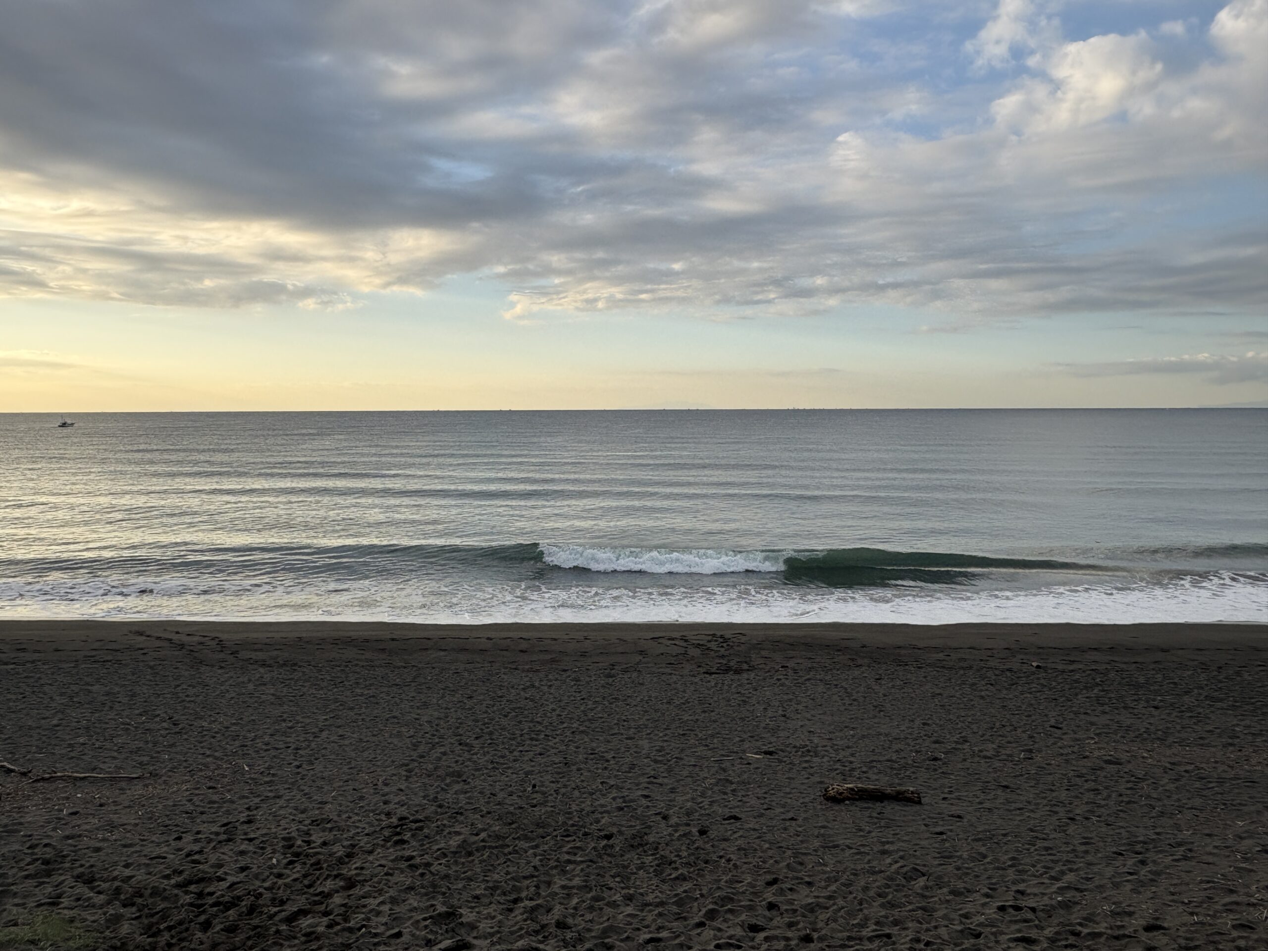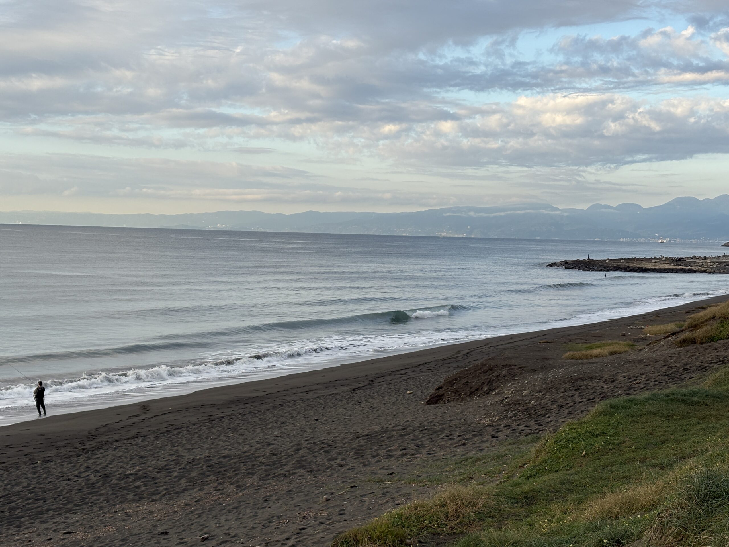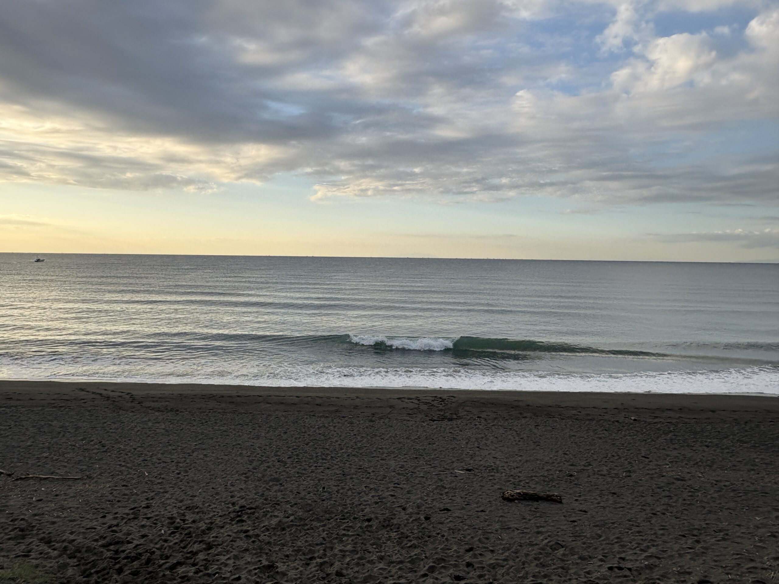 海はウネリの間隔が狭い膝前後のウネリが入りますが、沖で割れ辛くインサイドブレイクで、夜明け時から入っているカリフォルニア・ポケのテッペイ君曰く、やや潮が引いた夜明け時から割れ辛かったとの事。