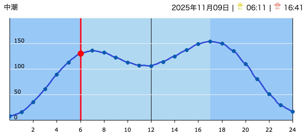 今日の天気は雨時々曇りの予報。今朝は冷たい雨がシトシトと降る肌寒い朝です。海はウネリ乏しくフラットです。 本日のタイドグラフ。たまに微かなウネリが入りますが、日中は潮が上げ干満の差が無く厳しい1日になりそうです?!