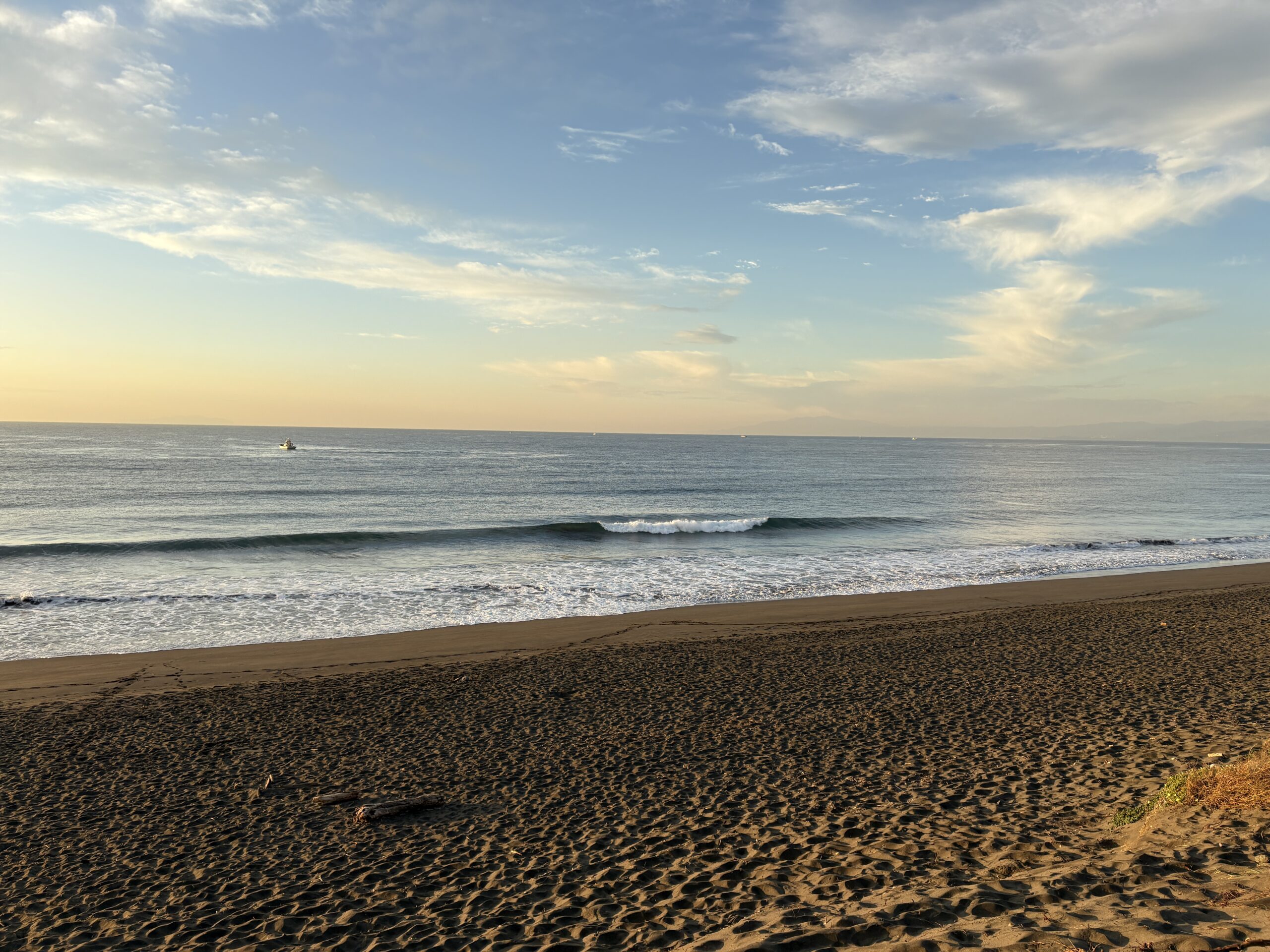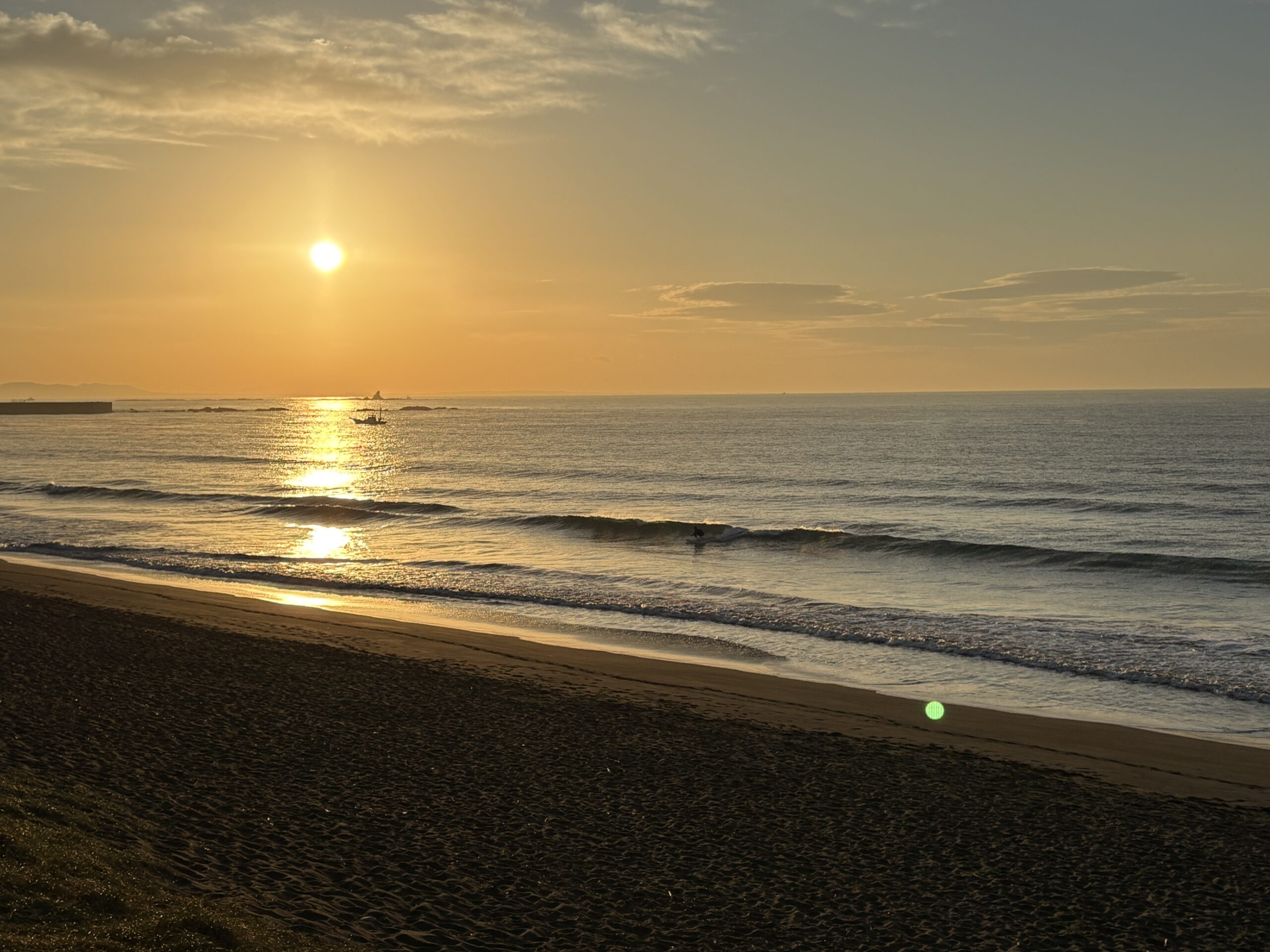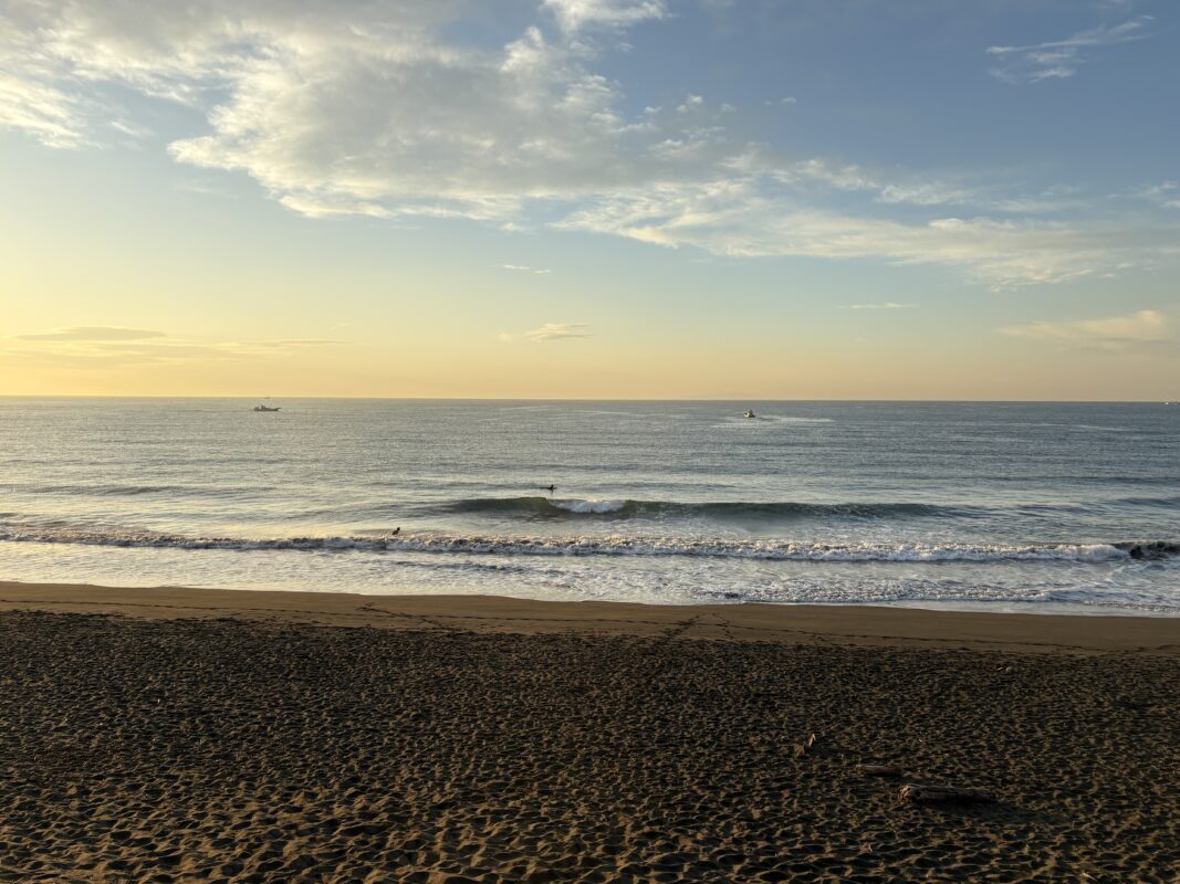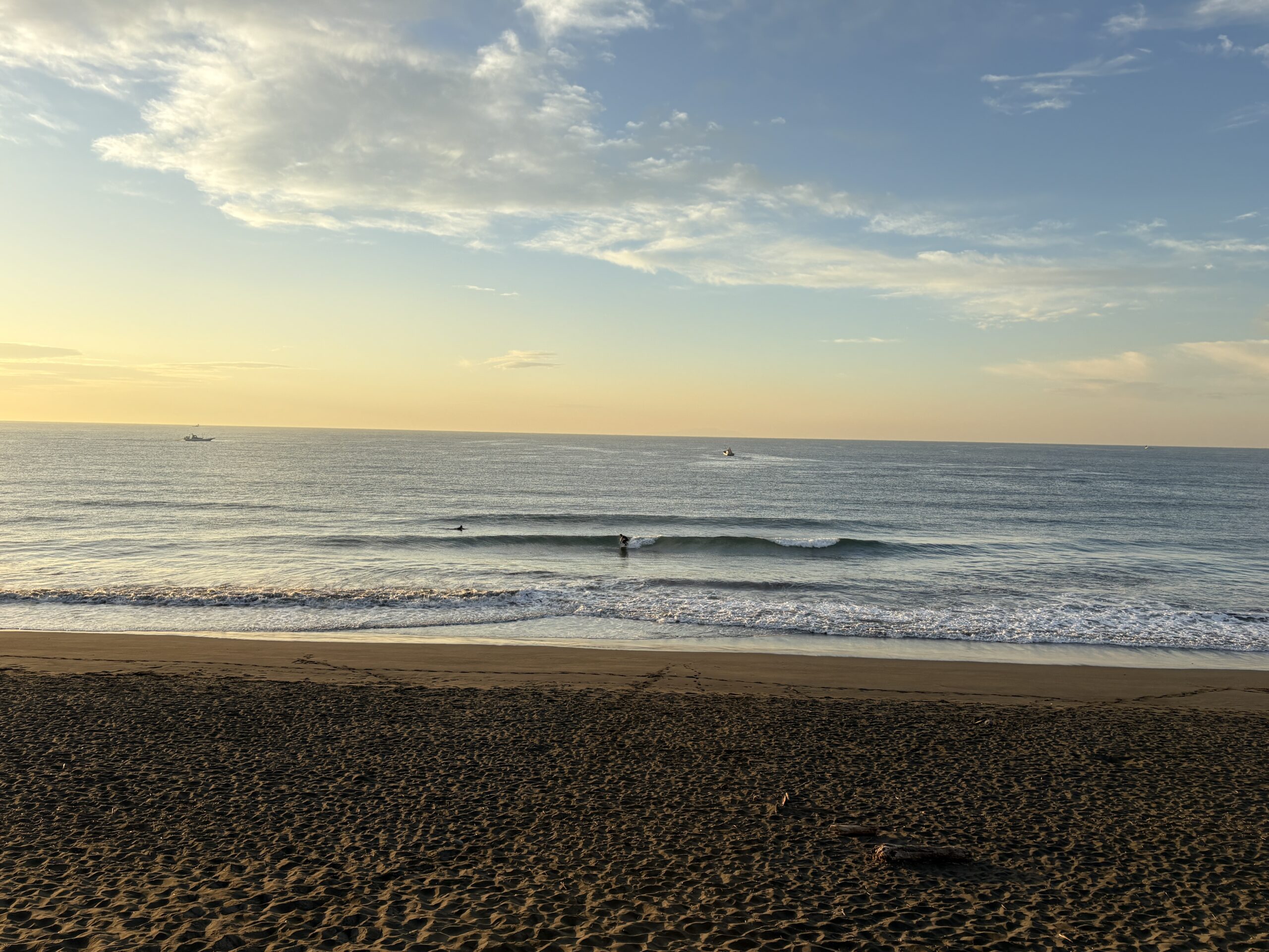 海は筋張った膝からモモ前後のウネリが入り、朝は辛うじて潮が引いているのでブレイクしていますが、インサイド寄りのショートライドな感じです。
