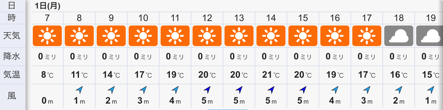 さて、今日の天気は晴れの予報。今朝は空気が冷え肌寒く雲の多い空ですが、晴れの今日は20℃前後の気温になり暖かくなりそうです。