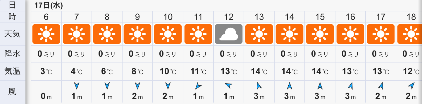 今日の天気は晴れ時々曇りの予報。今朝は無風で雲が無くブルースカイの気持ちの良い晴れです。