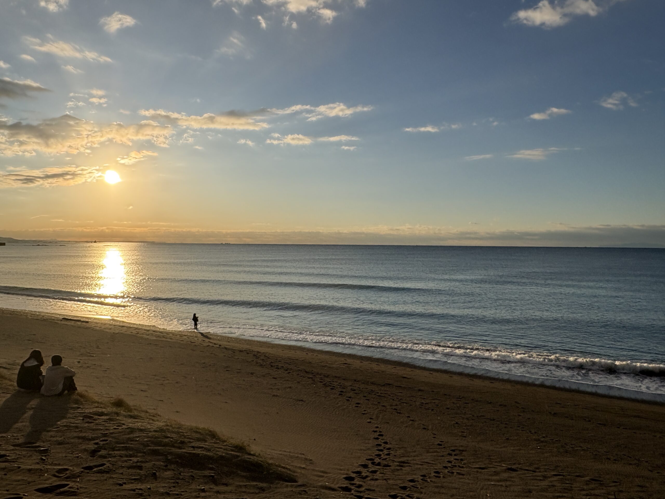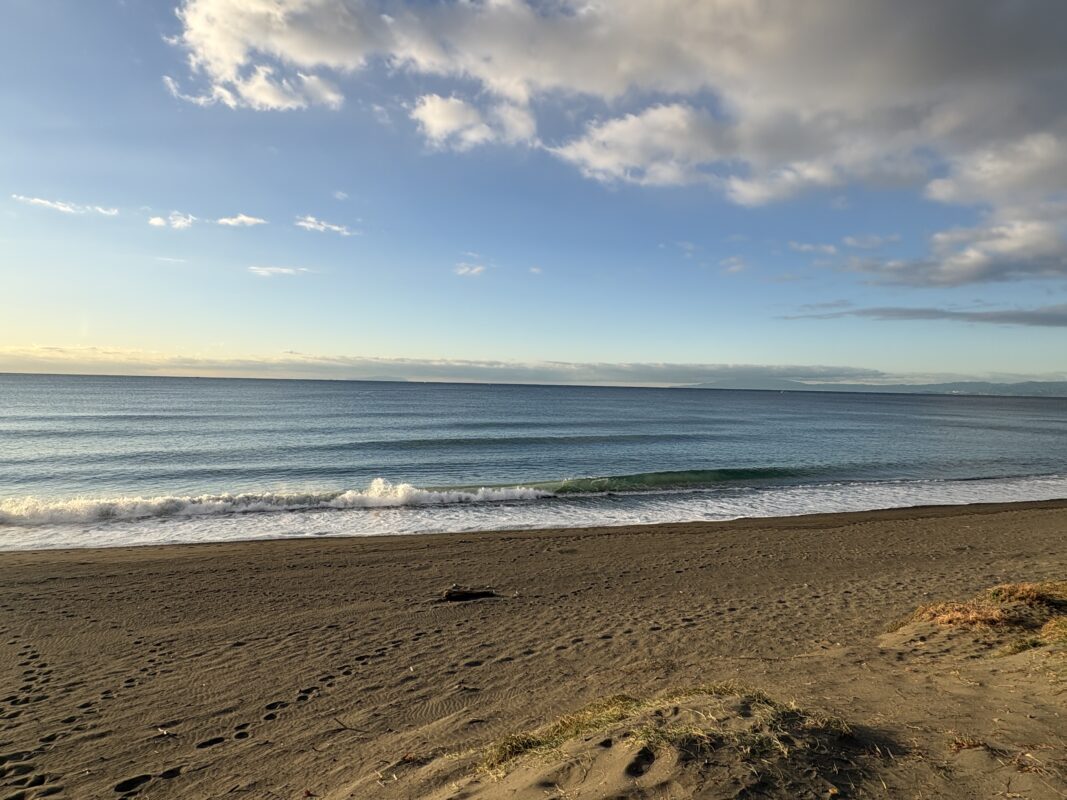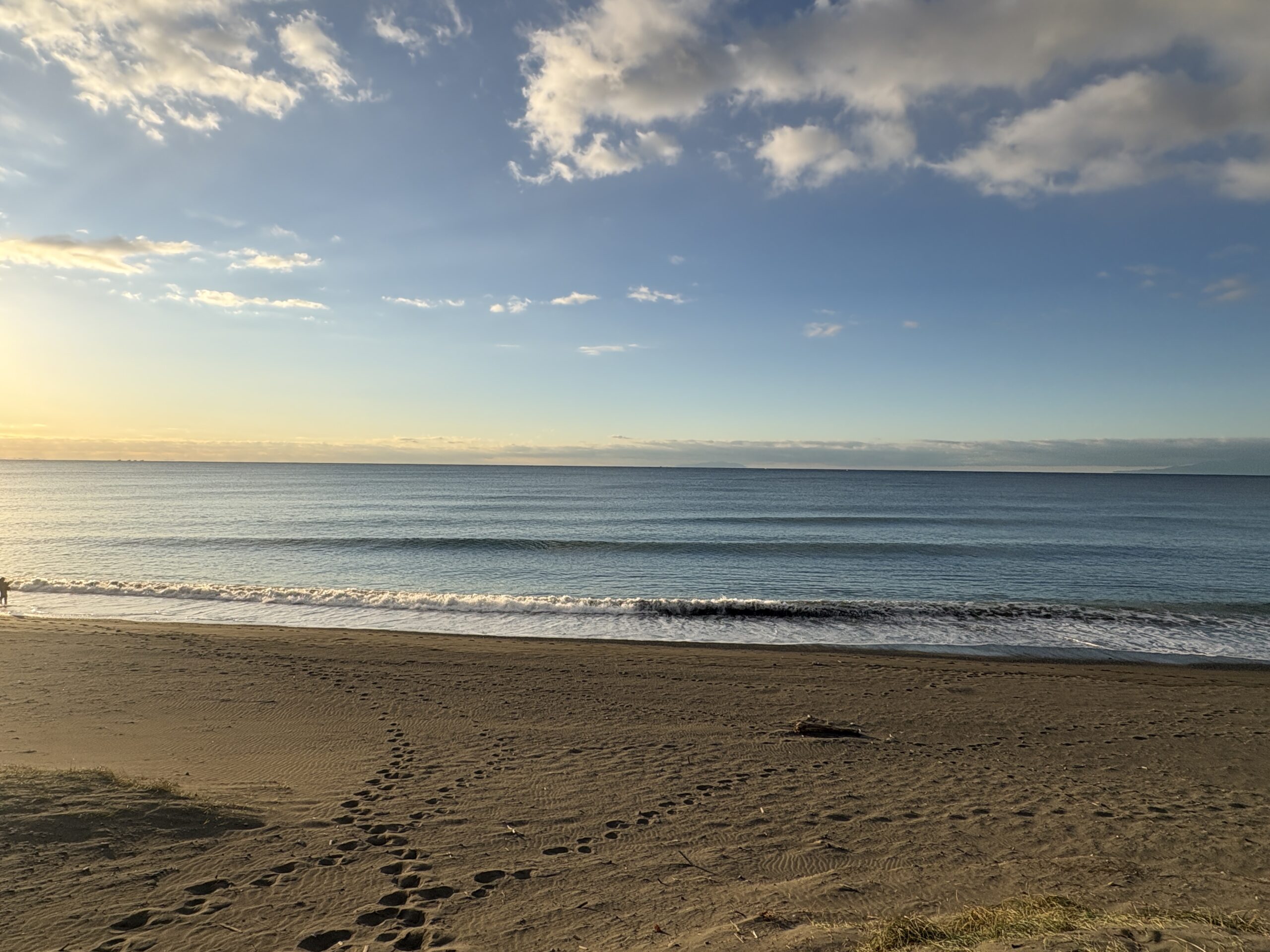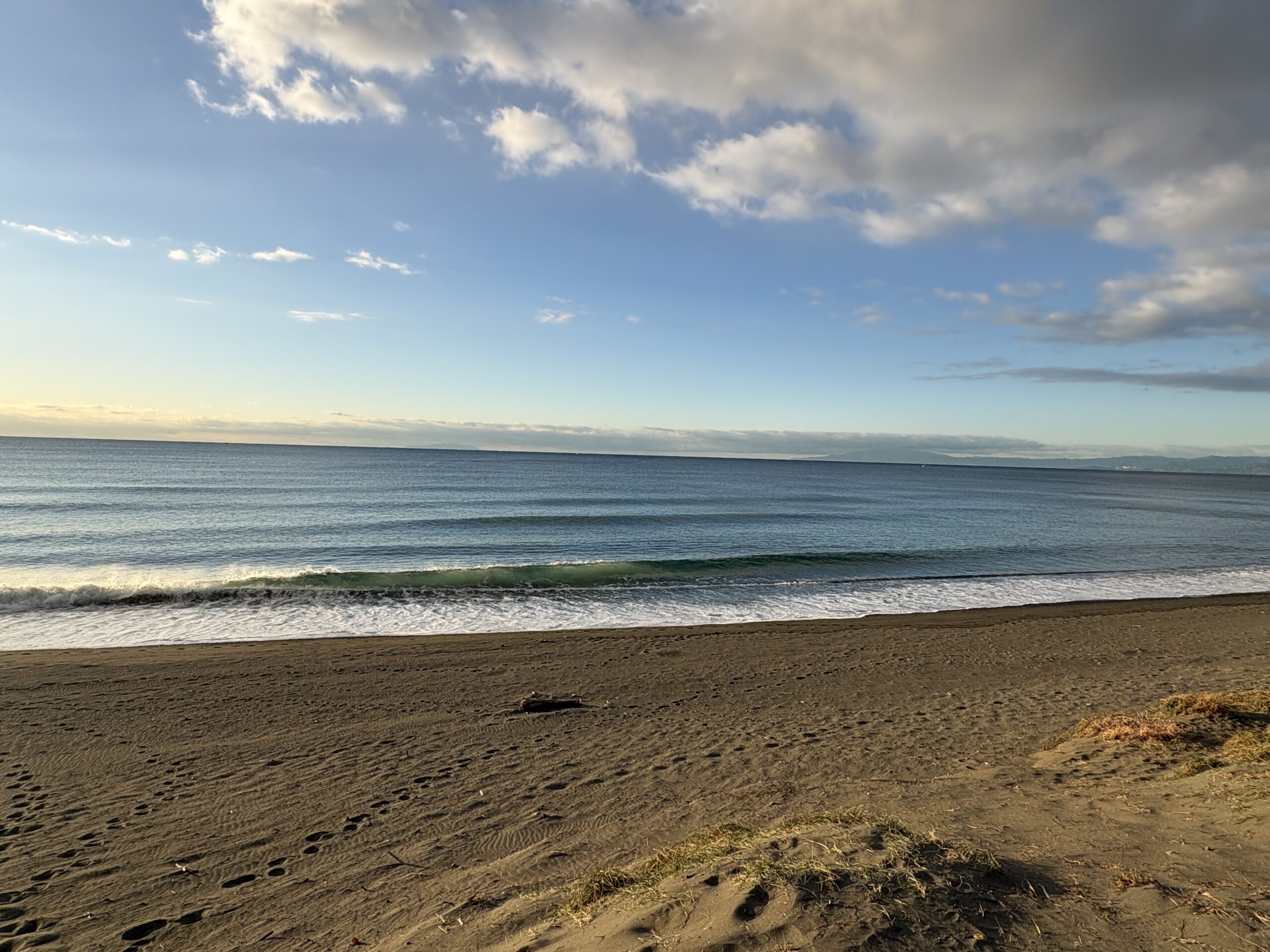 今日の天気は曇りのち晴れの予報。今朝は雲の多かった夜明け時から波チェック時には雲も抜け、朝日が差して来て日中は青空が広がる晴れになりそうです。