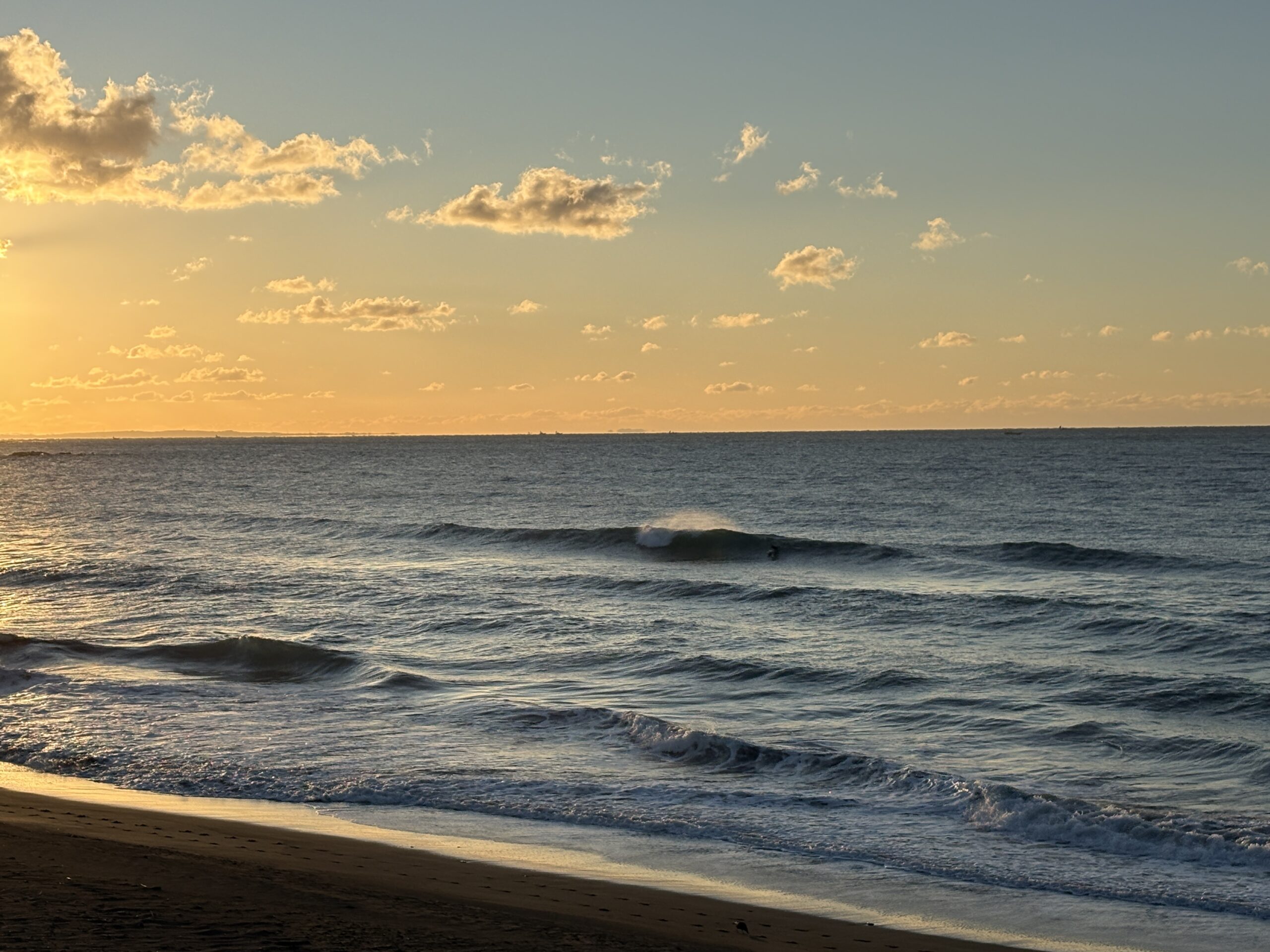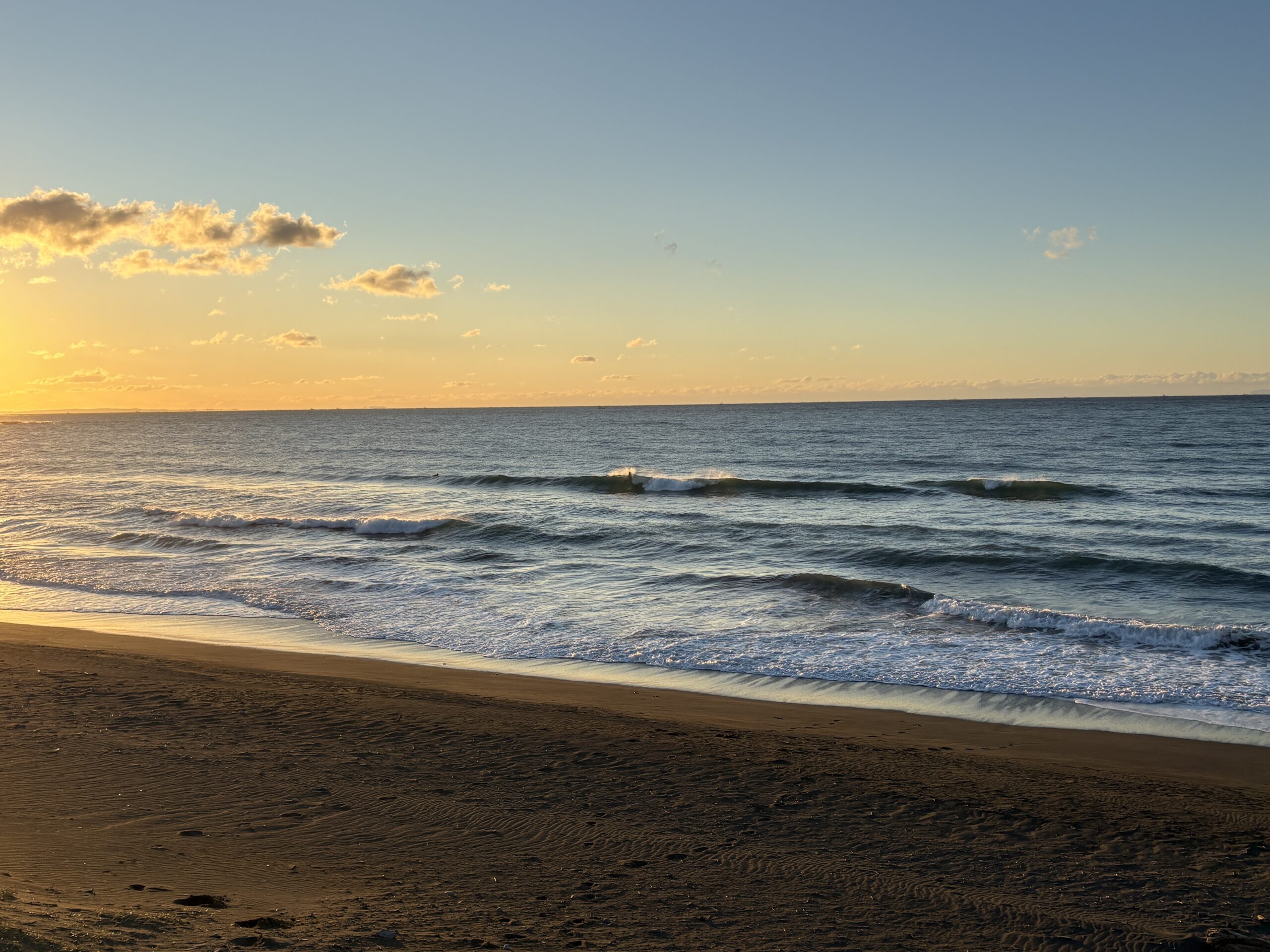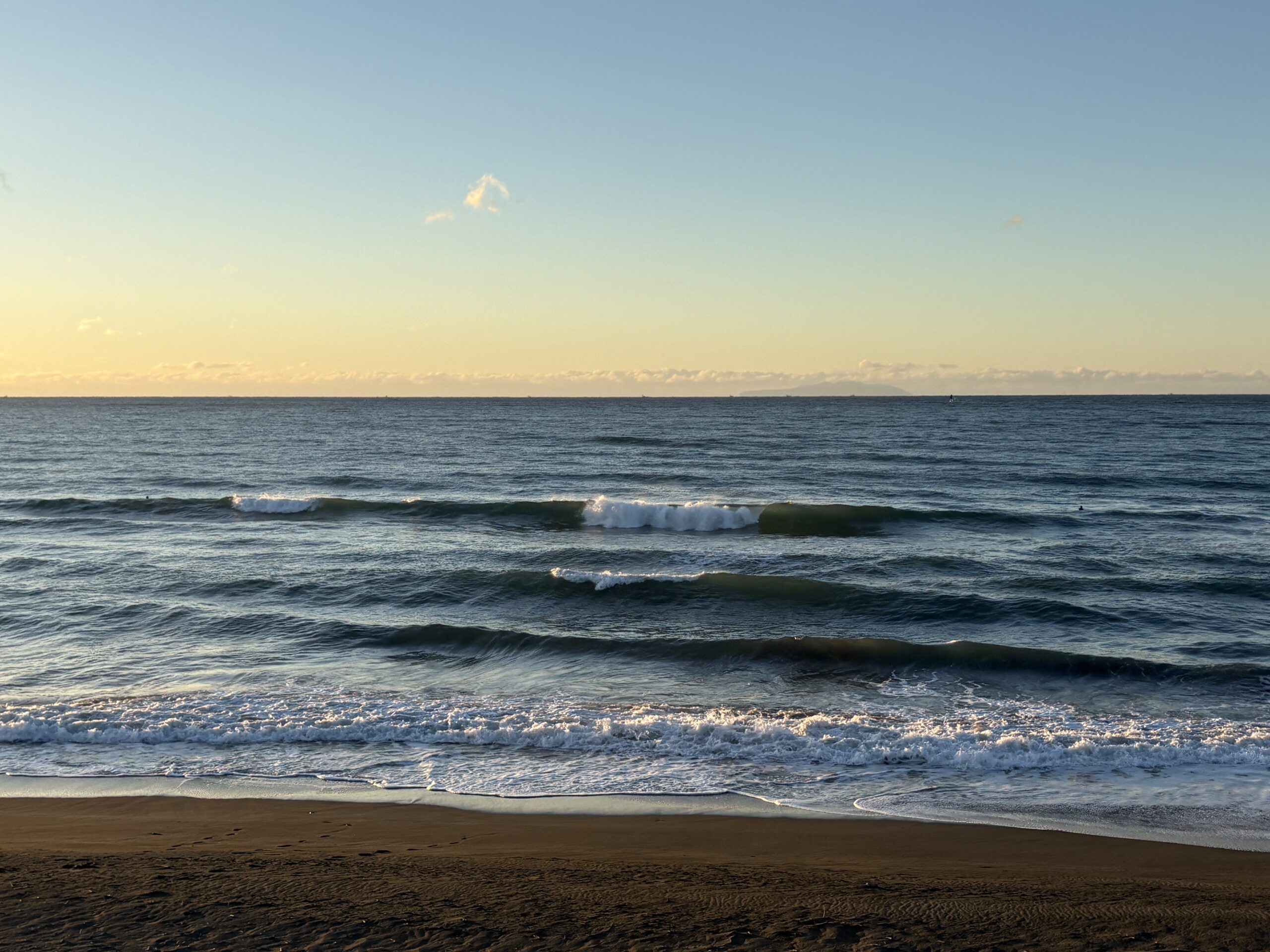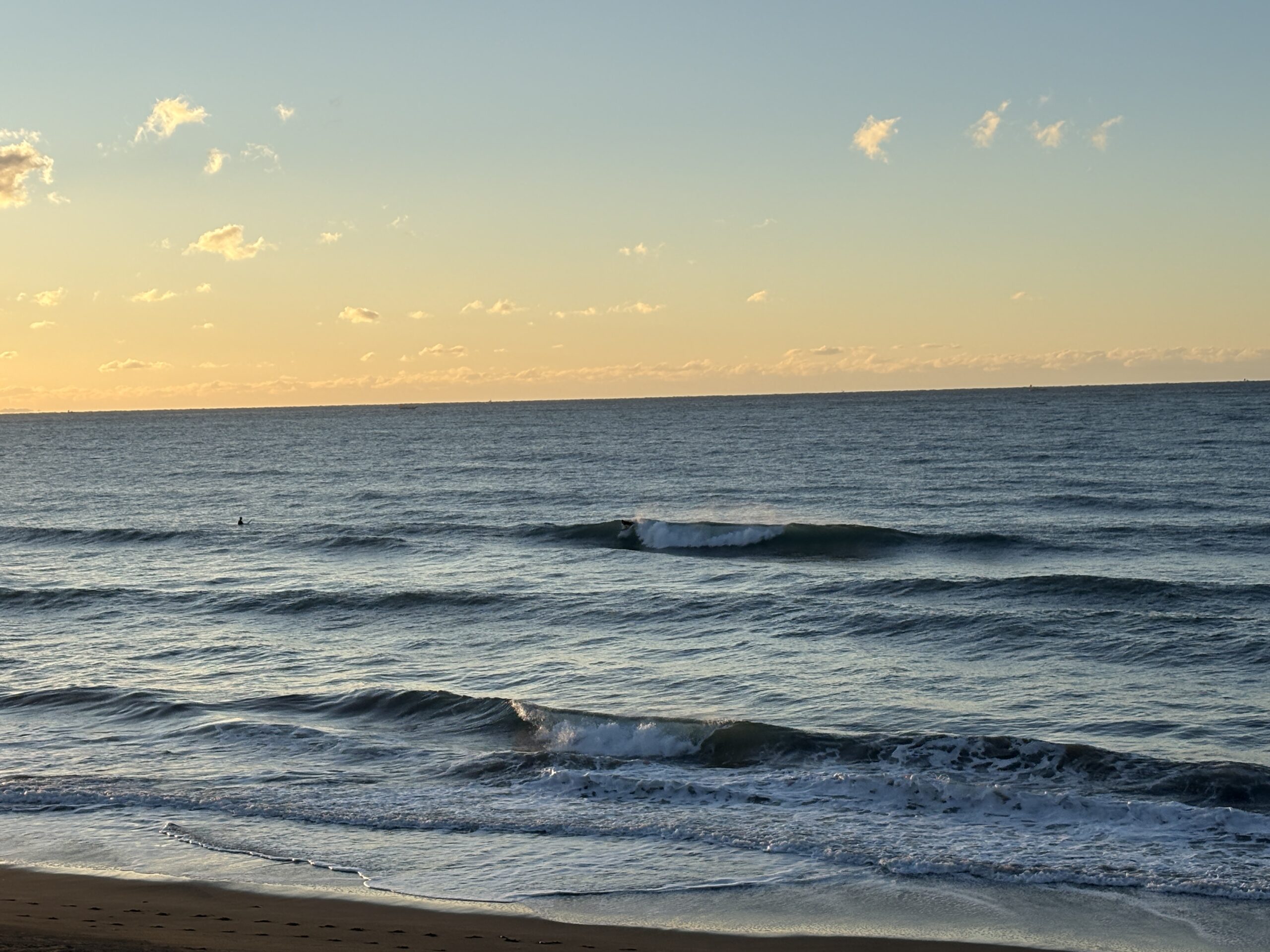 海は昨日まで吹き荒れた南西風の風が今朝は落ち着き、今朝は緩い北風が吹きオフの状態で、ガタついたバラつく力の無さそうな腰前後の波が柳島から西浜までの各所でブレイクしています。