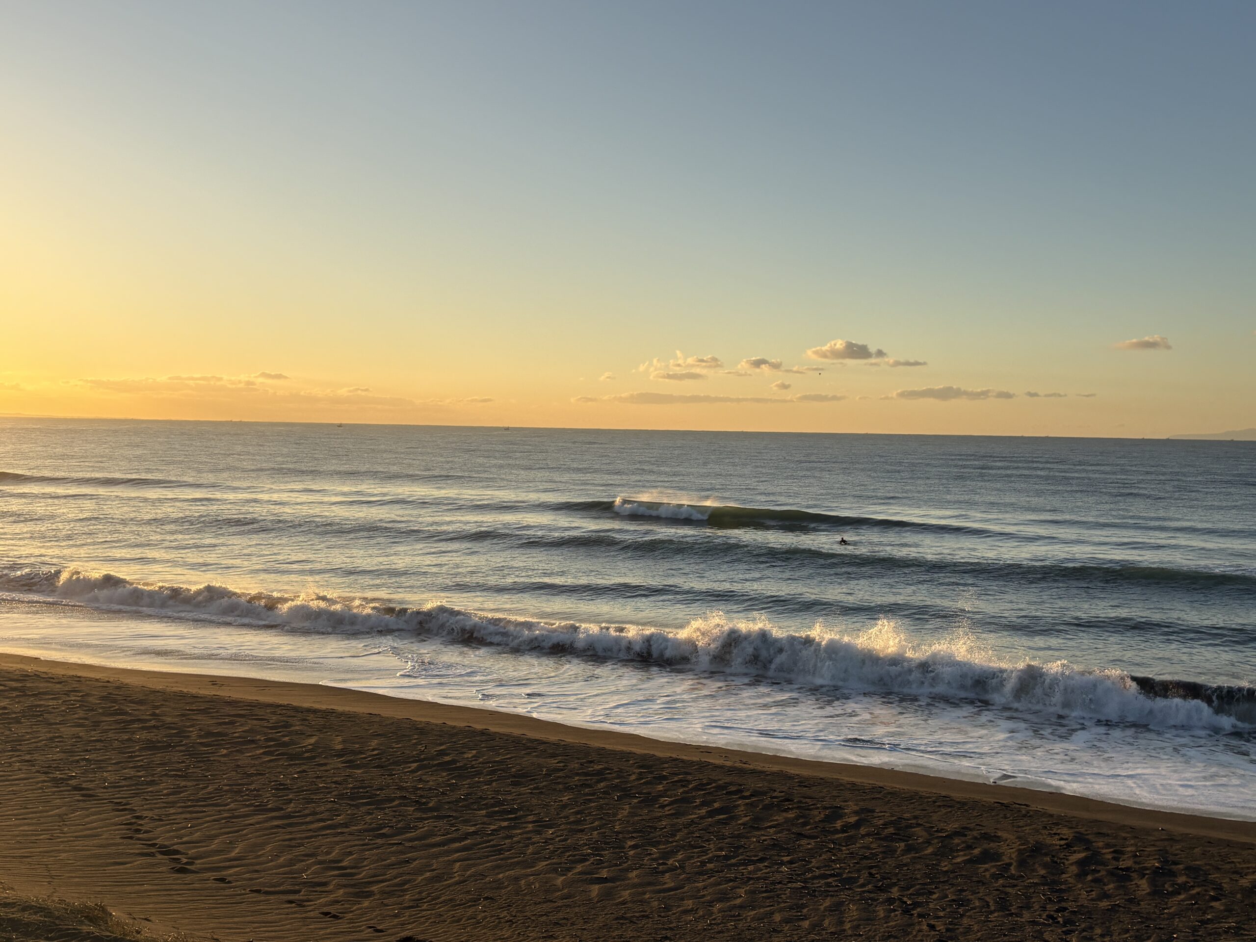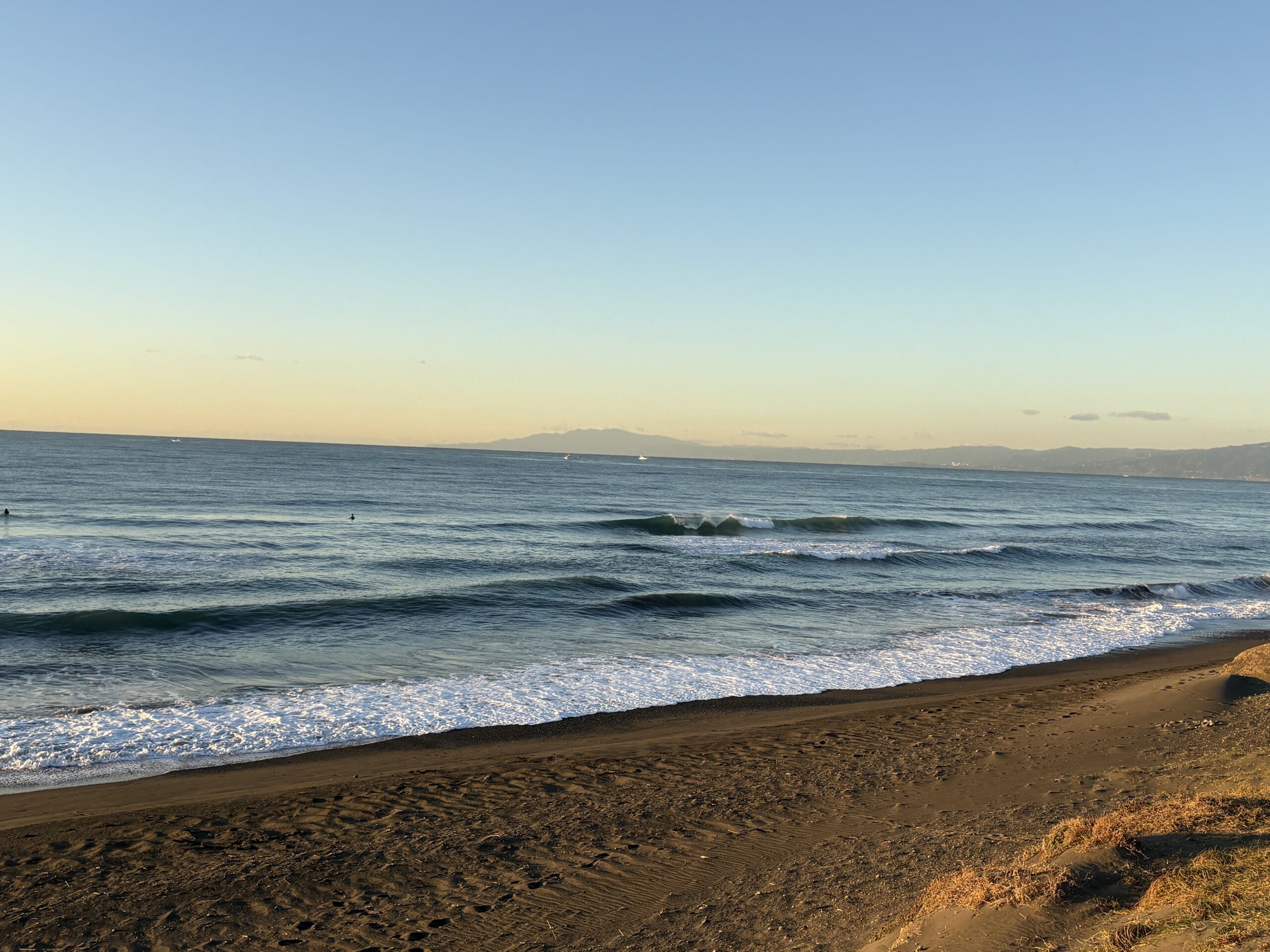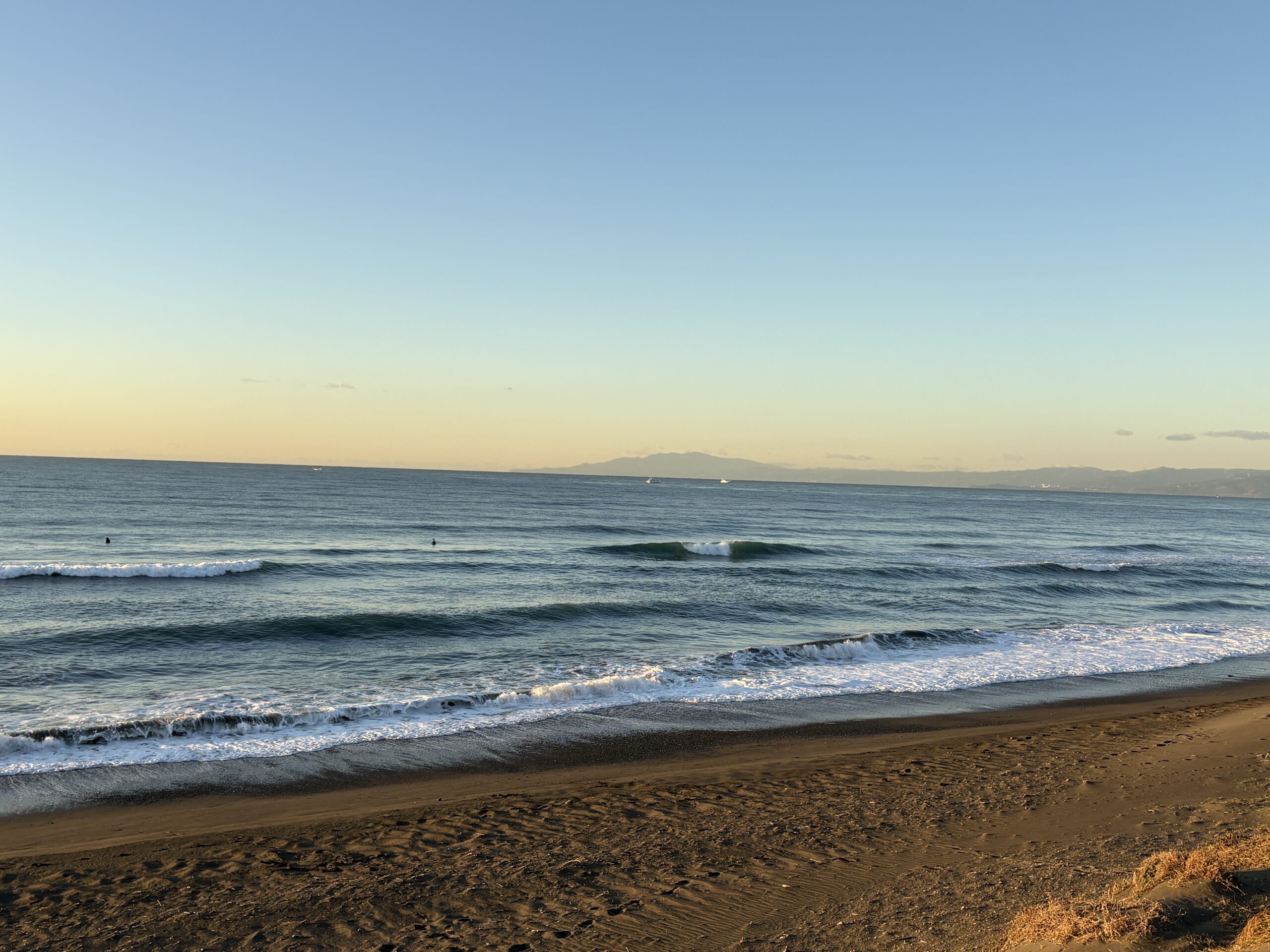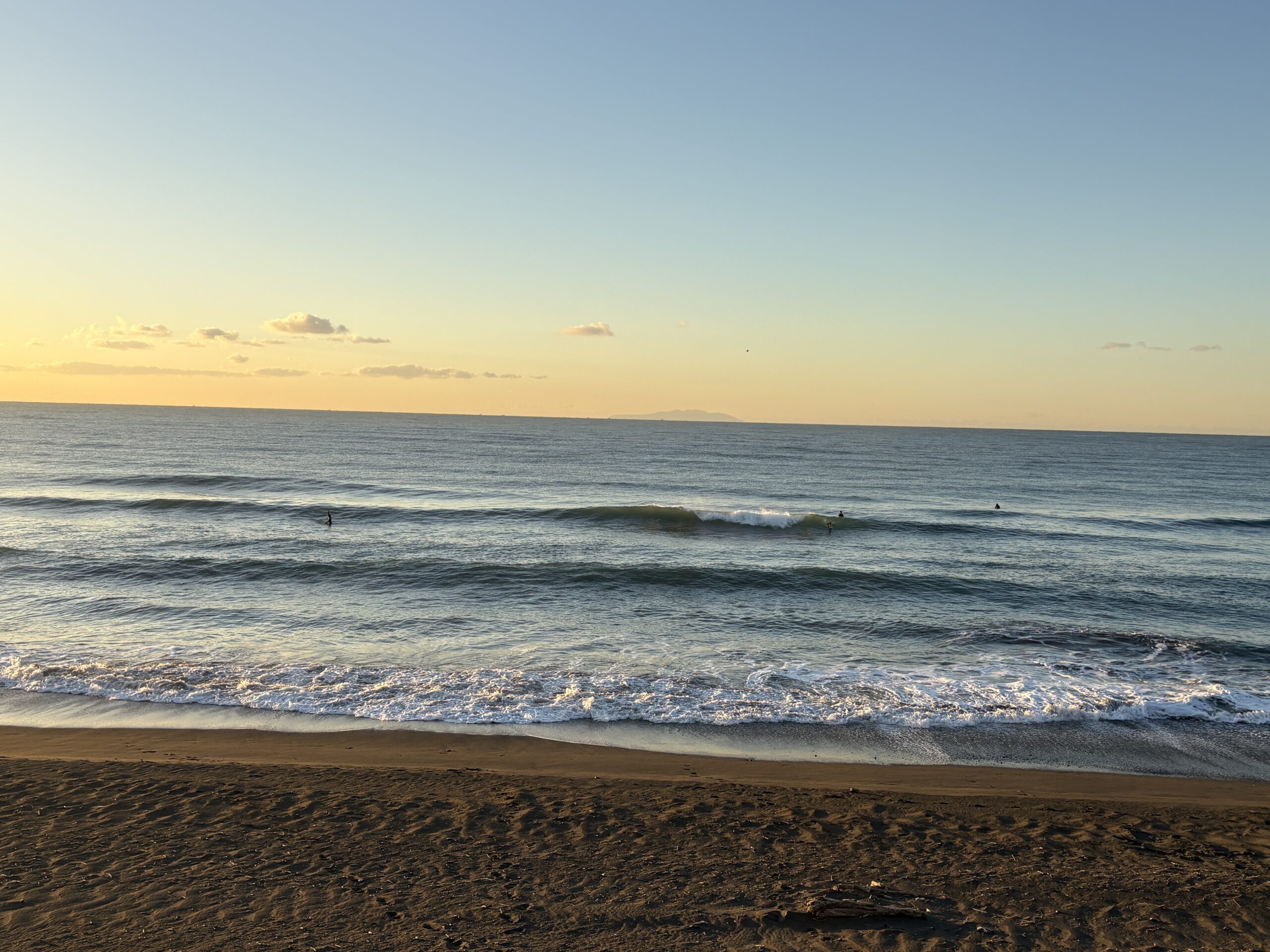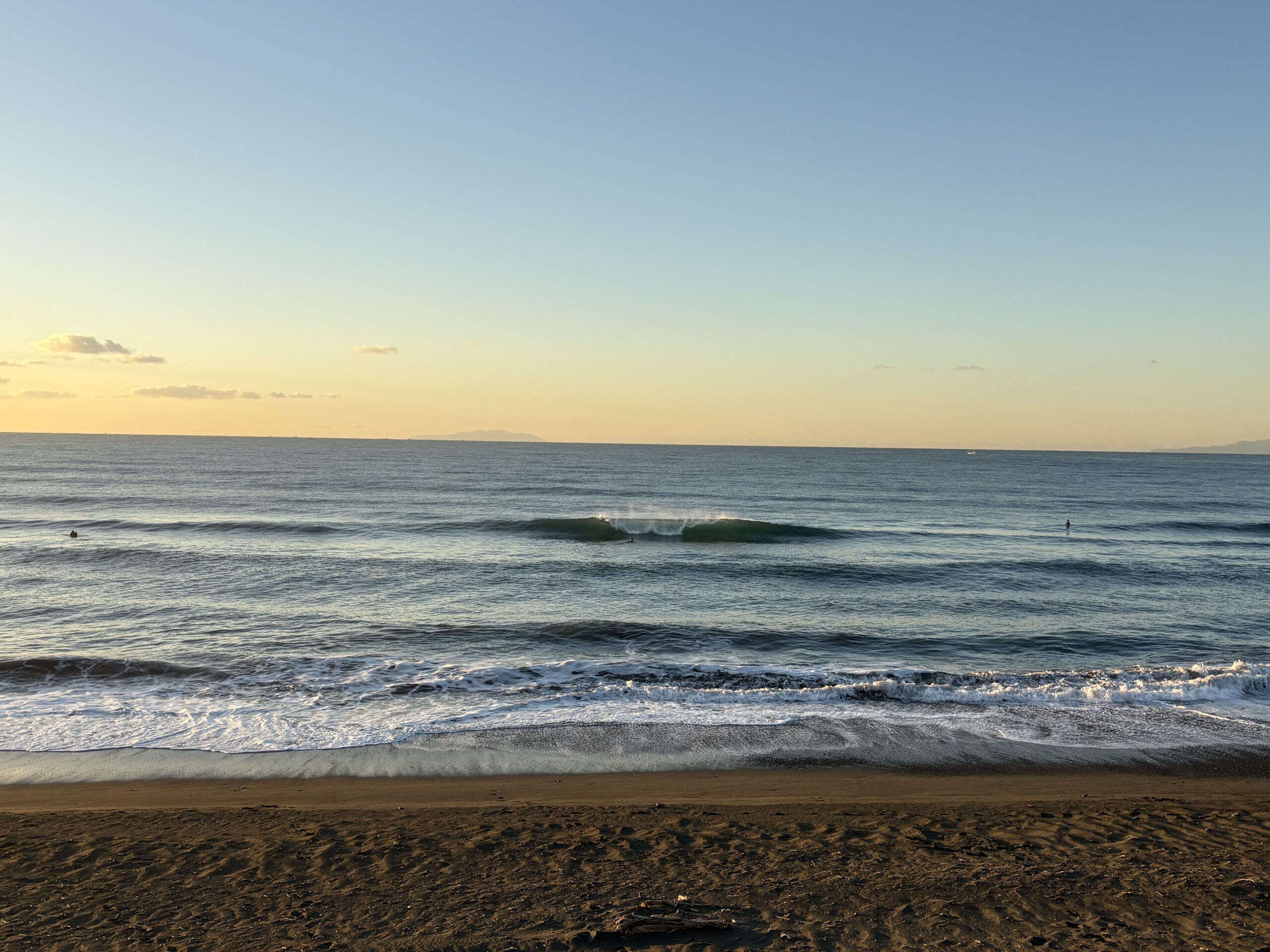 海はクリーンな海面に腰から腹前後のたまに入るセットで胸近くの波が柳島から西浜までの各所でブレイクしています。