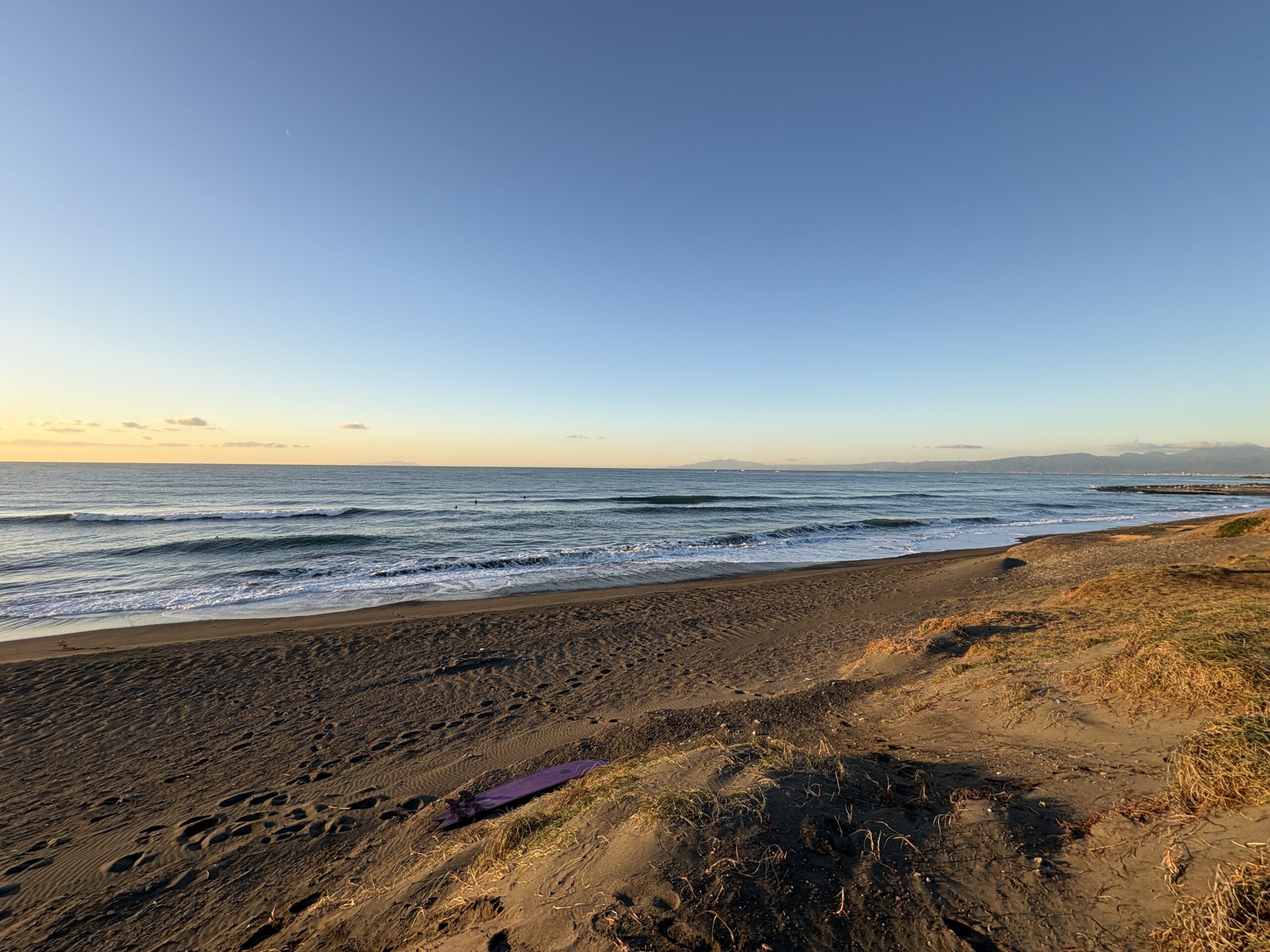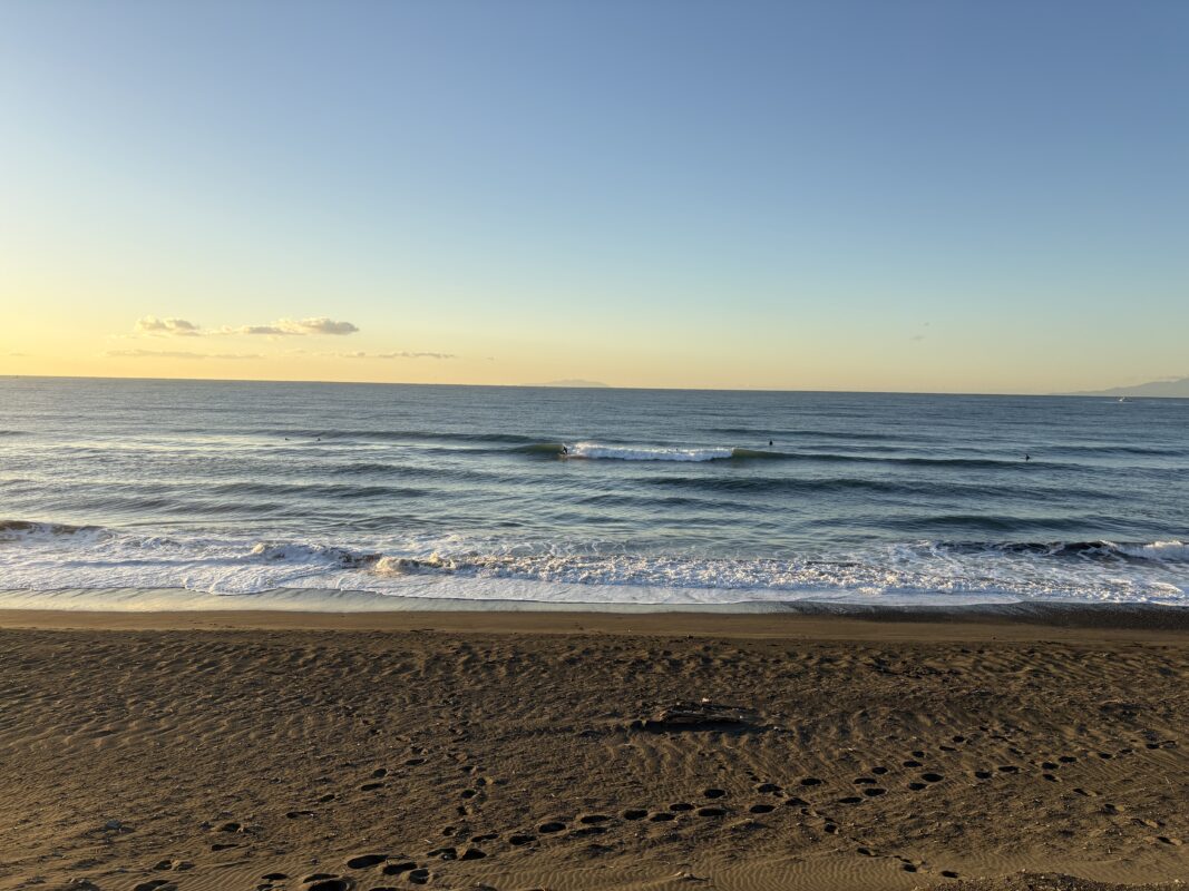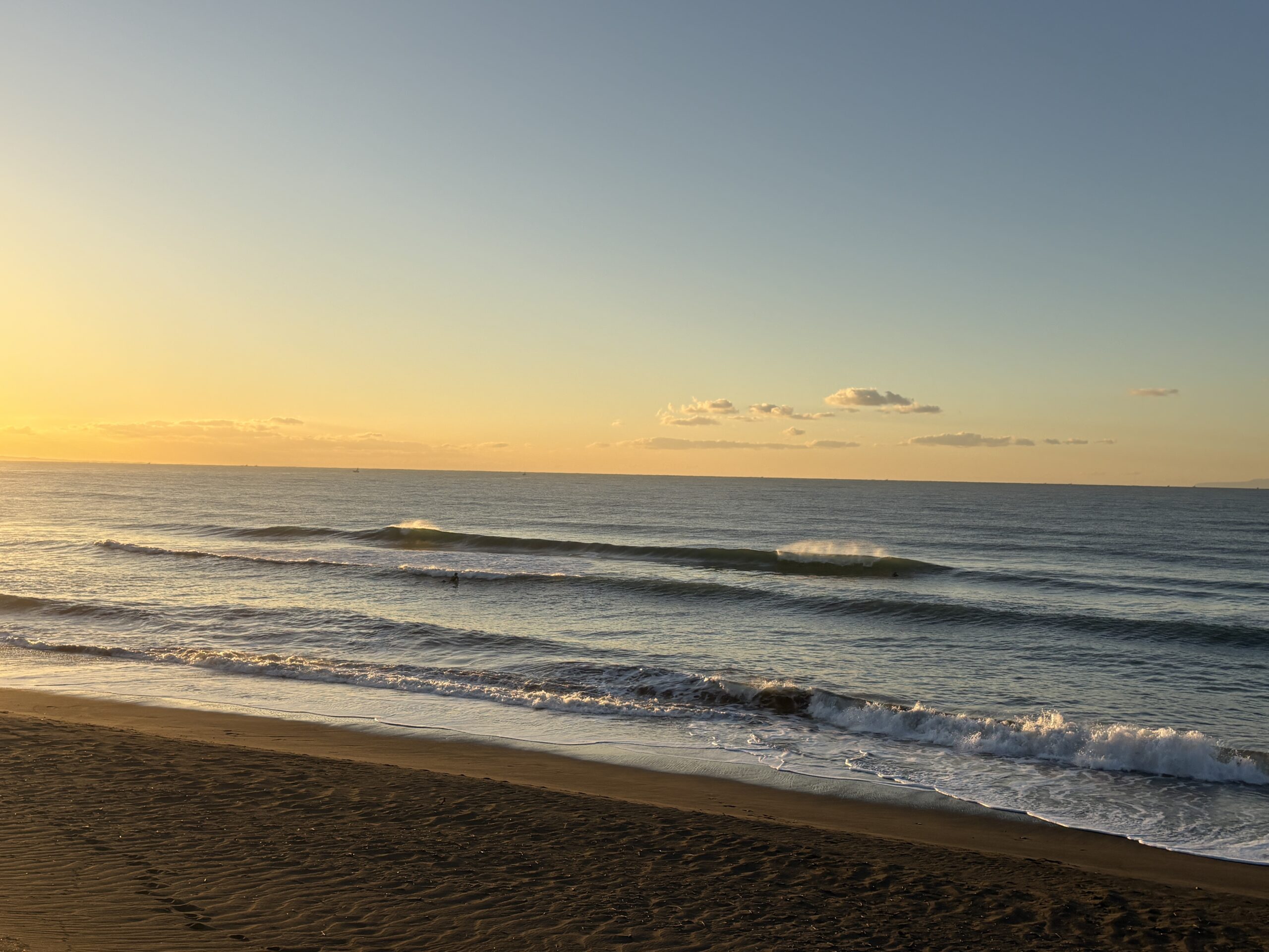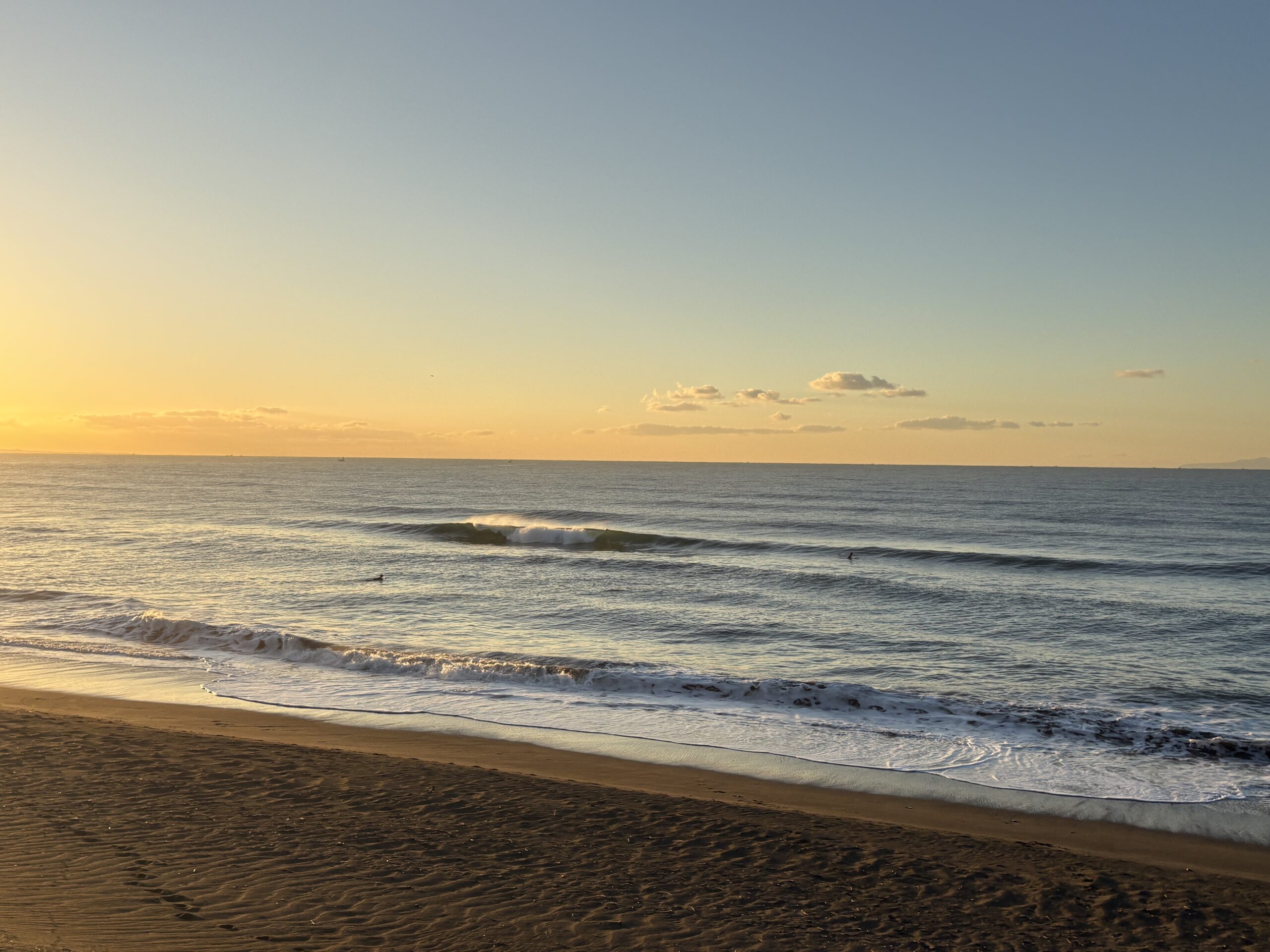 海はクリーンな海面に腰から腹前後のたまに入るセットで胸近くの波が柳島から西浜までの各所でブレイクしています。