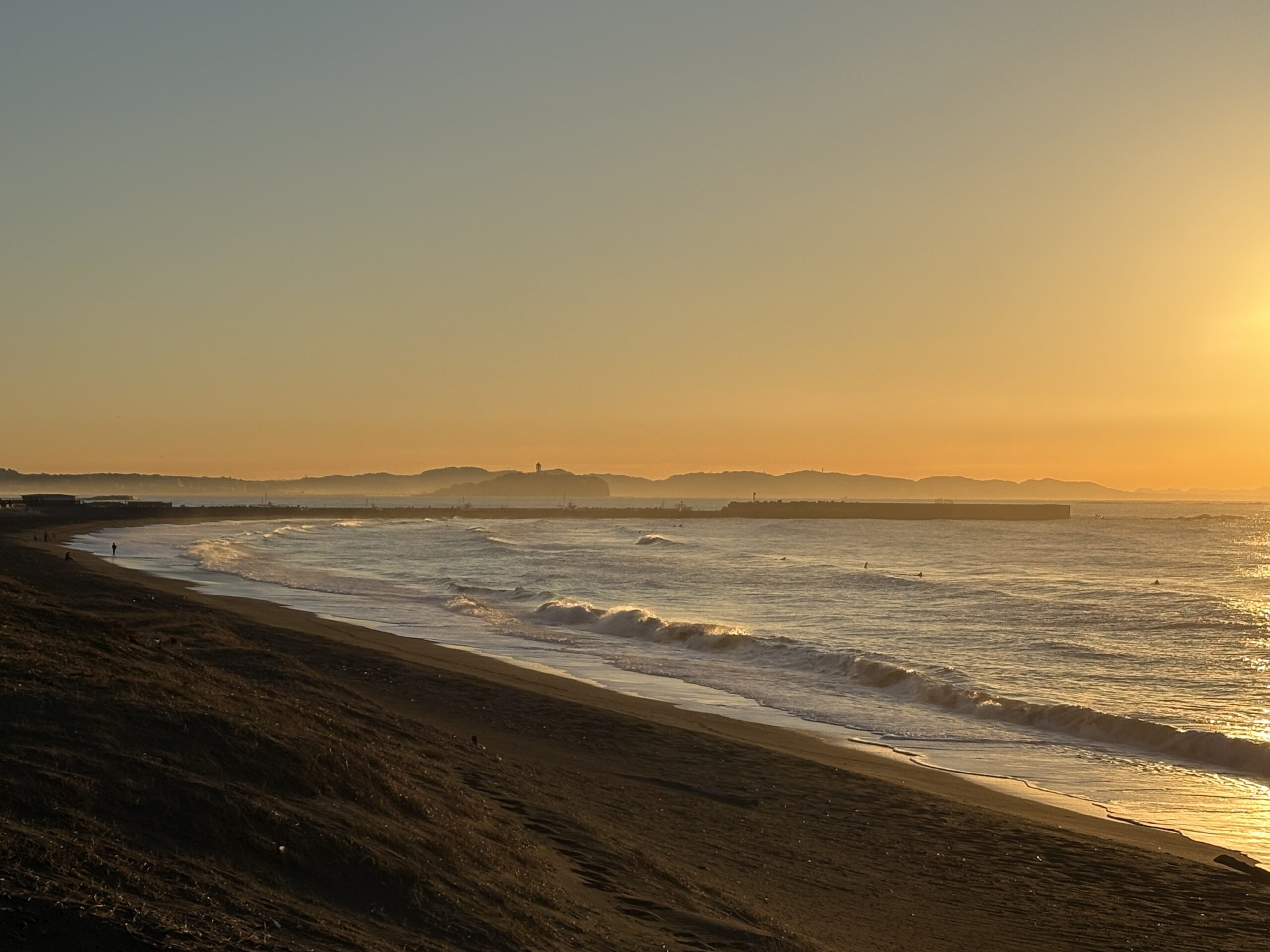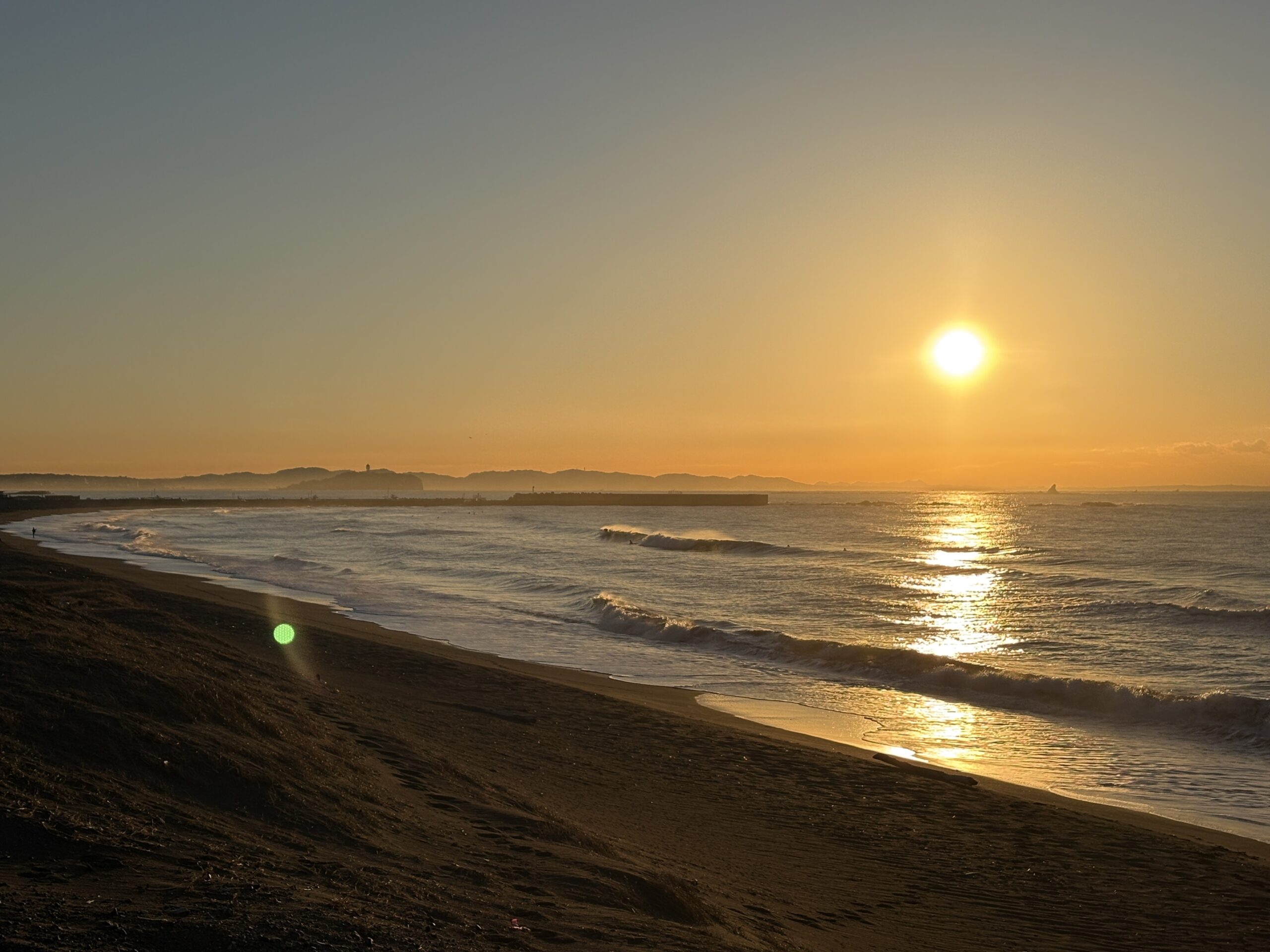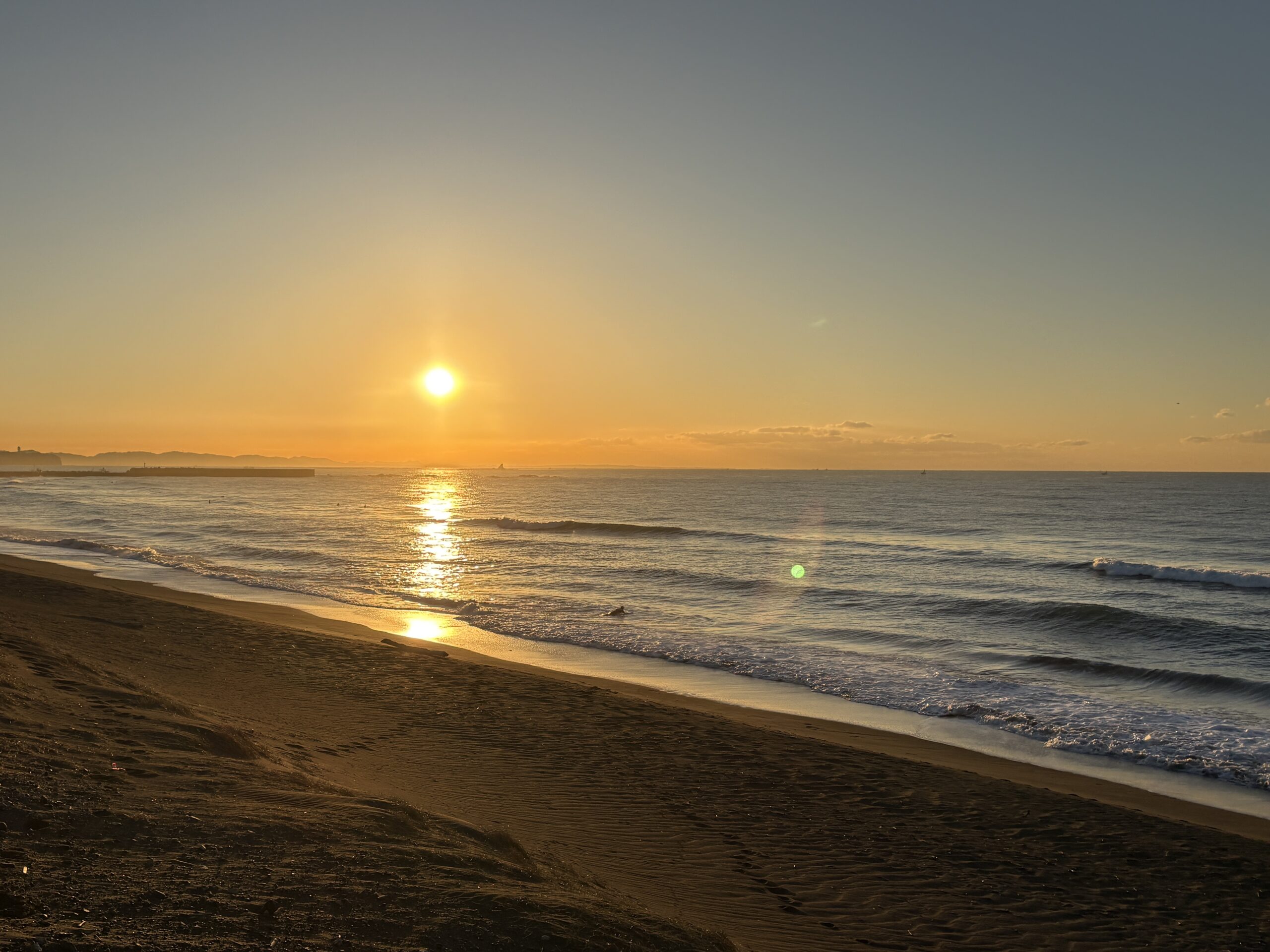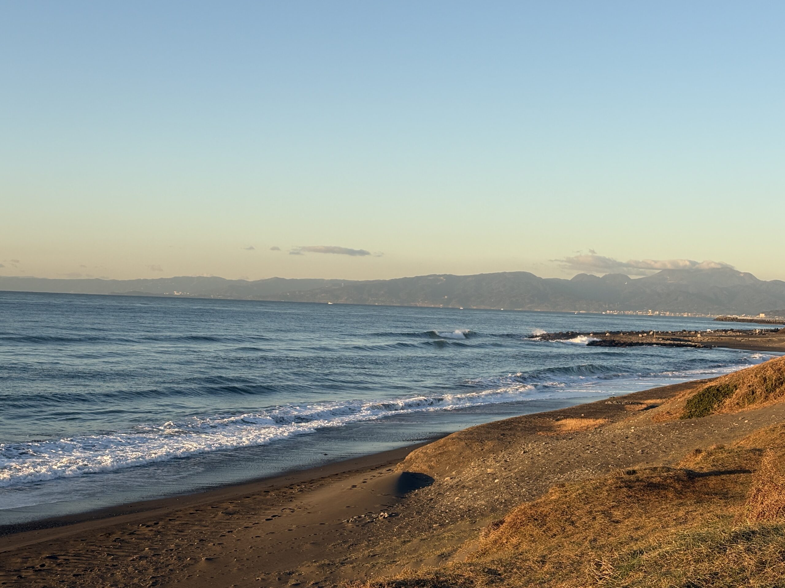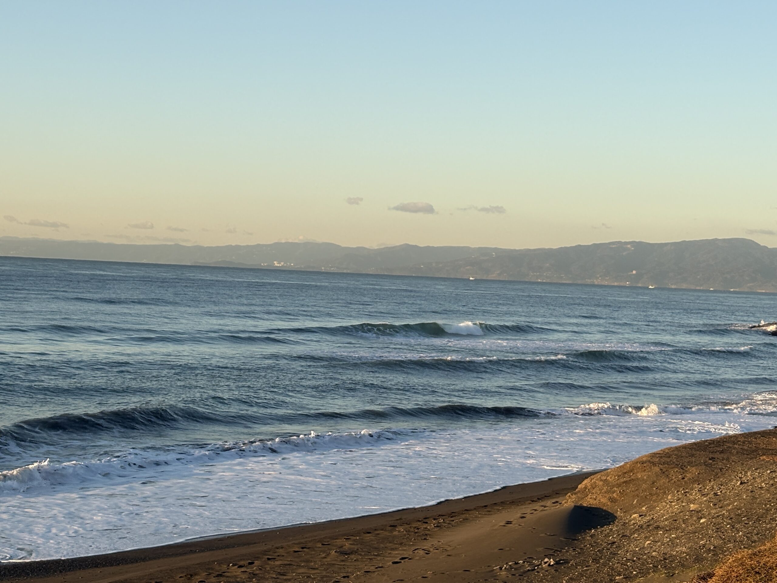 海はクリーンな海面に腰から腹前後のたまに入るセットで胸近くの波が柳島から西浜までの各所でブレイクしています。
