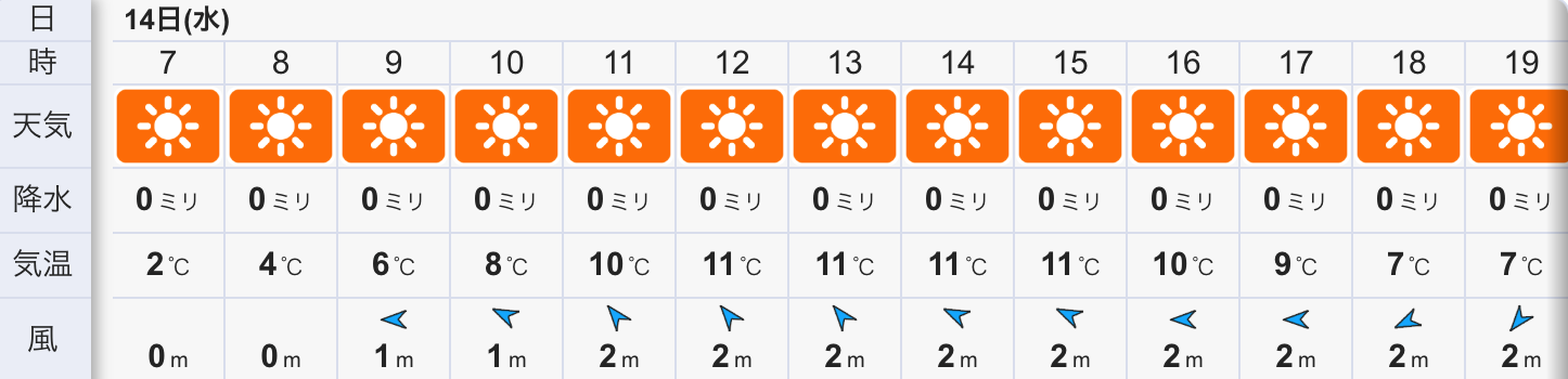今日の天気は晴れの予報。今朝は朝日が温かく感じ、風は無風で穏やかな状態の天気です。