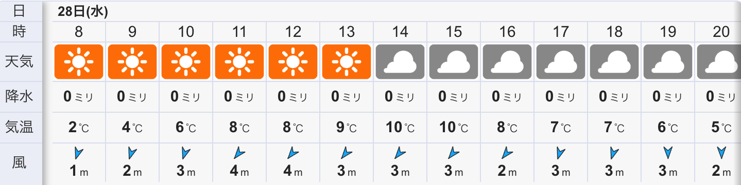 今日の天気は晴れのち曇りの予報。今朝は晴れて冷たい北風と放射冷却に寄り冷えた朝です。