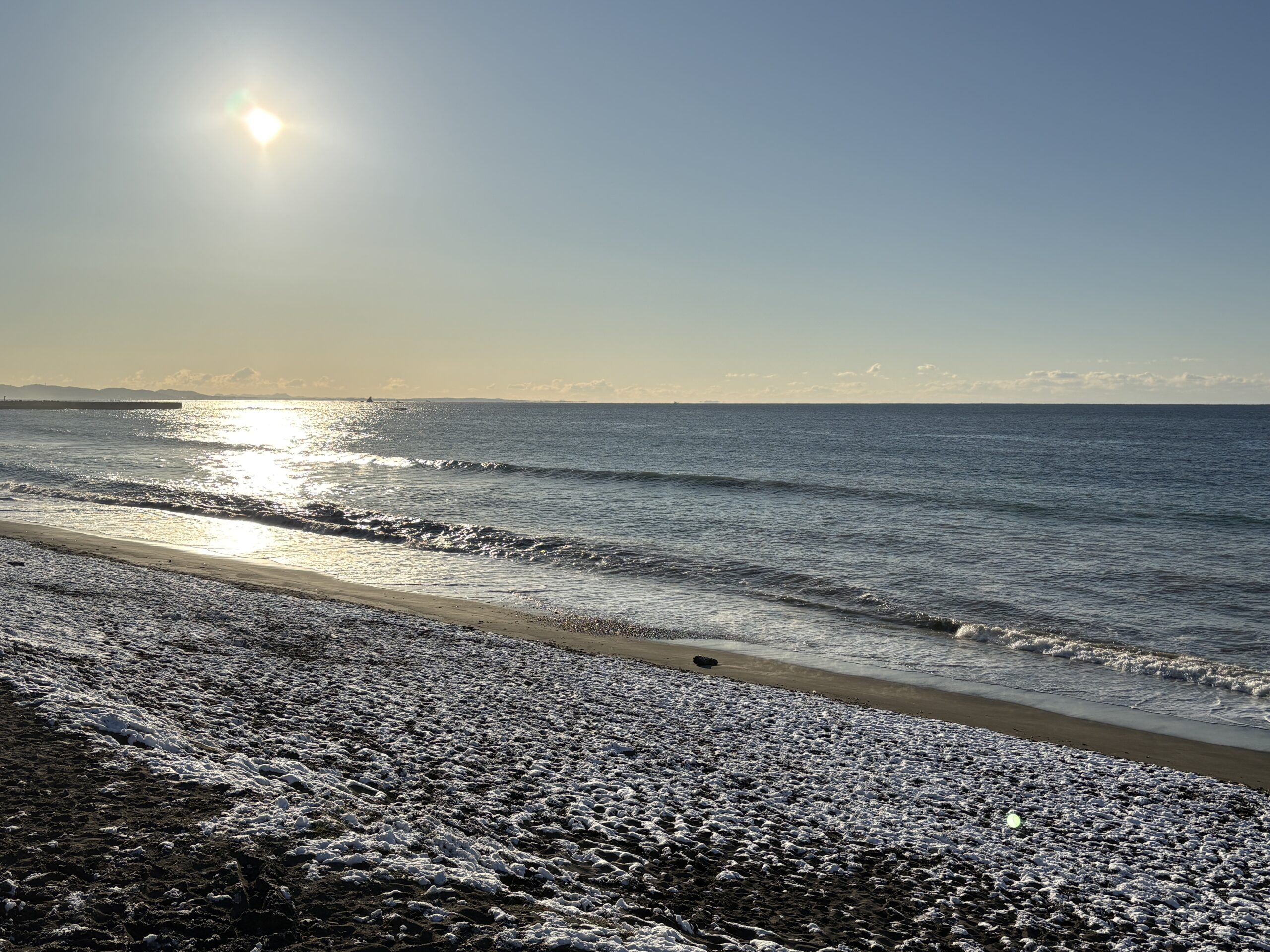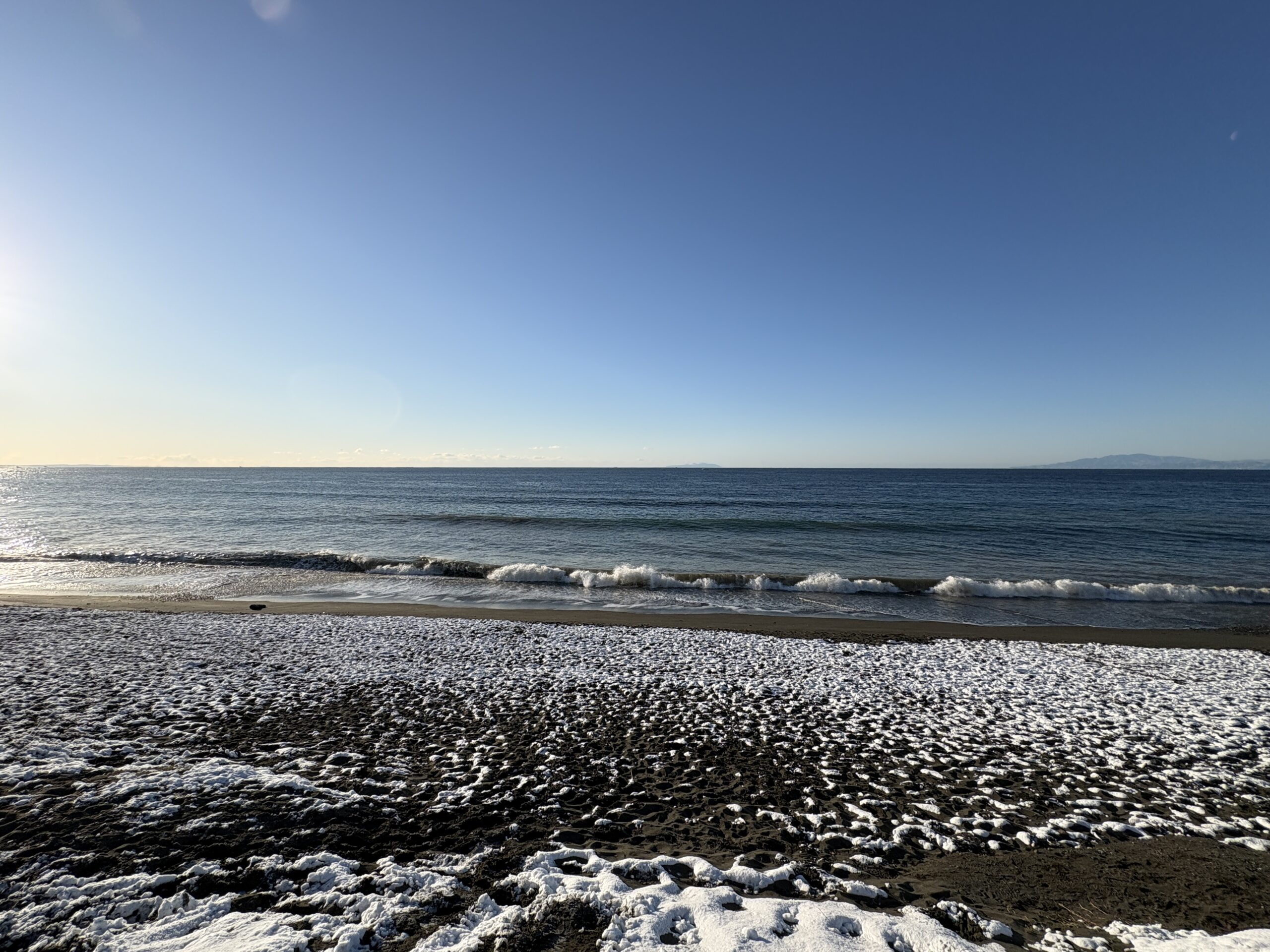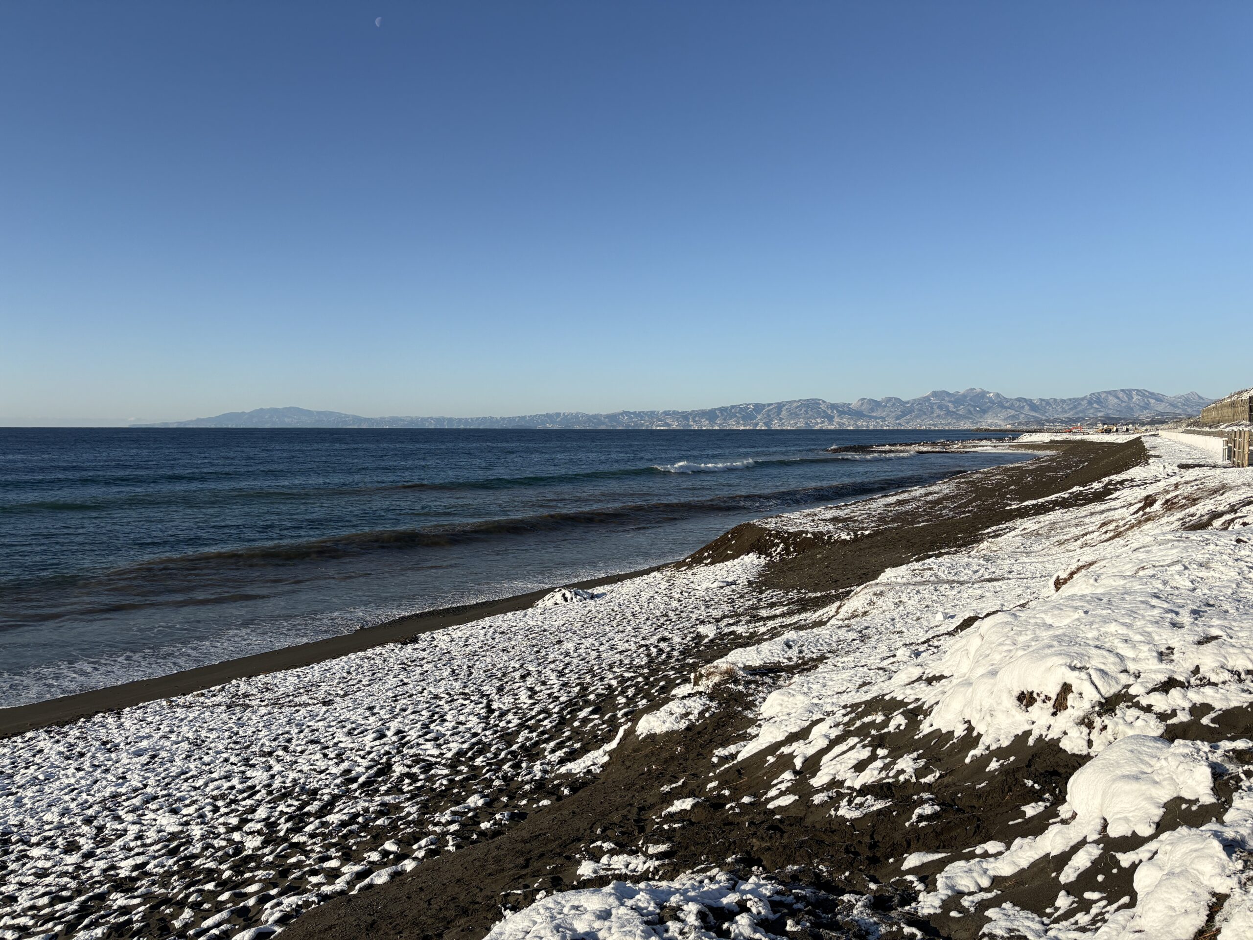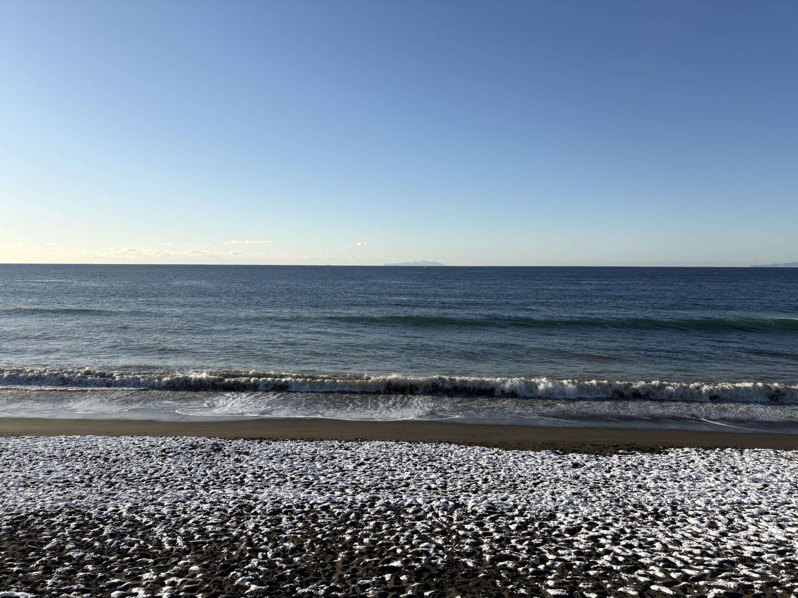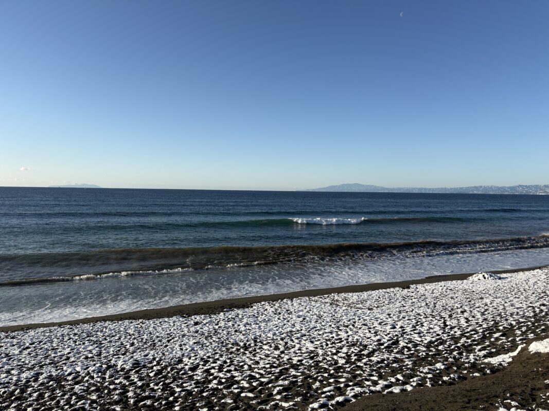 そして海は、昨日の午後にサイズアップしたウネリが若干残り、筋張ったモモから腰近いウネリが入りますが、朝は潮も上げており割れ辛く柳島看板前と西浜スピーカー前のみ沖でブレイクしています。但し厚めのブレイクです。