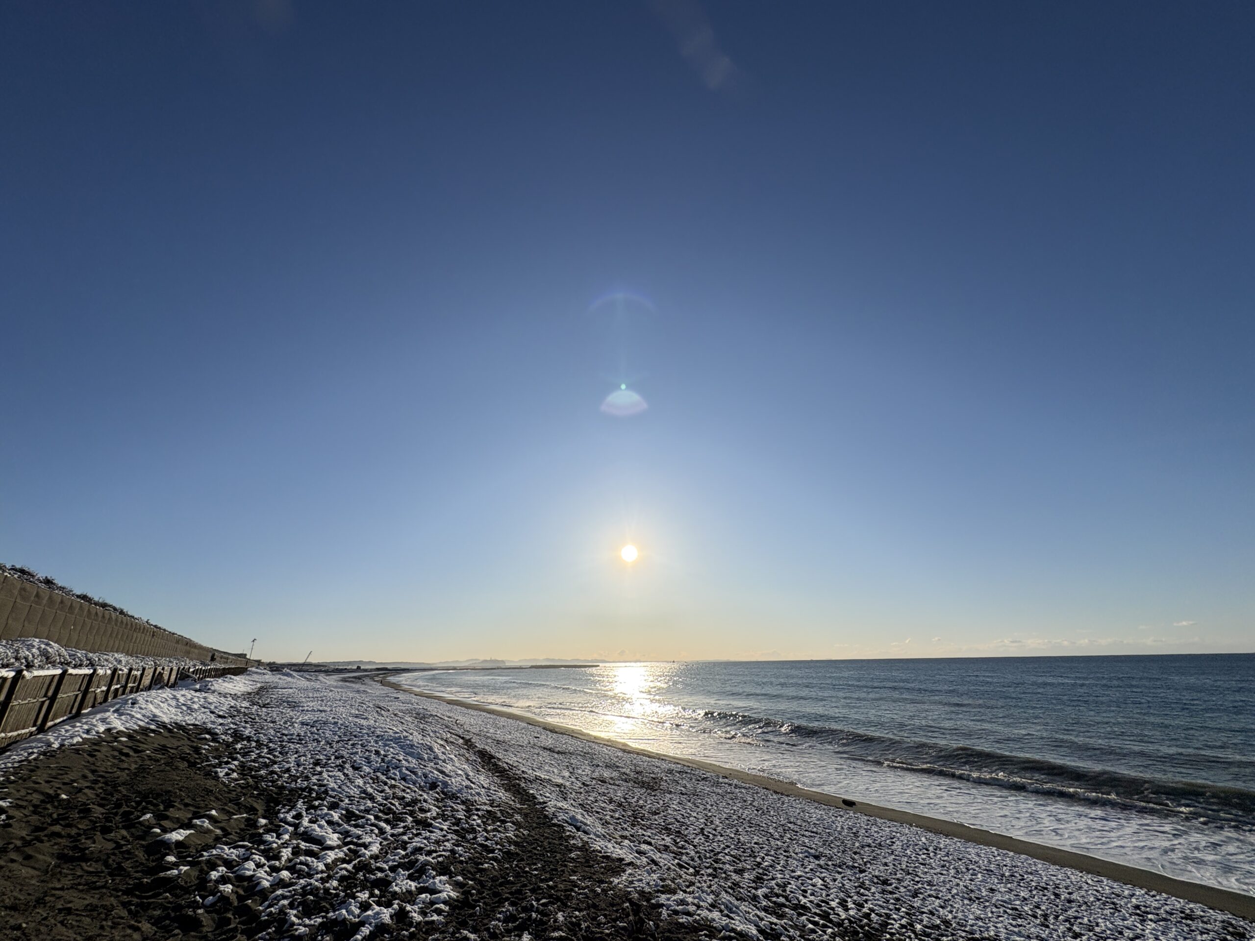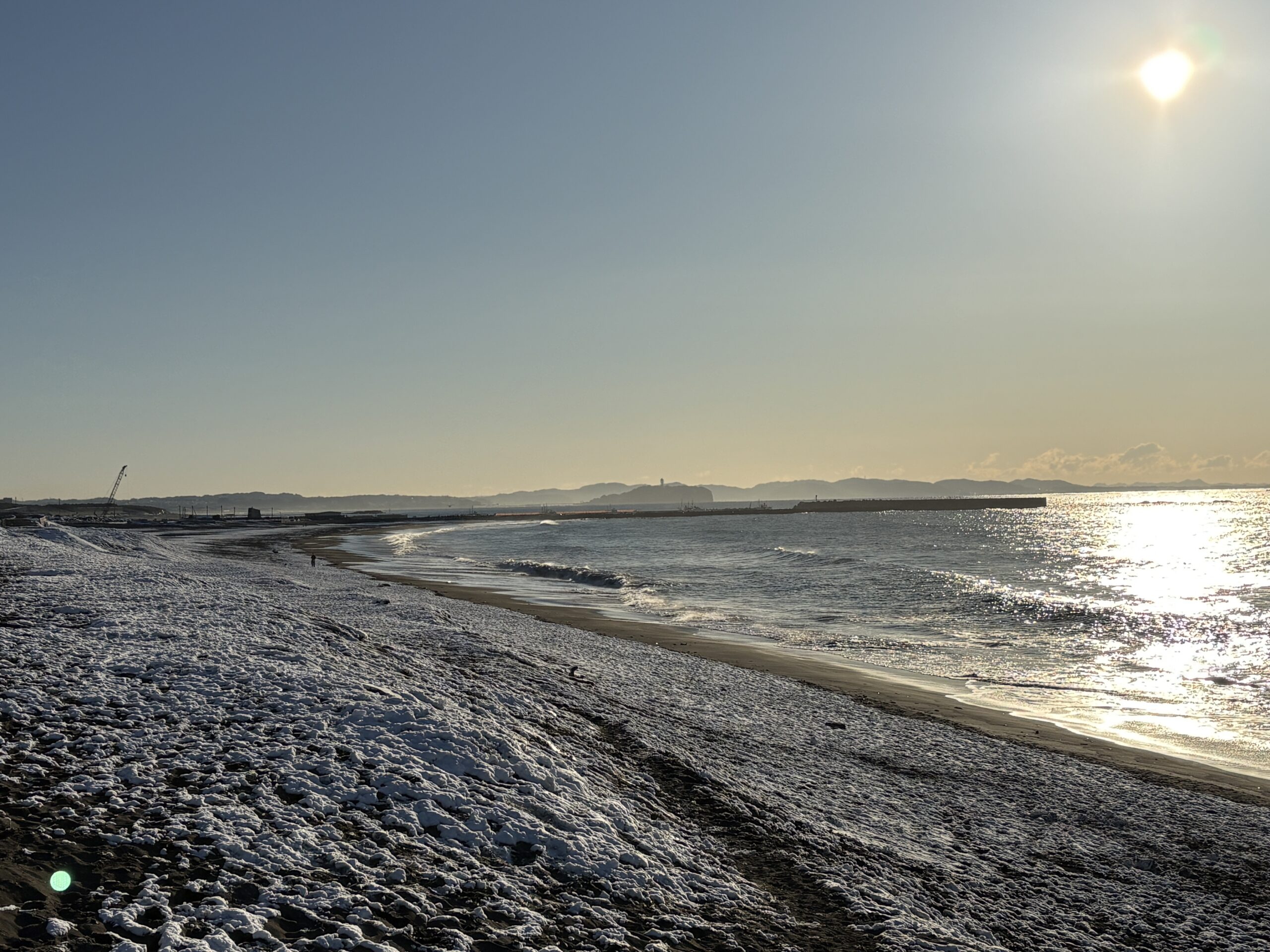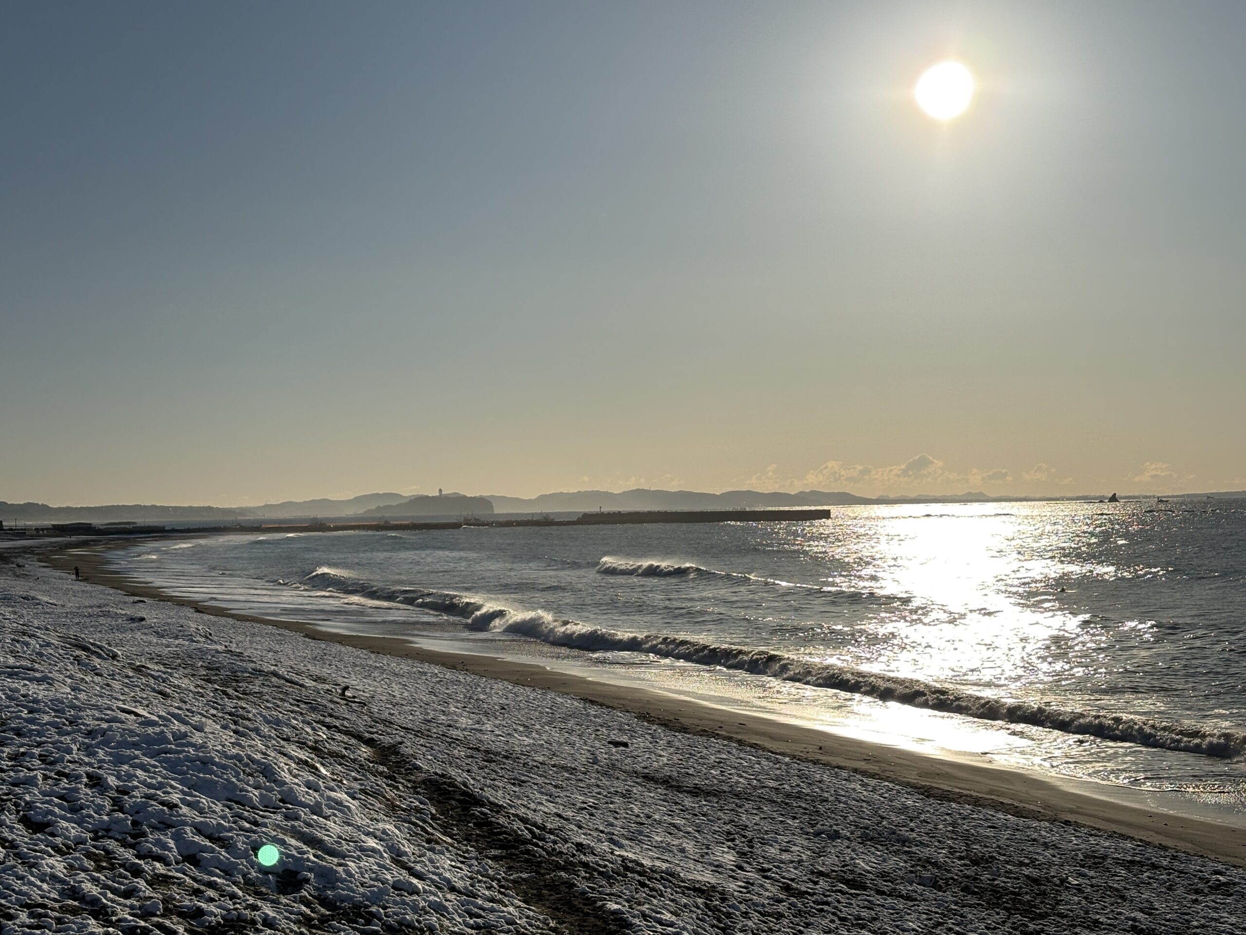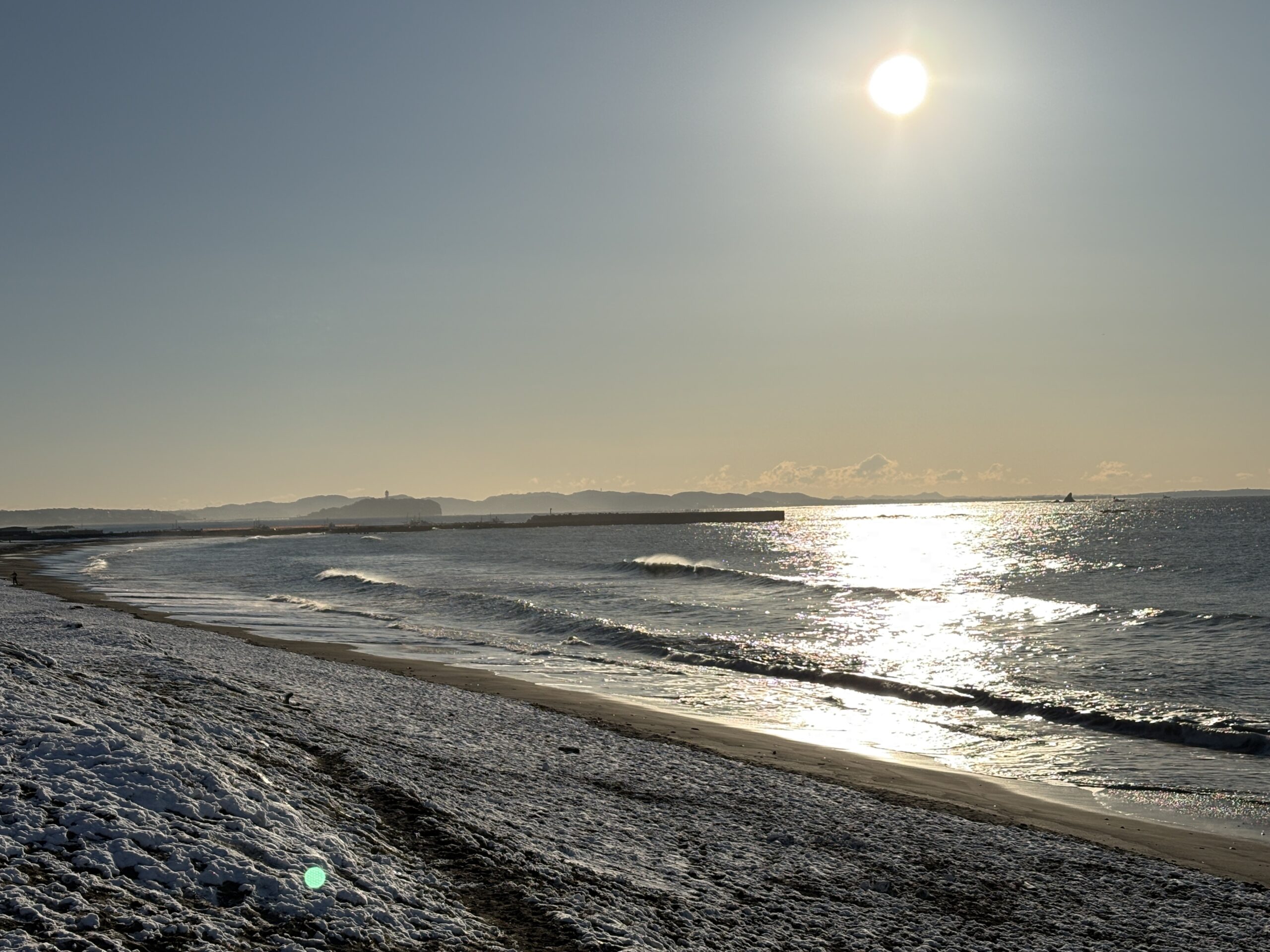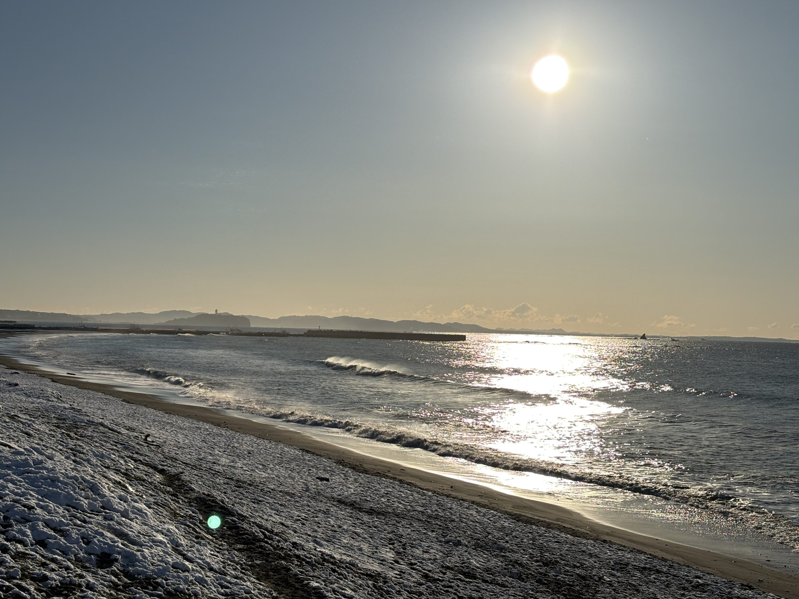 そして海は、昨日の午後にサイズアップしたウネリが若干残り、筋張ったモモから腰近いウネリが入りますが、朝は潮も上げており割れ辛く柳島看板前と西浜スピーカー前のみ沖でブレイクしています。但し厚めのブレイクです。