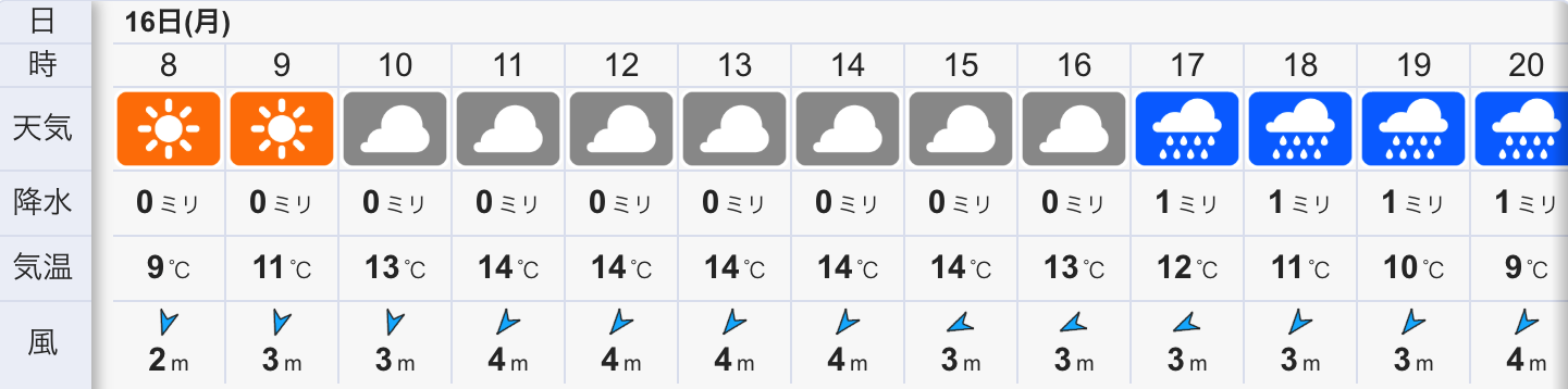今日の天気は晴れのち曇りから雨の予報。