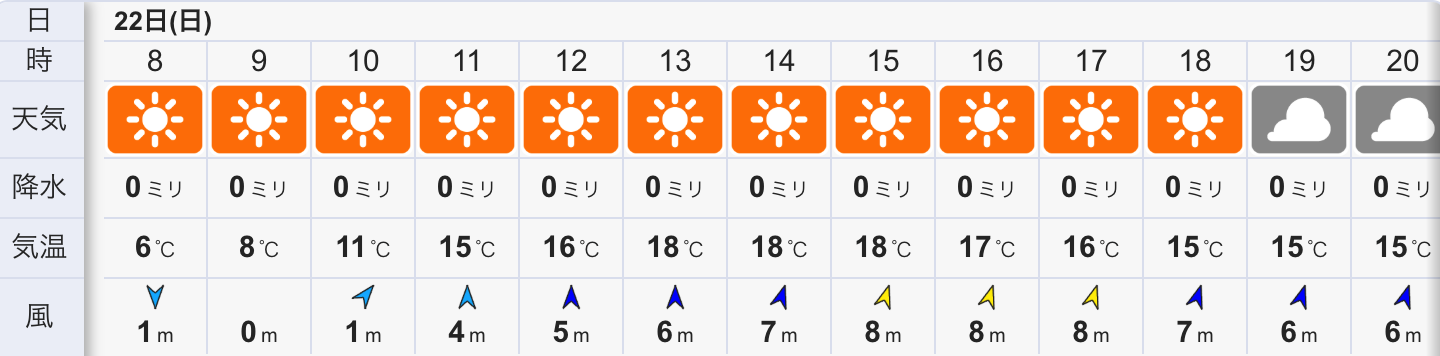 今日の天気は晴れの予報。今朝は風も穏やかなやや暖かい朝です。また、日中は最高気温が18℃前後とポカポカ陽気になりそうです。
