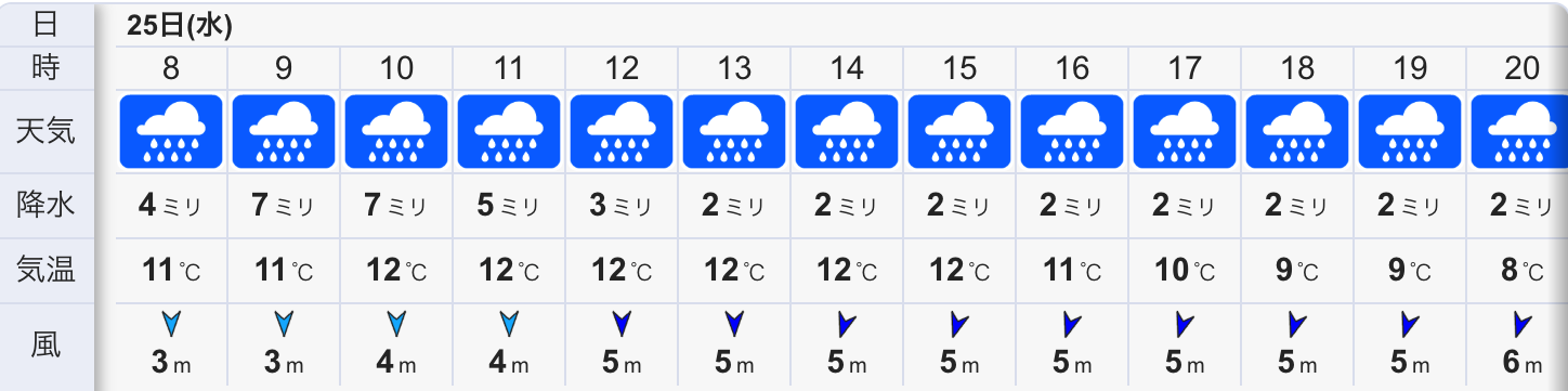 今日の天気は終日雨の予報。今朝は冷たい雨がシトシトと降る肌寒い朝です。
