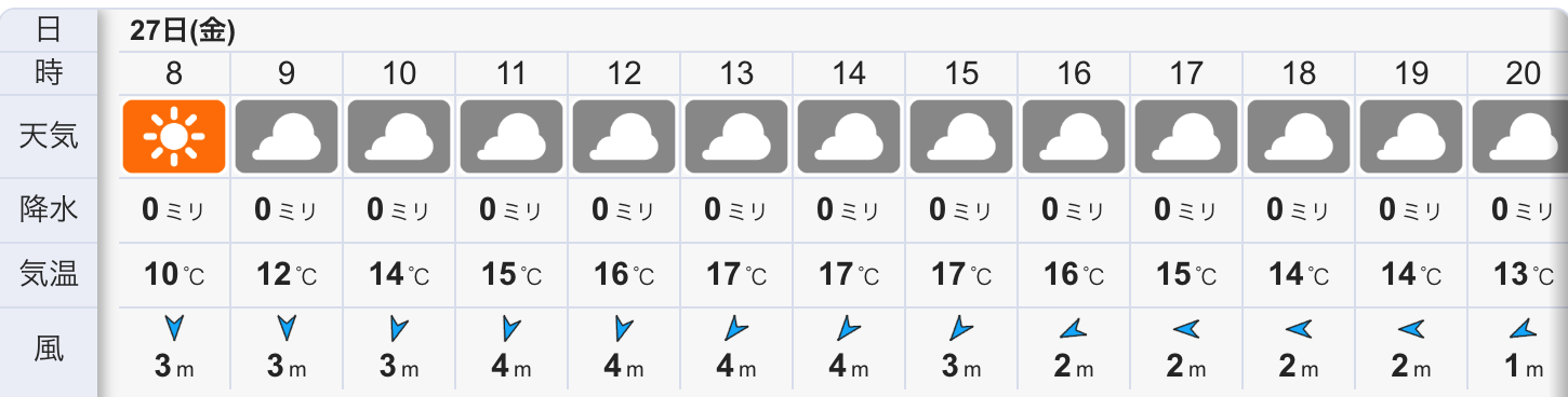 今日の天気は晴れのち曇りの予報。今朝はブルースカイ広がる晴れの冷たい北風でやや冷えた朝です。