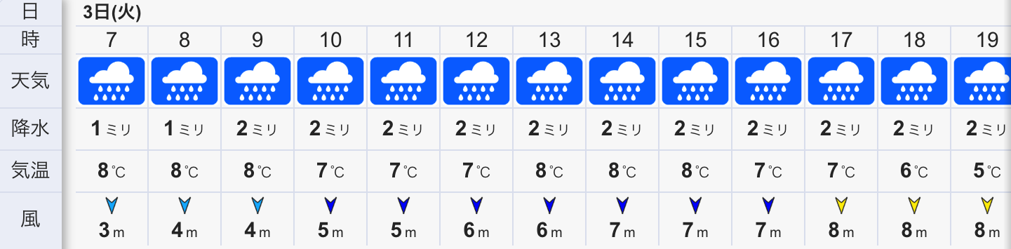 さて、今日の天気は終日雨の予報。今朝は北風と冷たい雨がシトシトと降り冷えた朝です。