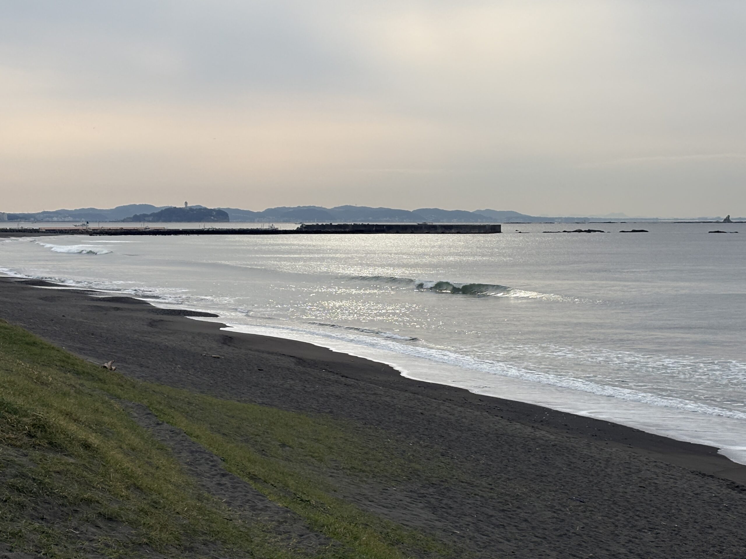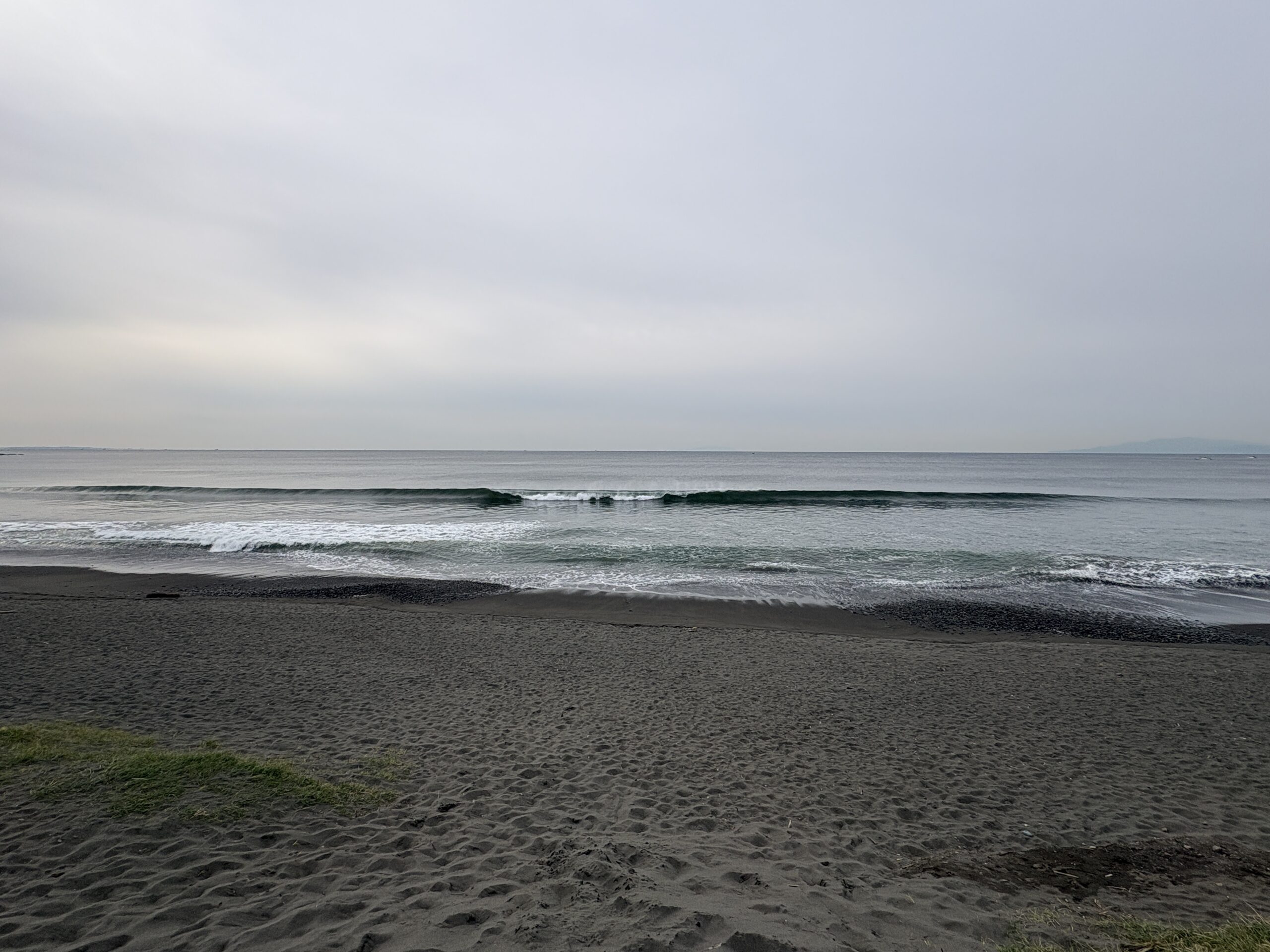 海は筋張った東ウネリが入り出しています。波チェック中の前半は膝からモモ近くの波が地形の良い所で沖でブレイク、他エリアはショアブレイク気味でしたが、帰ろうとしたタイミングで腹前後のセットが入ってきて来ました。但し東ウネリなのでワイドなブレイクです。