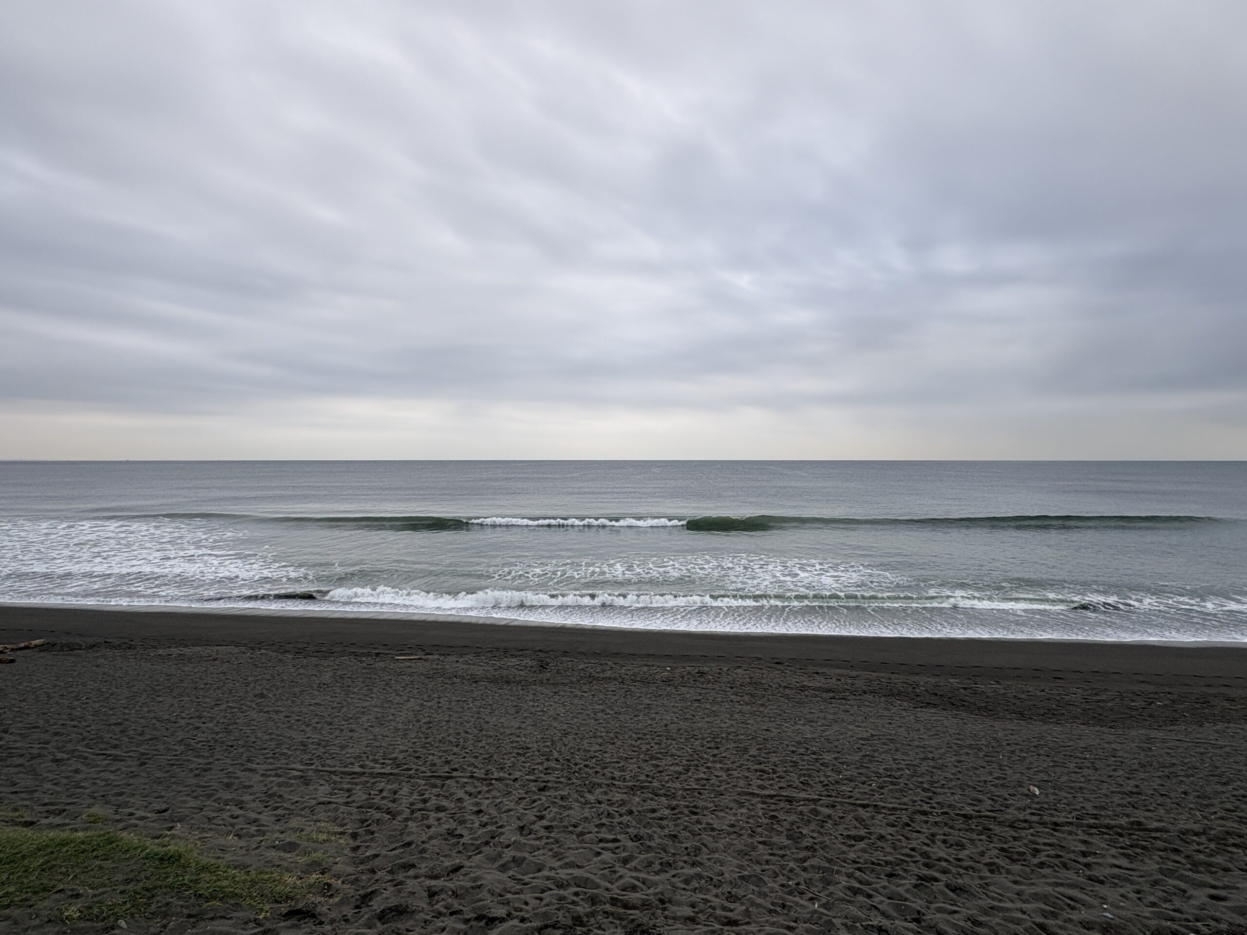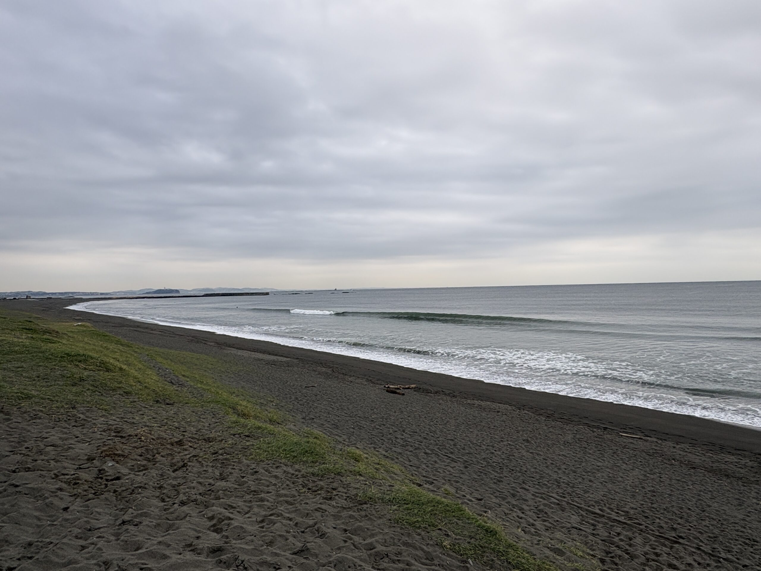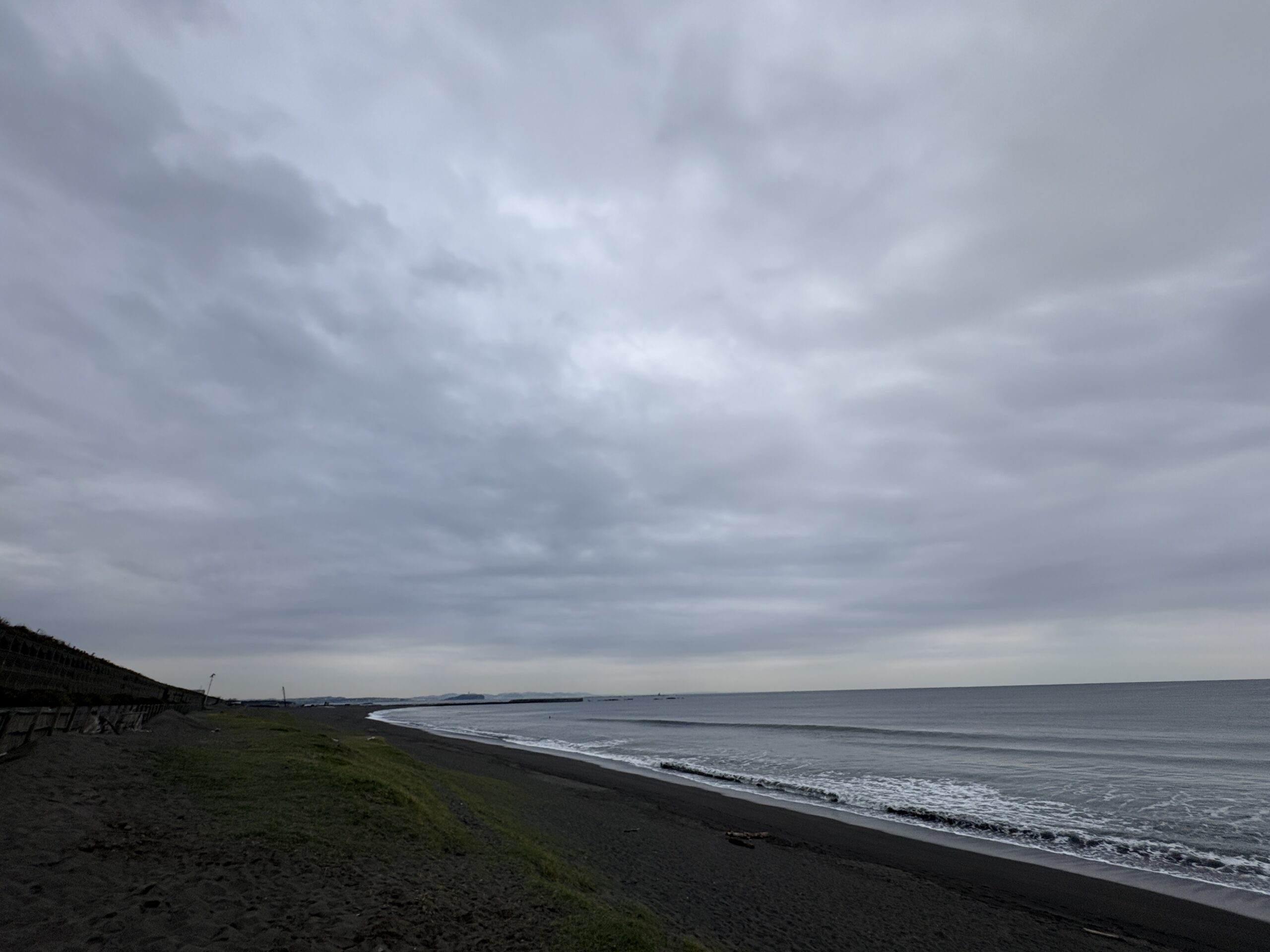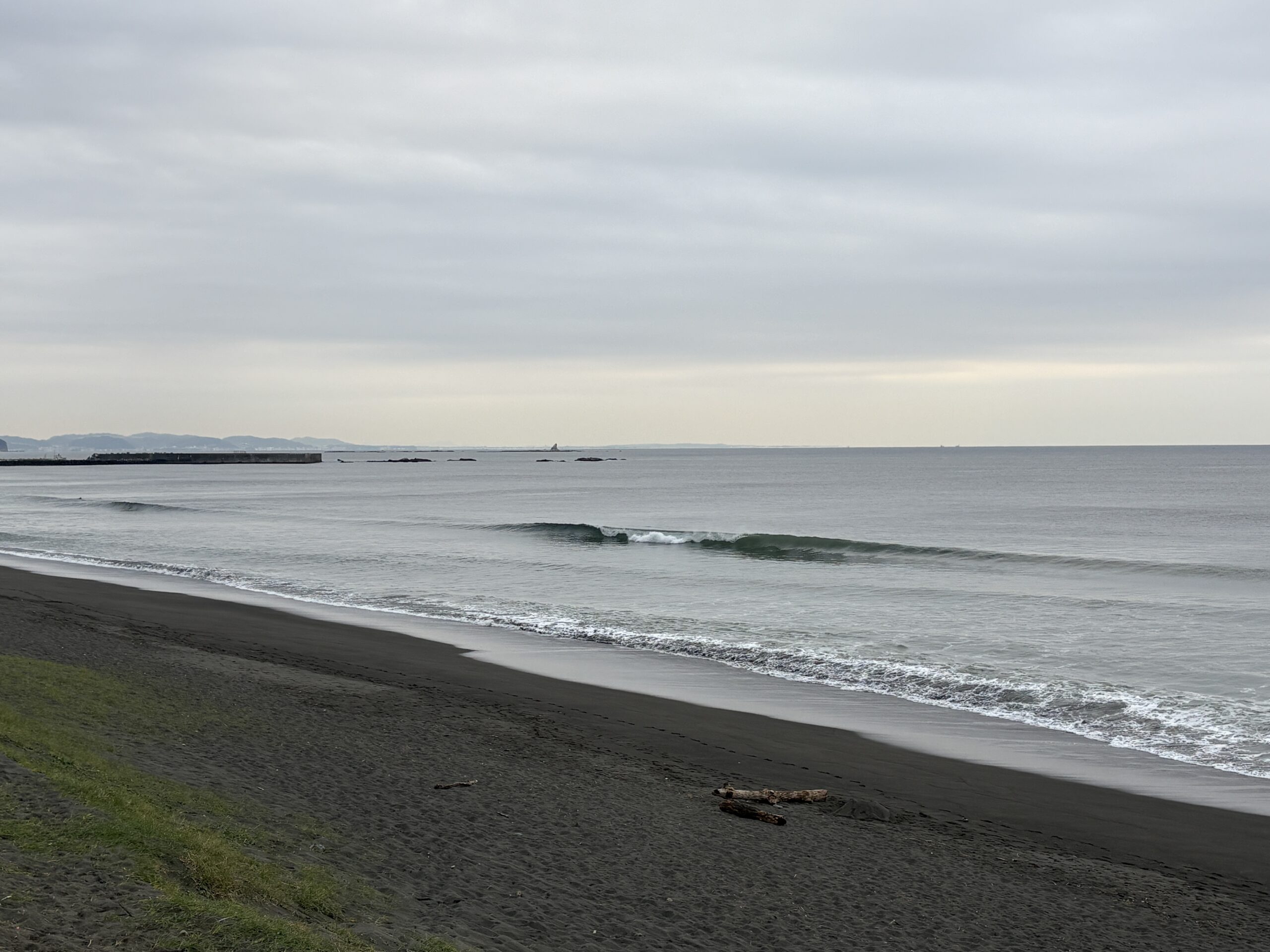 今日の天気は曇りのち晴れ時々曇りの予報。今朝は雨が降りそうな、どんよりとした曇り空でやや肌寒い朝です。海は筋張った膝からモモ近くのウネリが入り、各所でやや力の無さそうな感じで波がブレイクしています。 今日は大潮なので昼前に掛けかなり引くので、小さいながらもテイクオフできるくらいの波はありそうです?!
