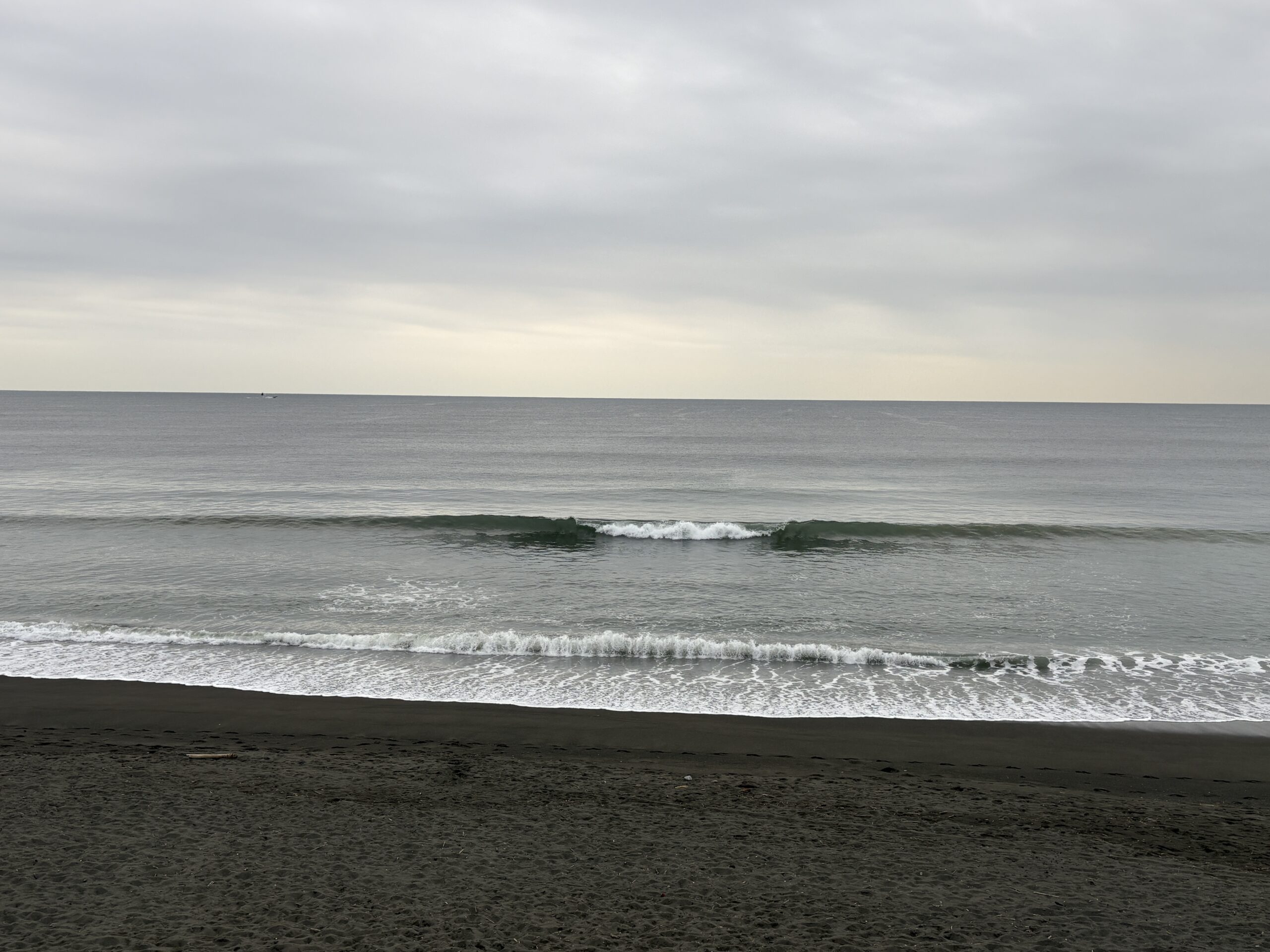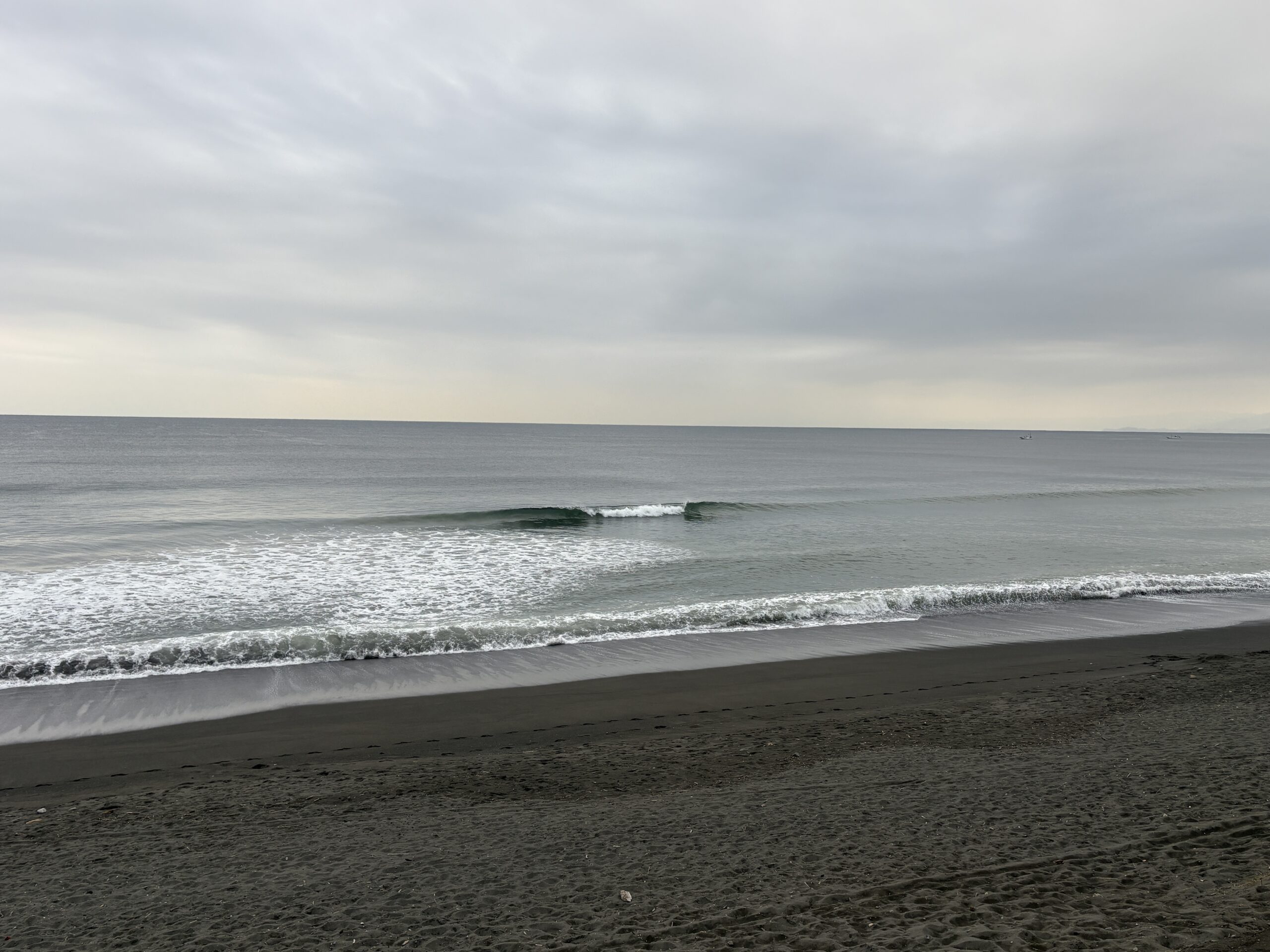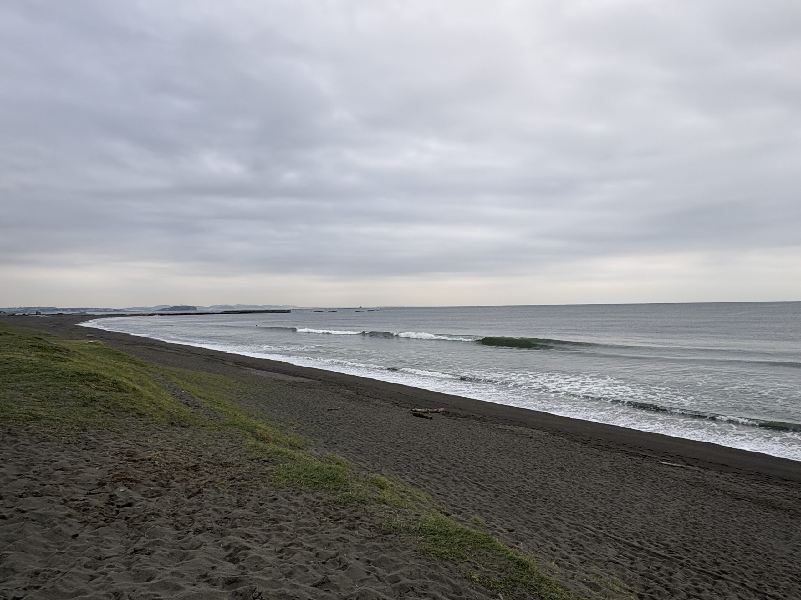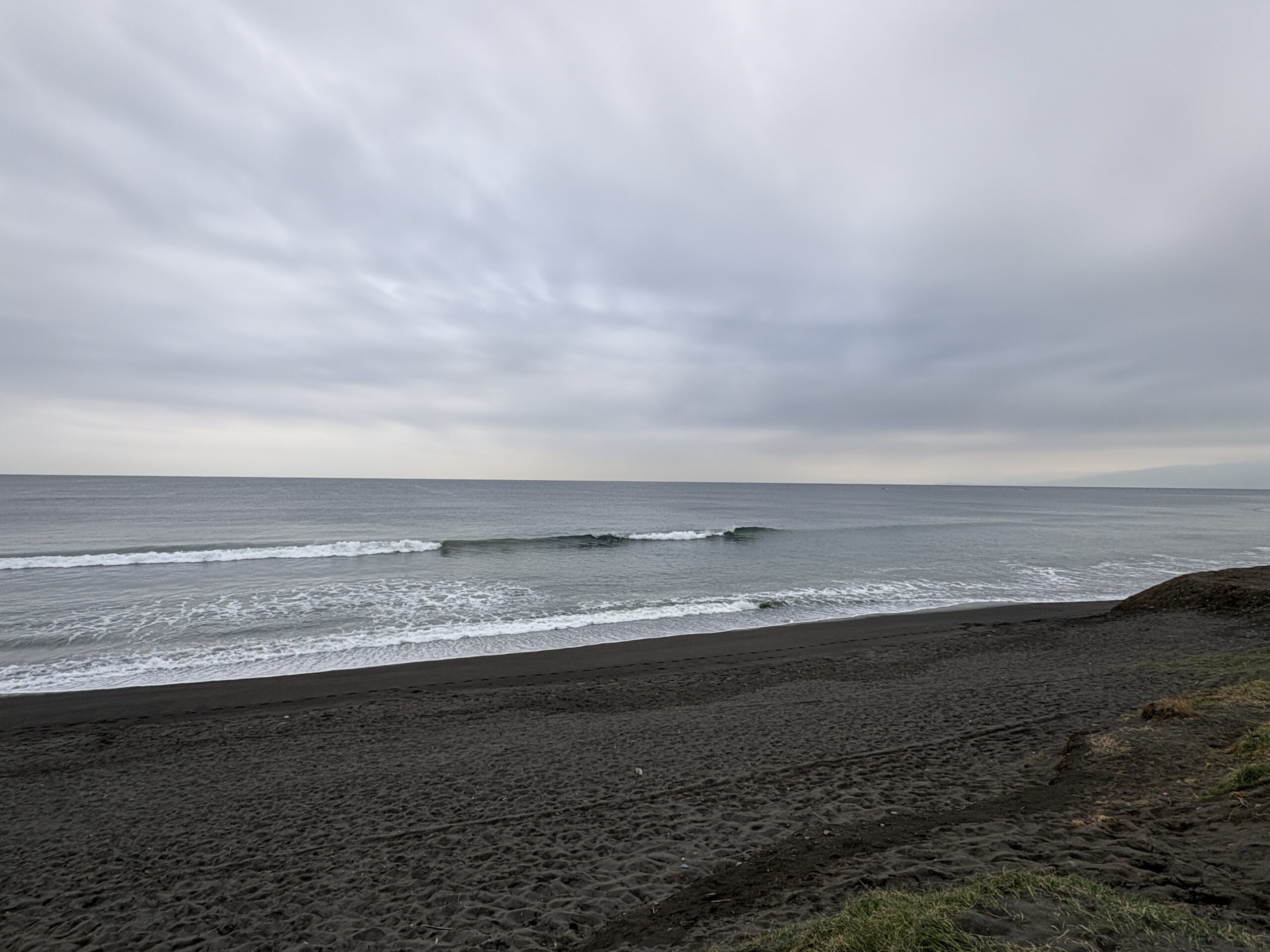 今日の天気は曇りのち晴れ時々曇りの予報。今朝は雨が降りそうな、どんよりとした曇り空でやや肌寒い朝です。海は筋張った膝からモモ近くのウネリが入り、各所でやや力の無さそうな感じで波がブレイクしています。 今日は大潮なので昼前に掛けかなり引くので、小さいながらもテイクオフできるくらいの波はありそうです?!