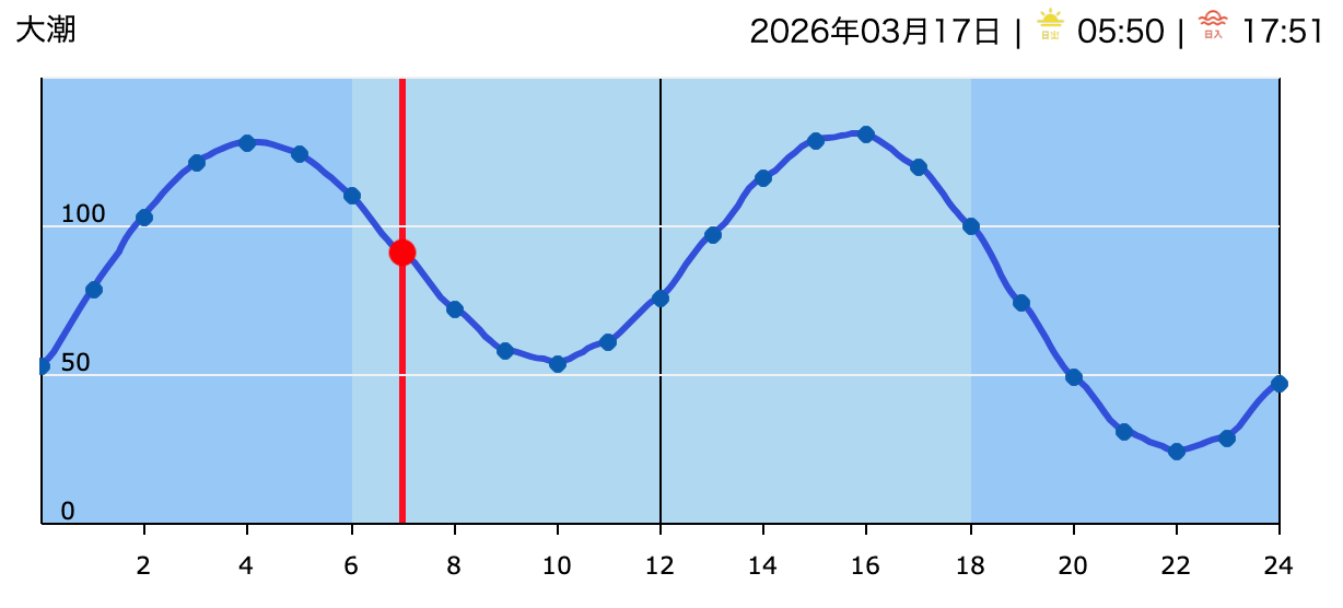 本日のタイドグラフ。風は午前中は穏やかな北寄りで、午後から南風が吹く予想となっています。