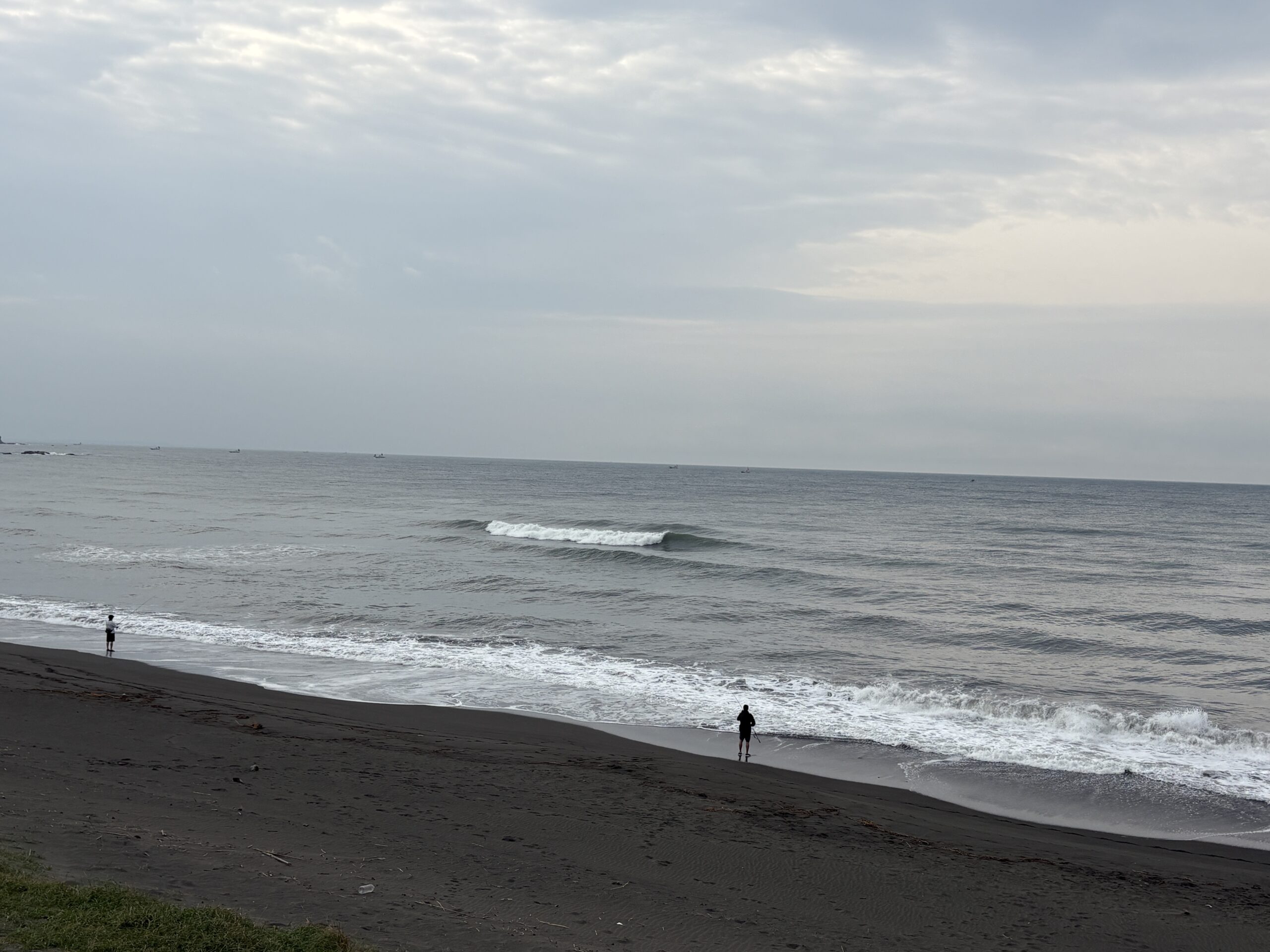 海は緩い北風のオフショアで、昨日吹いた南風に寄り上がったモモ前後のバラつくウネリが入る程度で、サイズも然程上がりませんでした。また、セットは沖でブレイクしますが、地形が今ひとつなのと風波のウネリな為、力の無さそうなブレイクです。