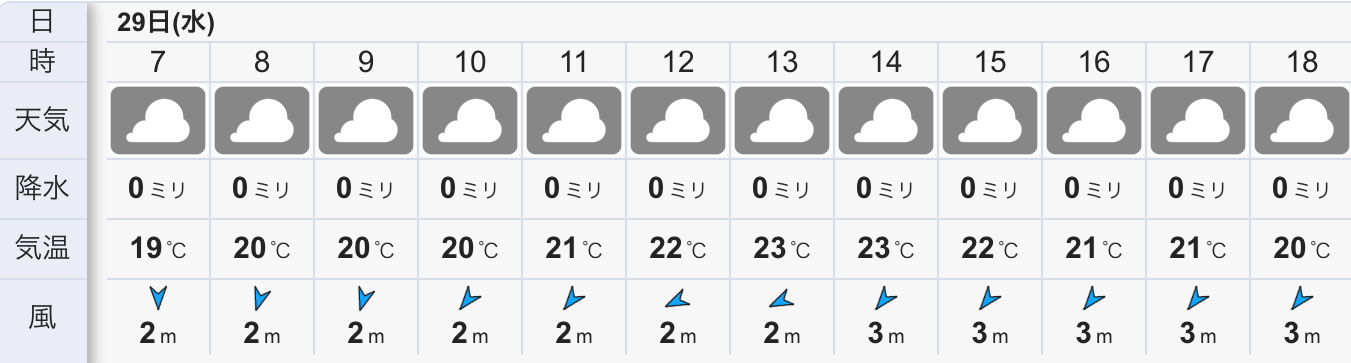 今日の天気は曇りの予報。今朝はどんよりとした曇り空で今の所無風に近い状態です。