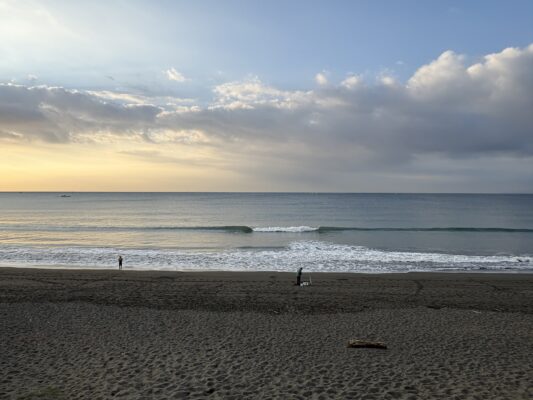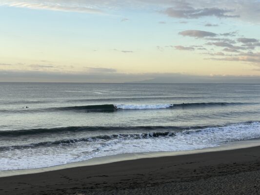 おはようございます。 今日の天気は晴れ時々曇りの予報。今朝は無風の朝日が雲に隠れていて後に晴れて来そうで、空気がやや冷えた朝となっています。海は今日もウネリが残り、腰から胸前後の綺麗なウネリが入り、朝イチは潮も若干引いて [...] [...]