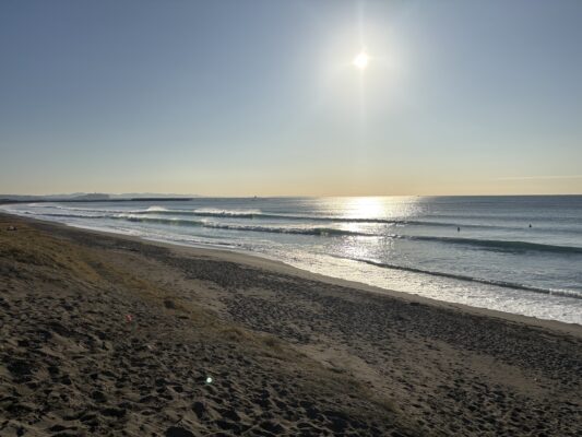 おはようございます。 今日の天気は晴れ時々曇りの予報。今朝は無風で雲が無くブルースカイの気持ちの良い晴れです。海は、筋張った膝前後のウネリが入りますが、潮も多くインサイドのショアブレイクに近い状態で、西浜スピーカー前のみ [...] [...]